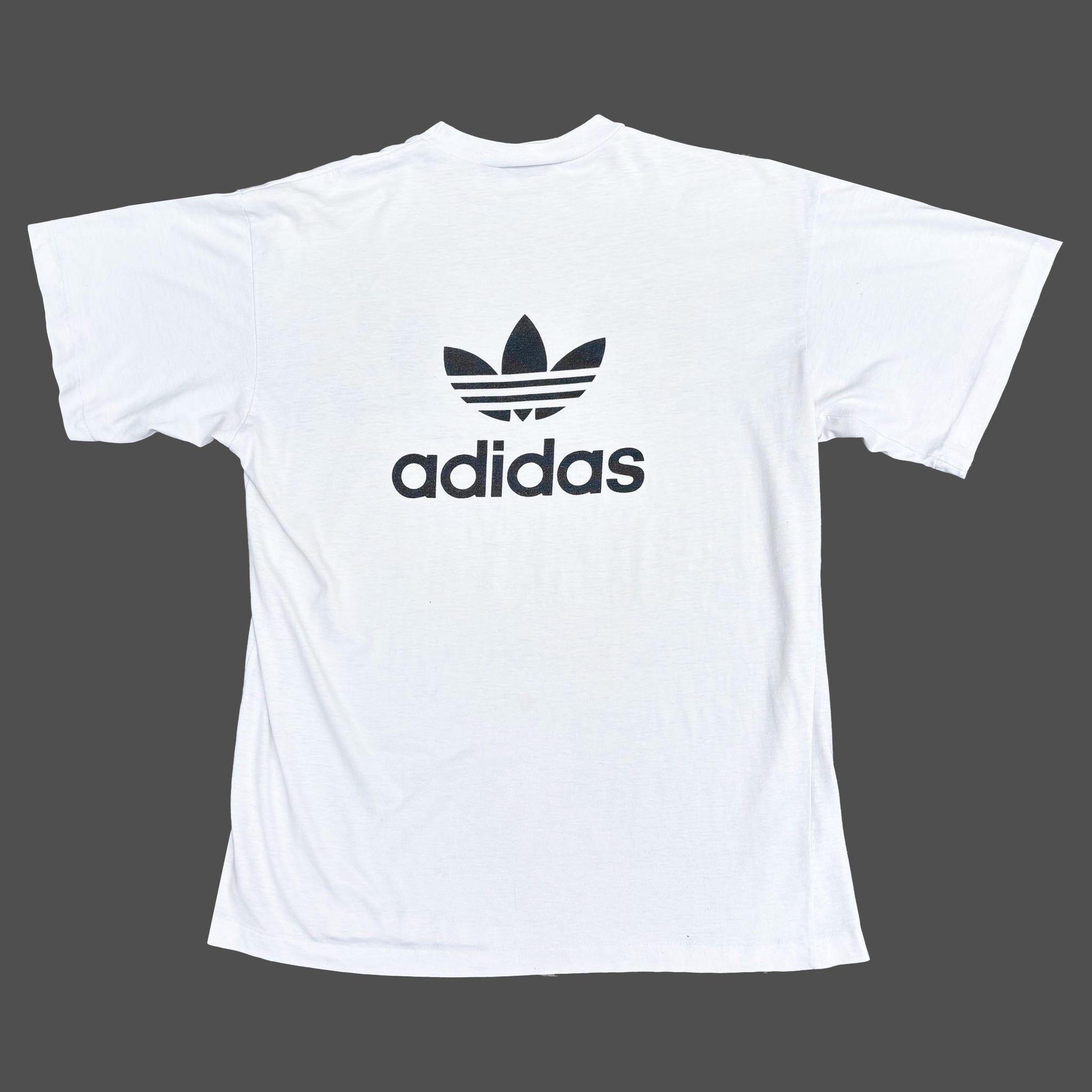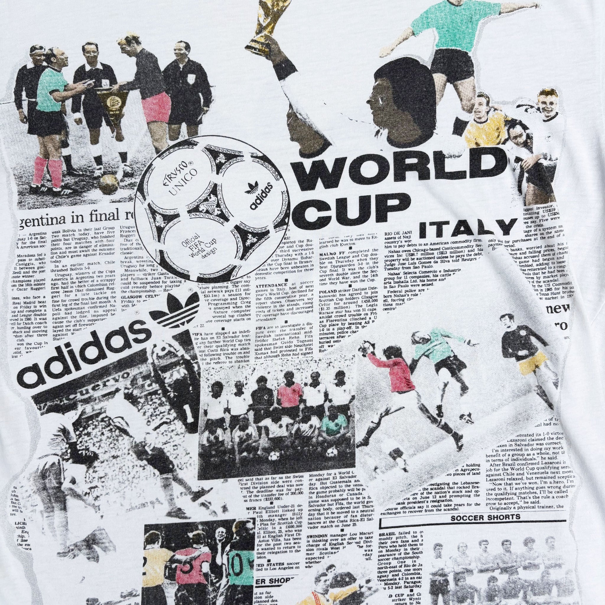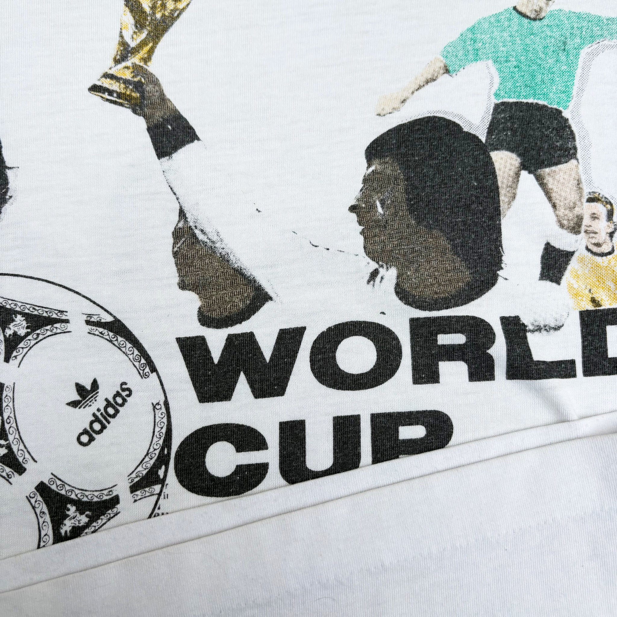 Rare 1990 Adidas, Italy World Cup vintage t-shirt, in soft single stitched white cotton with large football graphic printed on the front and Adidas trefoil logo on the back.