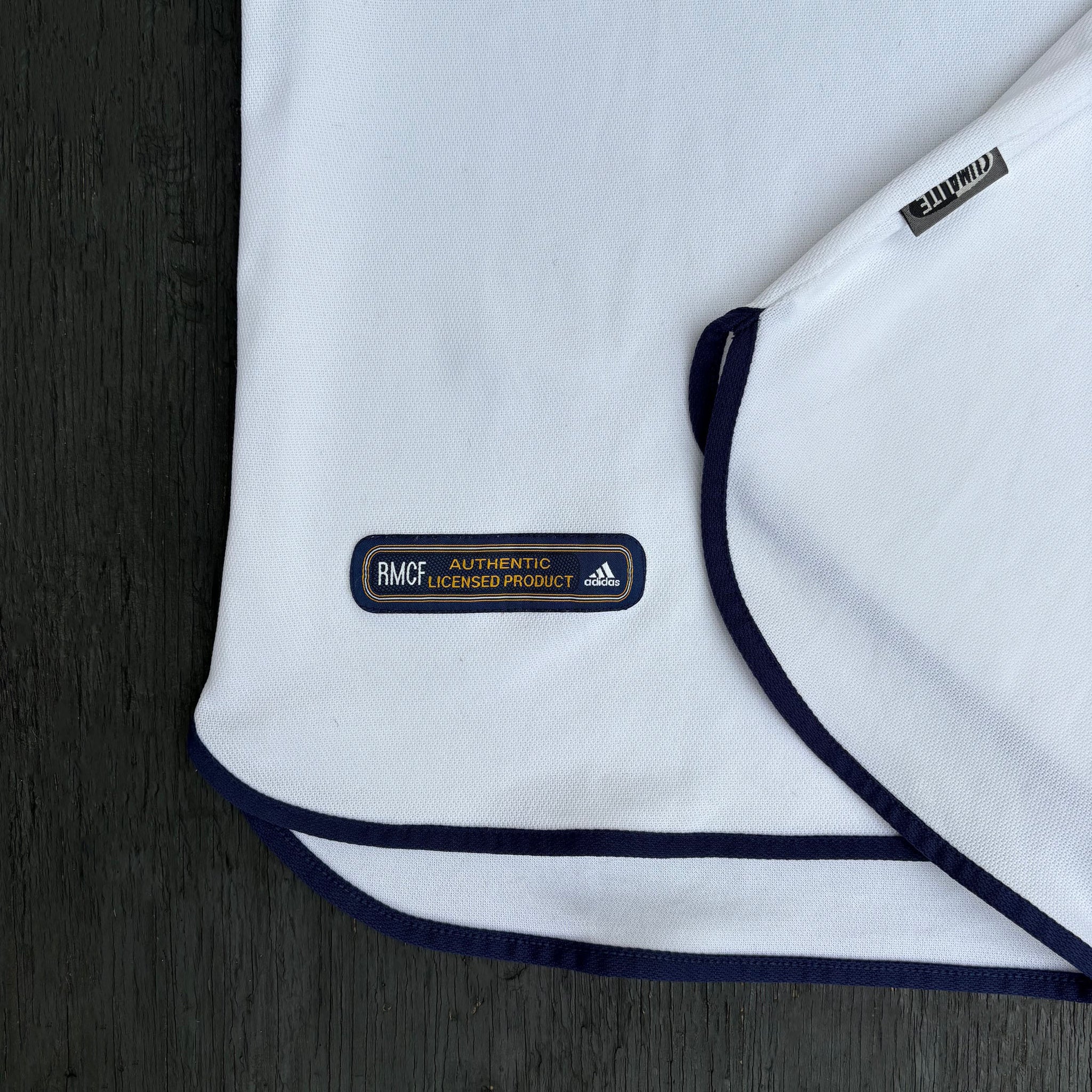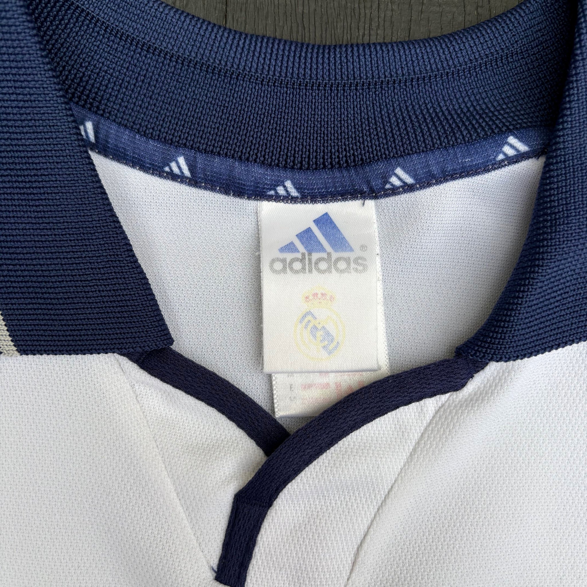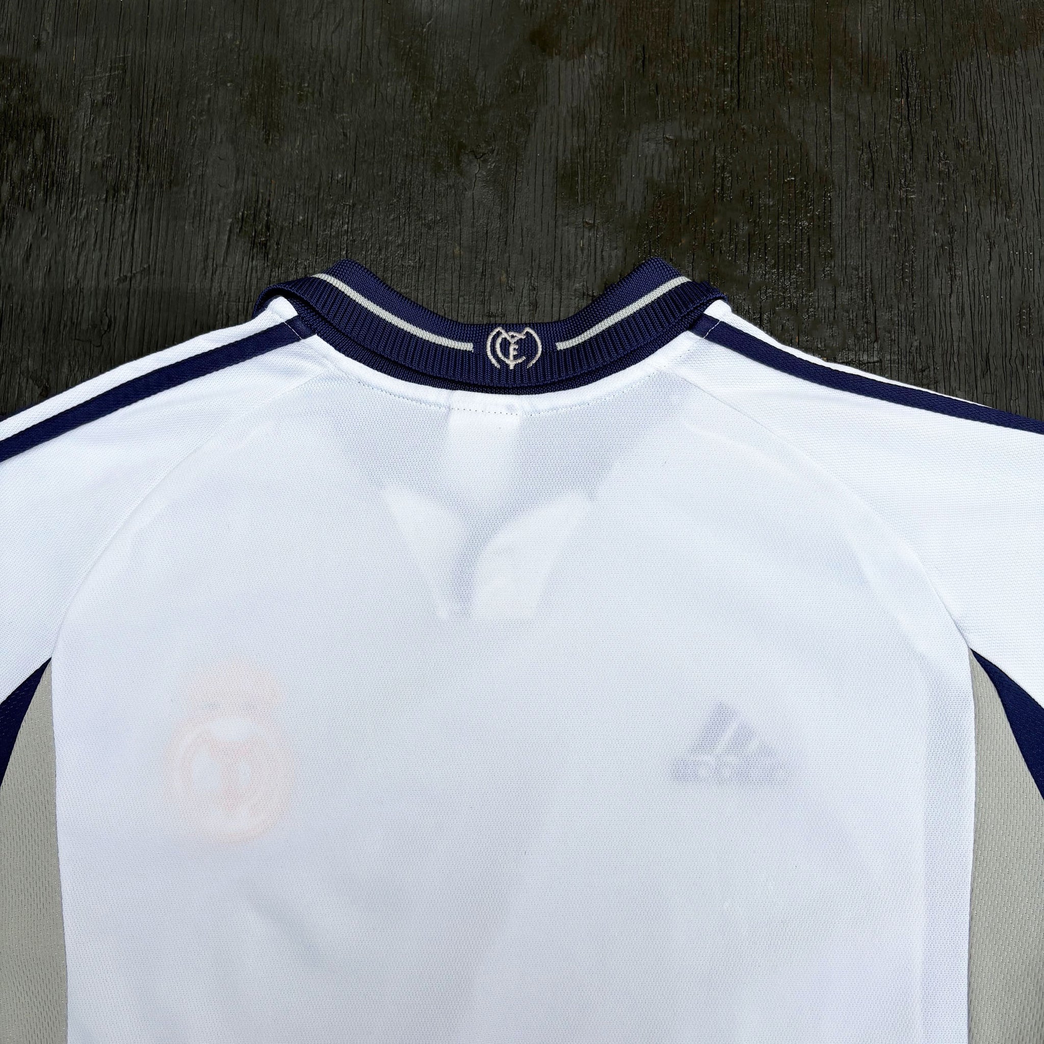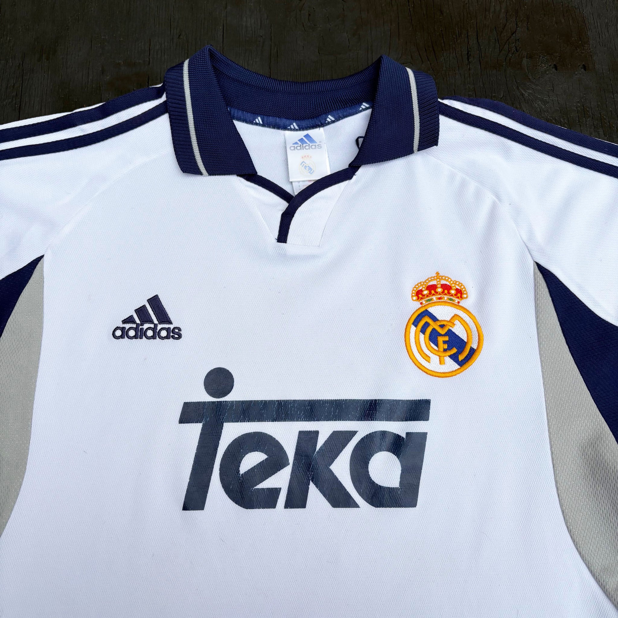 Rare, authentic vintage season 2000/2001 home official Real Madrid kit jersey by Adidas, Roberto Carlos era, in white, navy and grey colors, LFP patch embroidered on the sleeve, short sleeves, beautiful piece with multiple nice details.