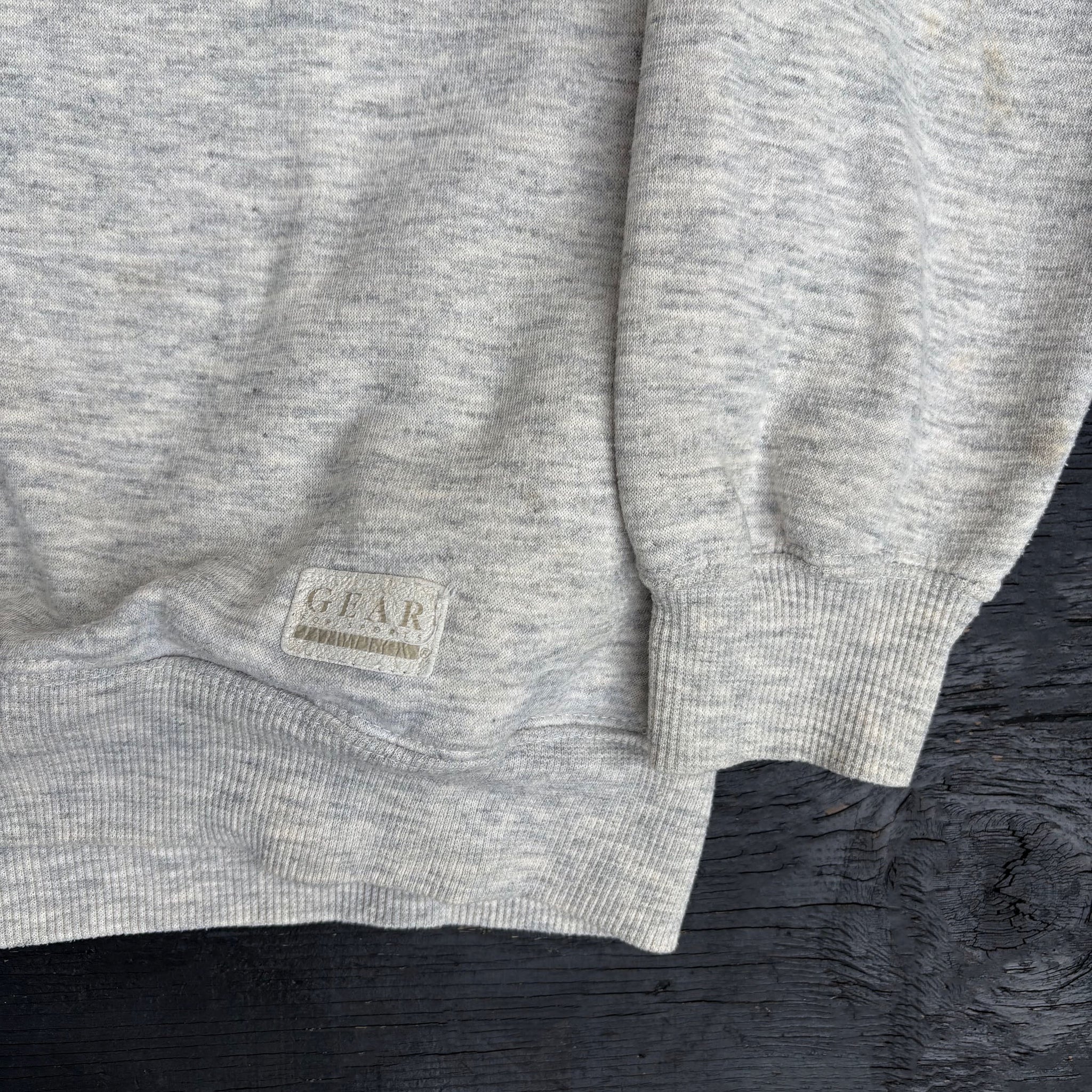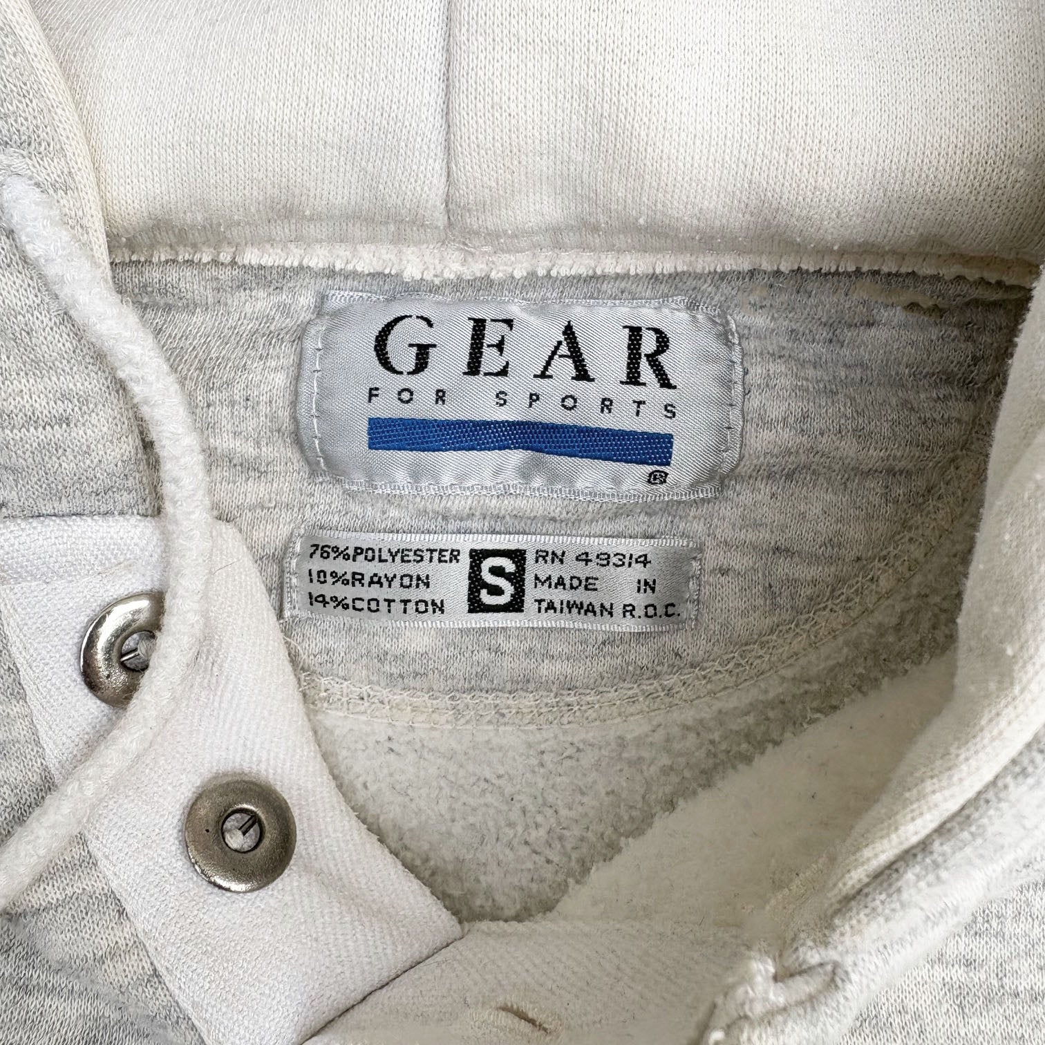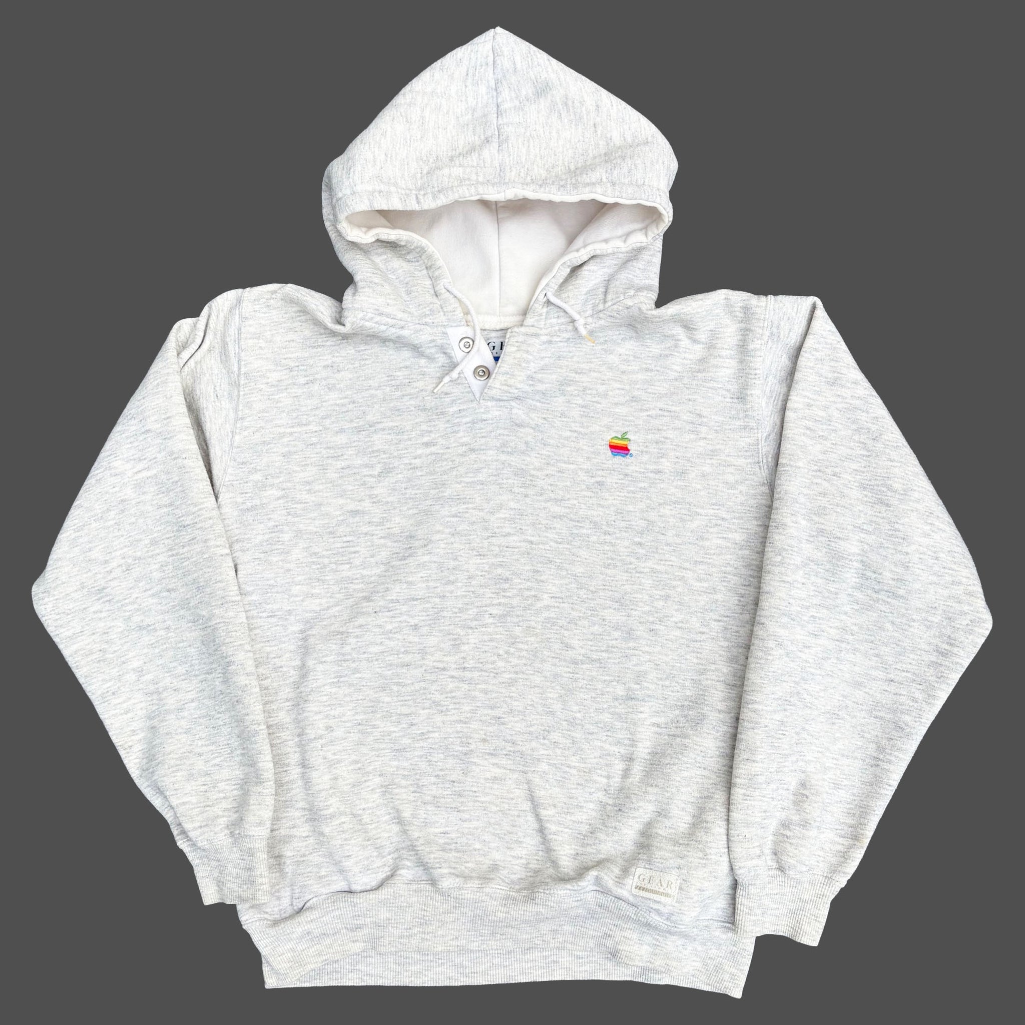 Vintage, early 1990's Apple Computer employees hoodie, in heather grey cotton with classic rainbow logo embroidered on the chest, button collar and adjustable drawstrings.