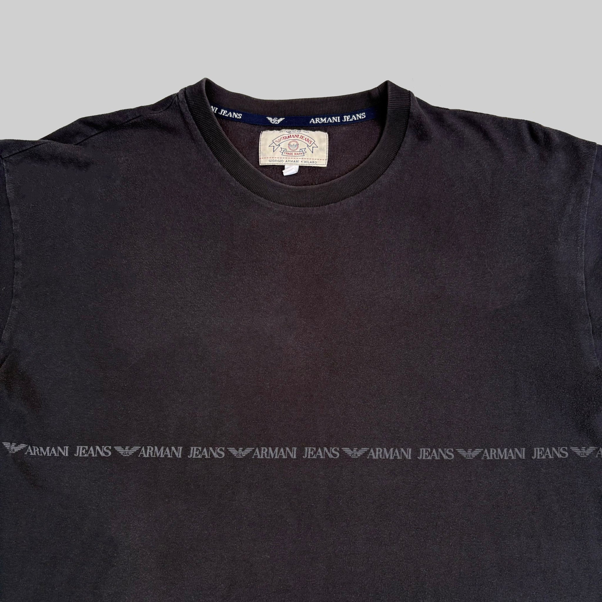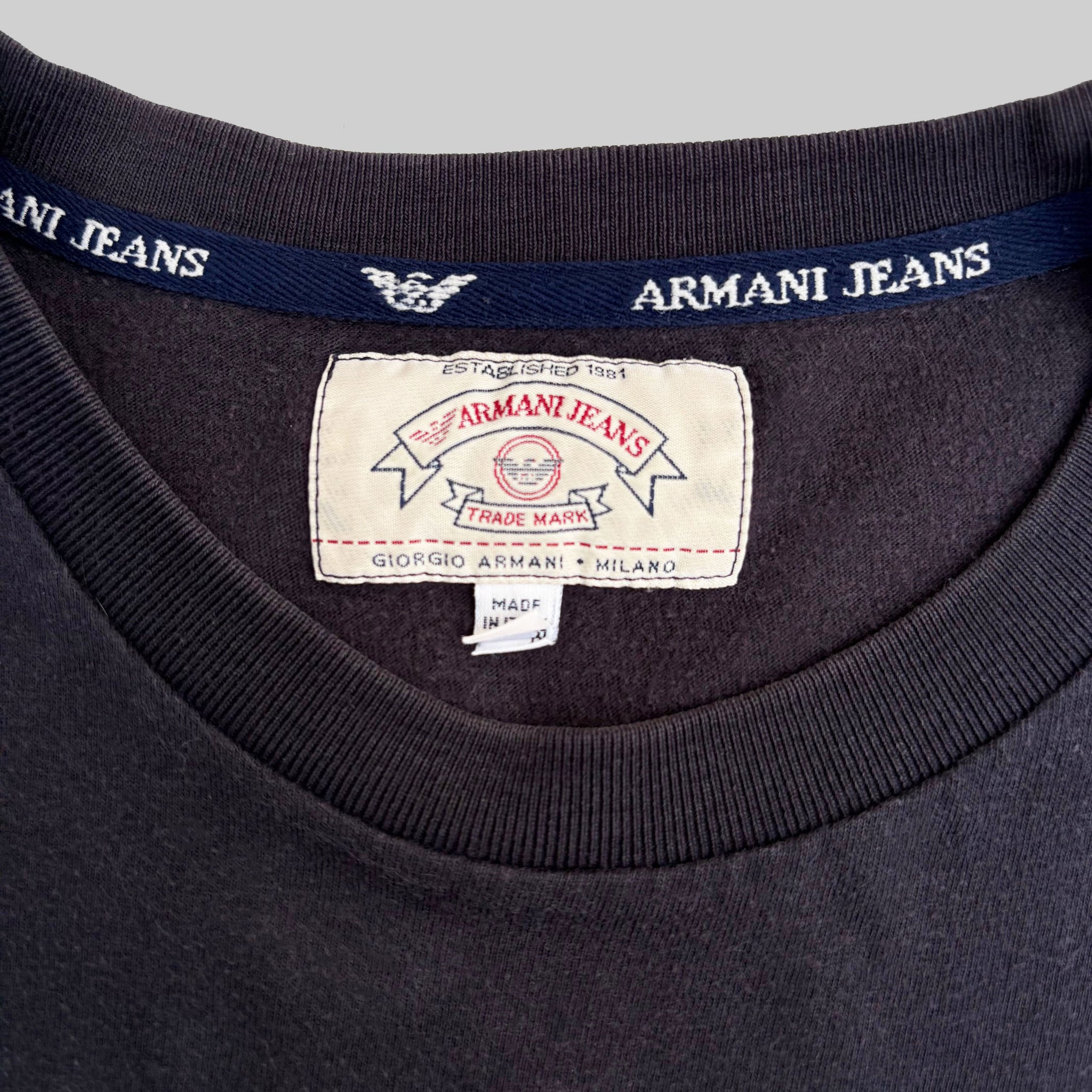 Very rare 1990's vintage Armani Jeans long sleeve t-shirt, in dark navy cotton with silver reflective logos printed on the front along the front, very nice piece. Made in Italy