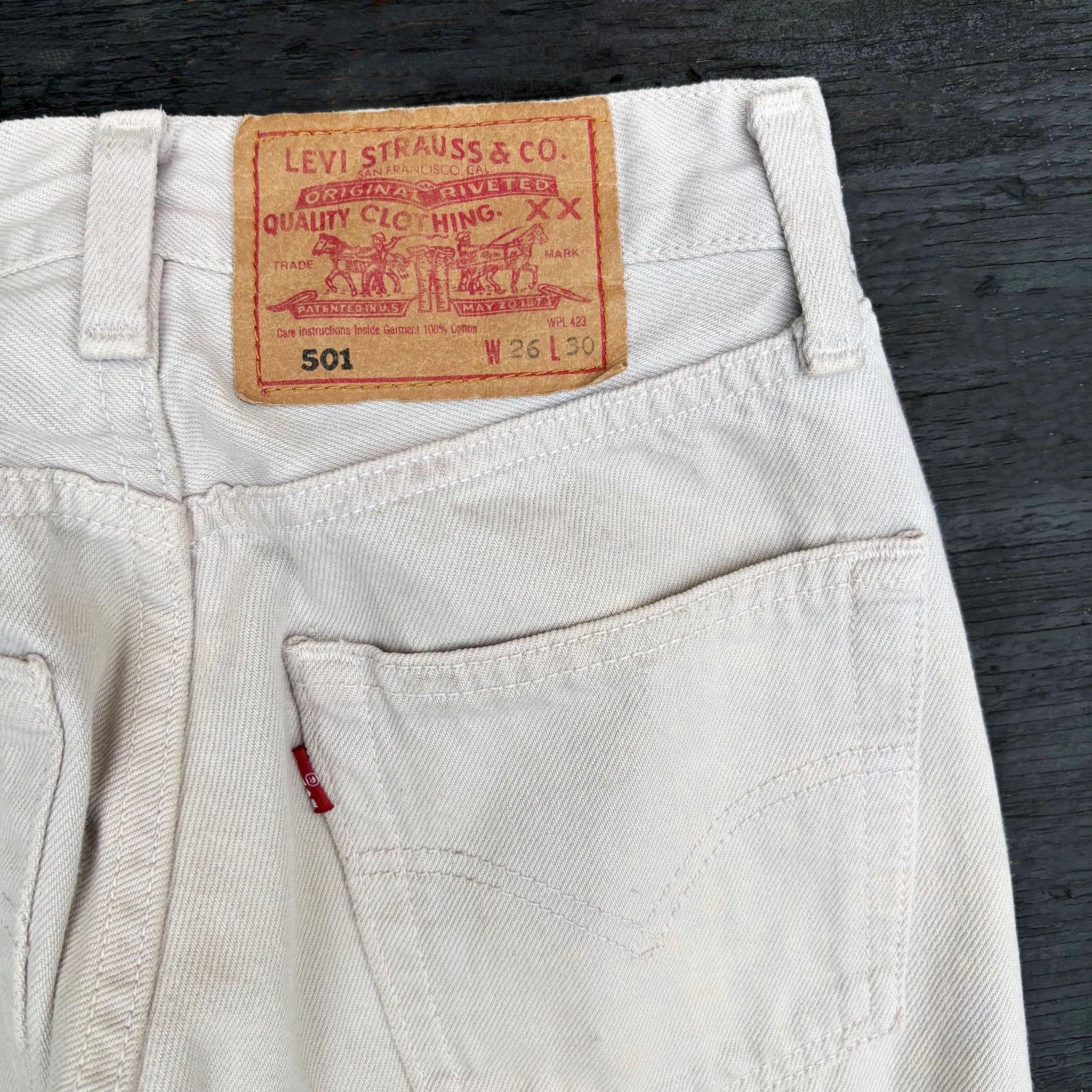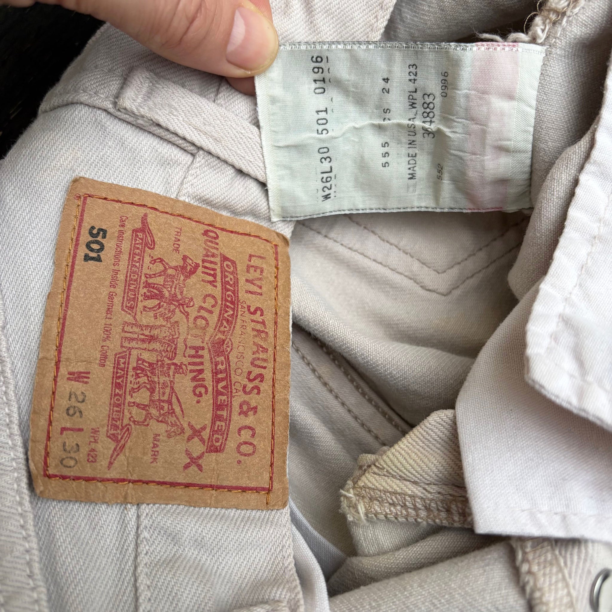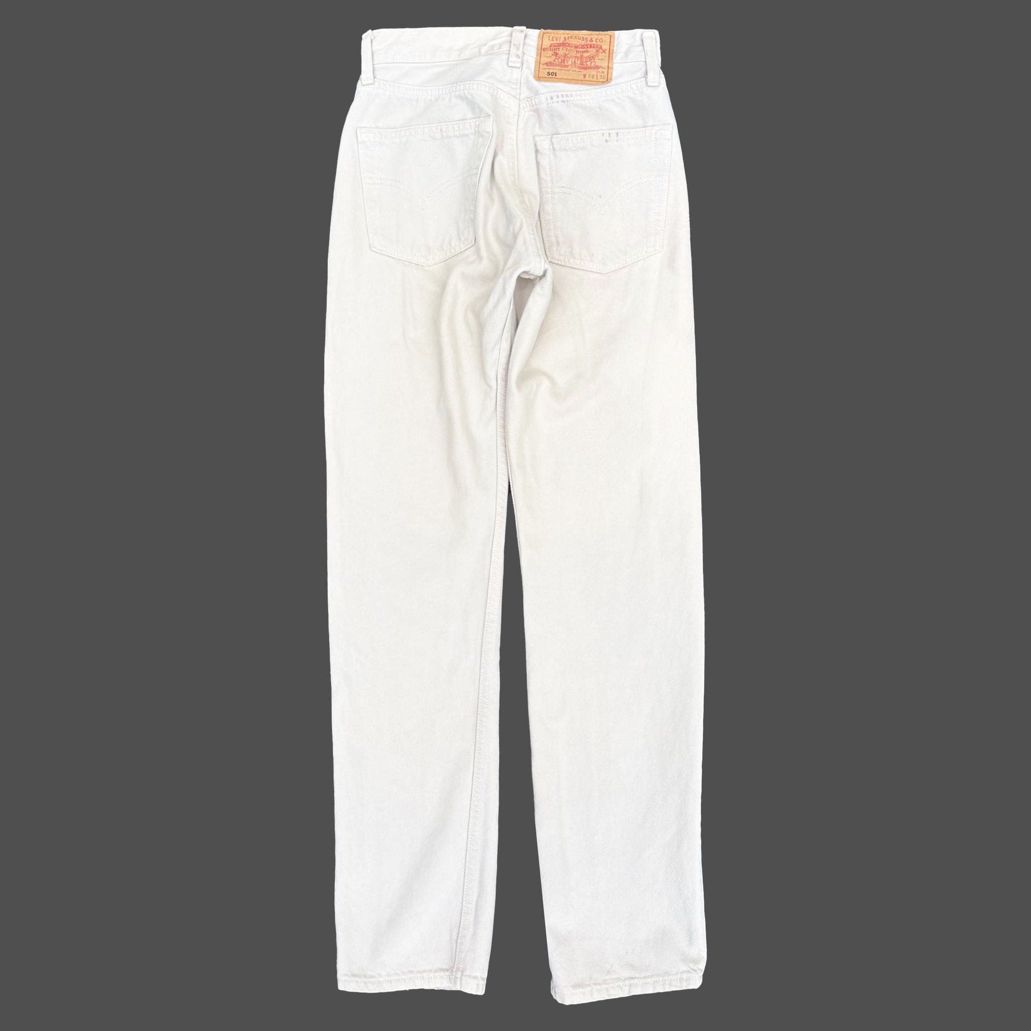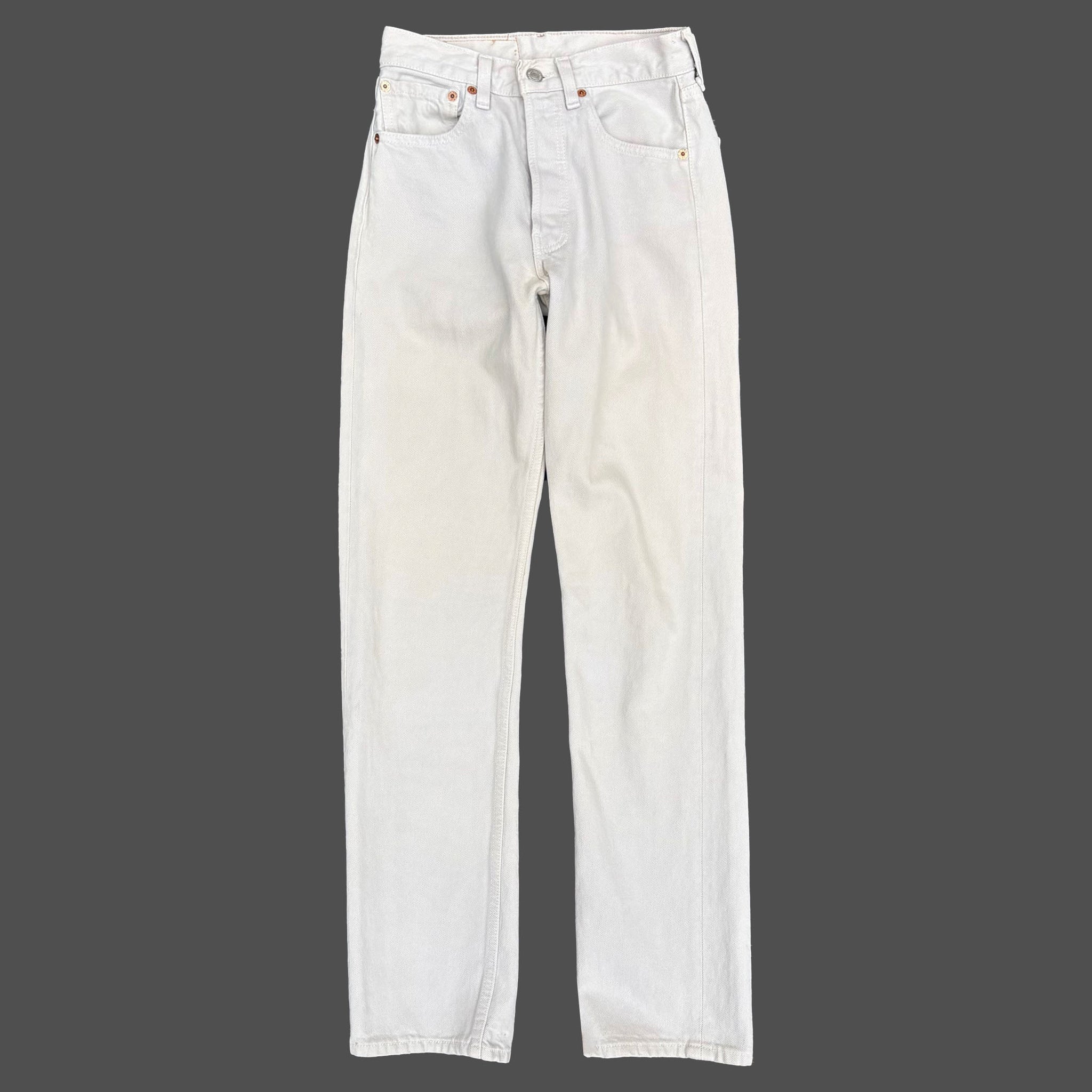 Beautiful vintage pair of early 1990's red tab Levi's 501. Straight fit, light cream grey denim, measured waist 26, length 30, leg opening 7, hip 17, thigh 9, rise 10.