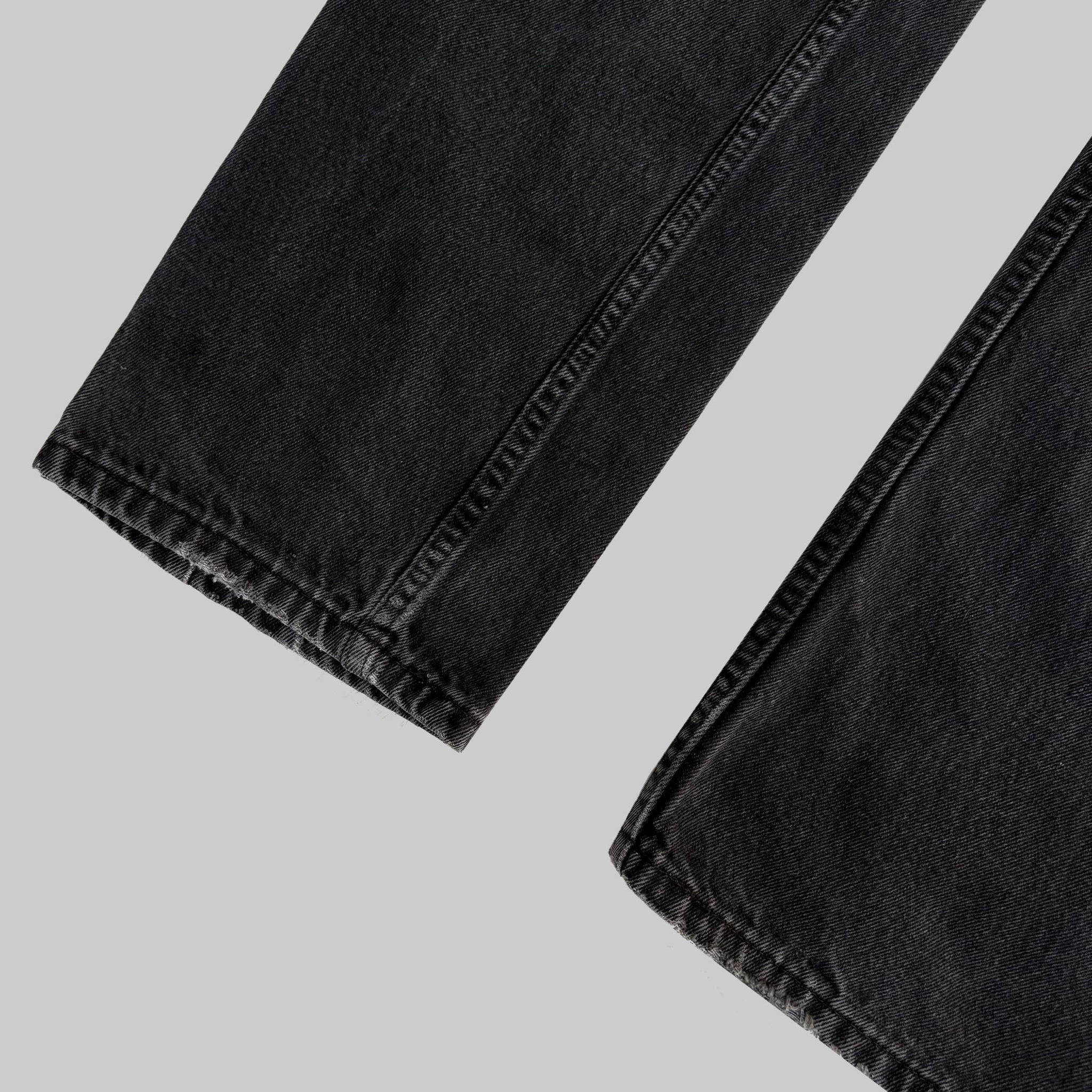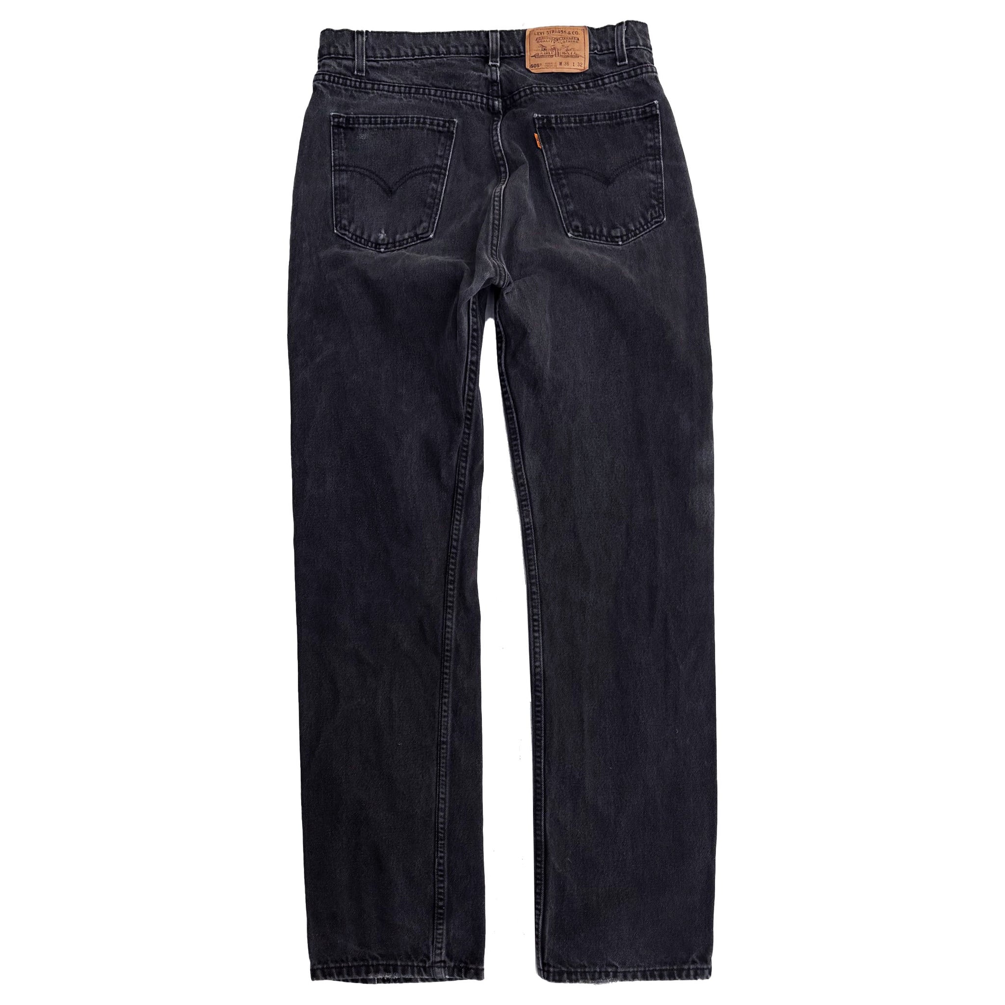 Beautiful vintage pair of 1980's orange tab, black denim Levi's 505. Regular fit, straight leg, measured waist 32 length 32, leg opening 8, hip 22, thigh 8.5, rise 13. Made in USA