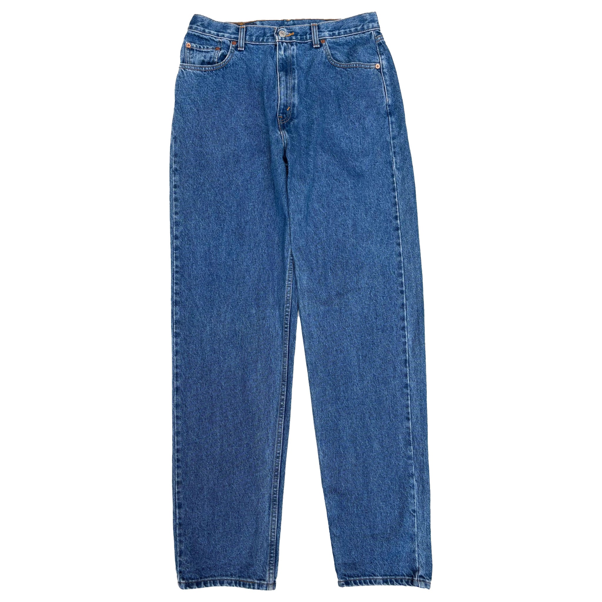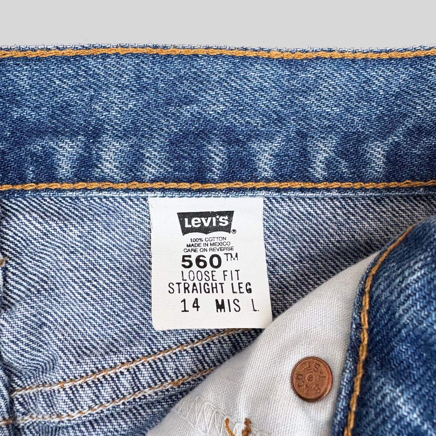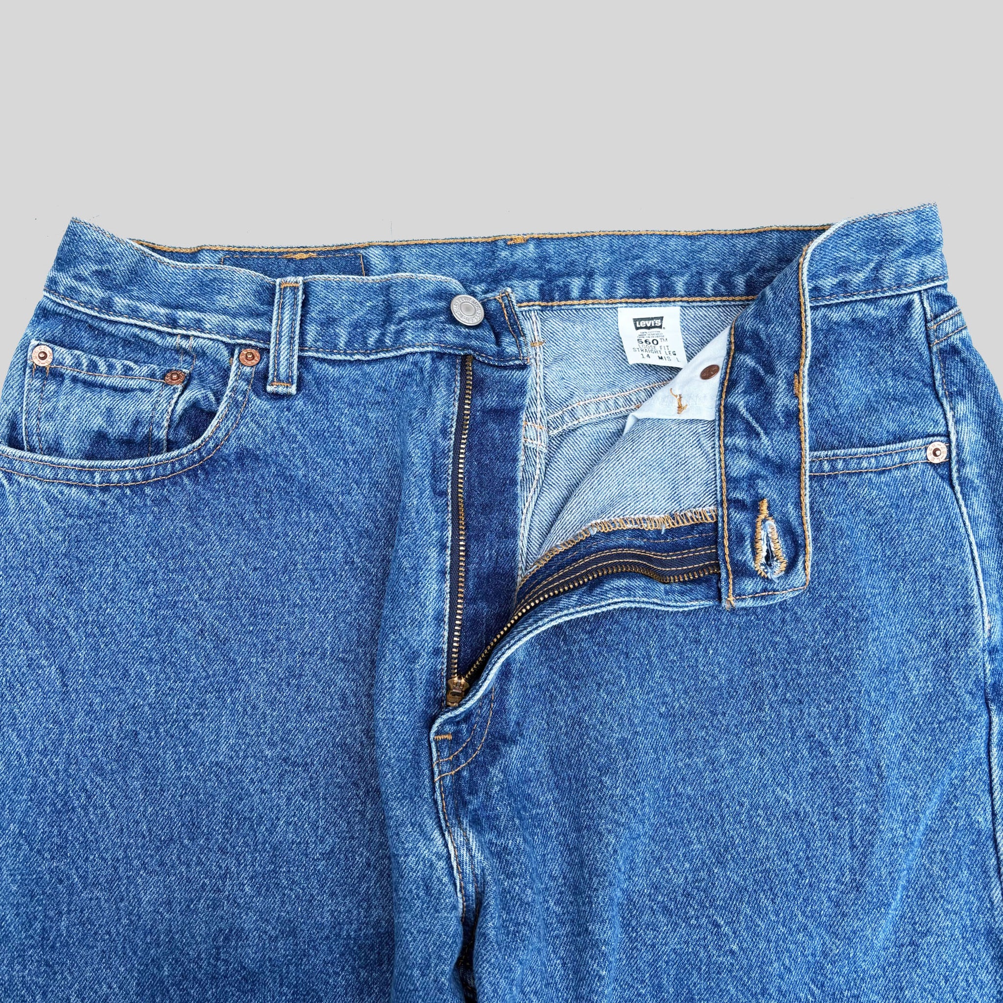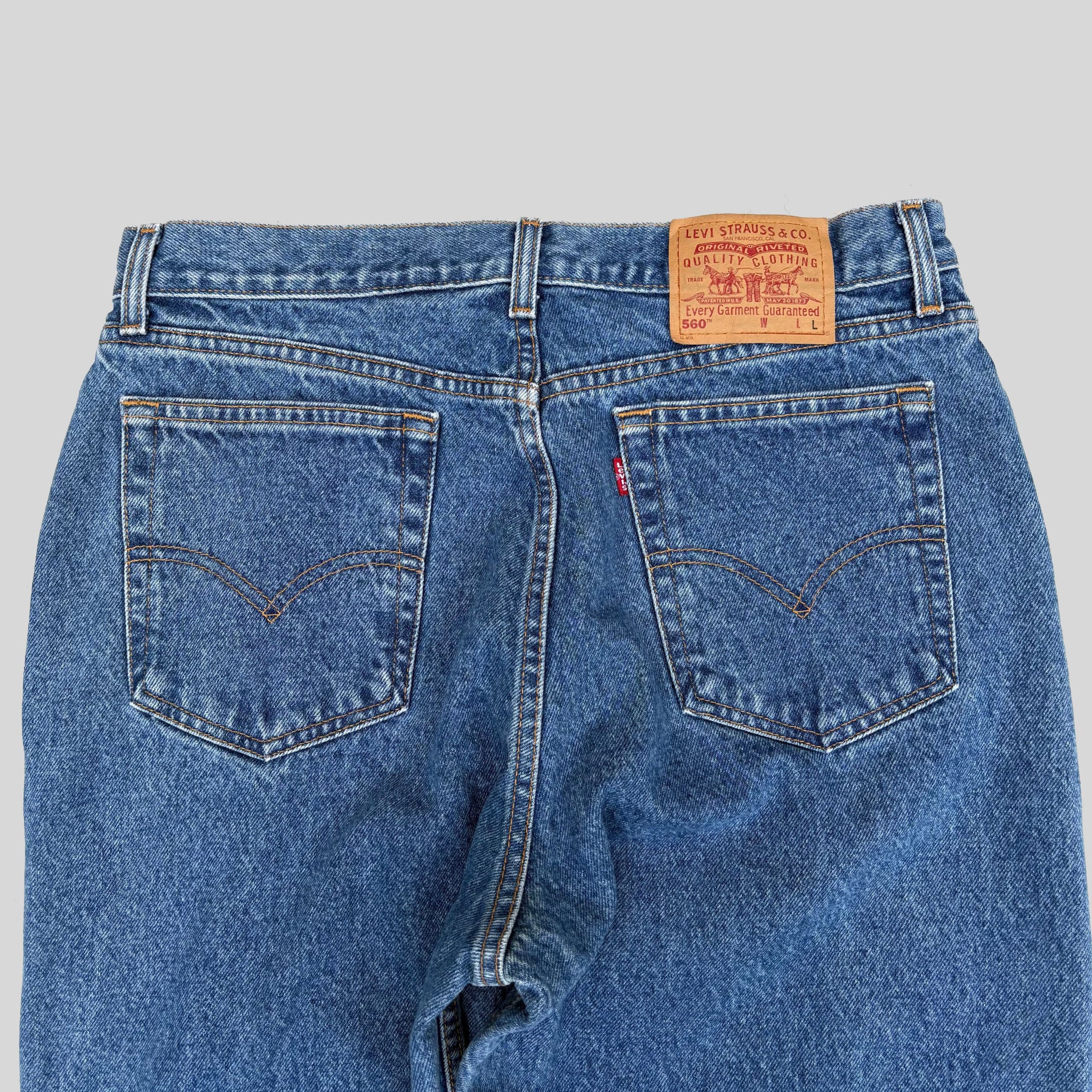 Beautiful vintage pair of 1990's red tab Levi's 560, (similar to 569). Loose fit, straight leg, faded blue denim, measured waist 34, length 34, leg opening 8, hip 22, thigh 13, rise 12.