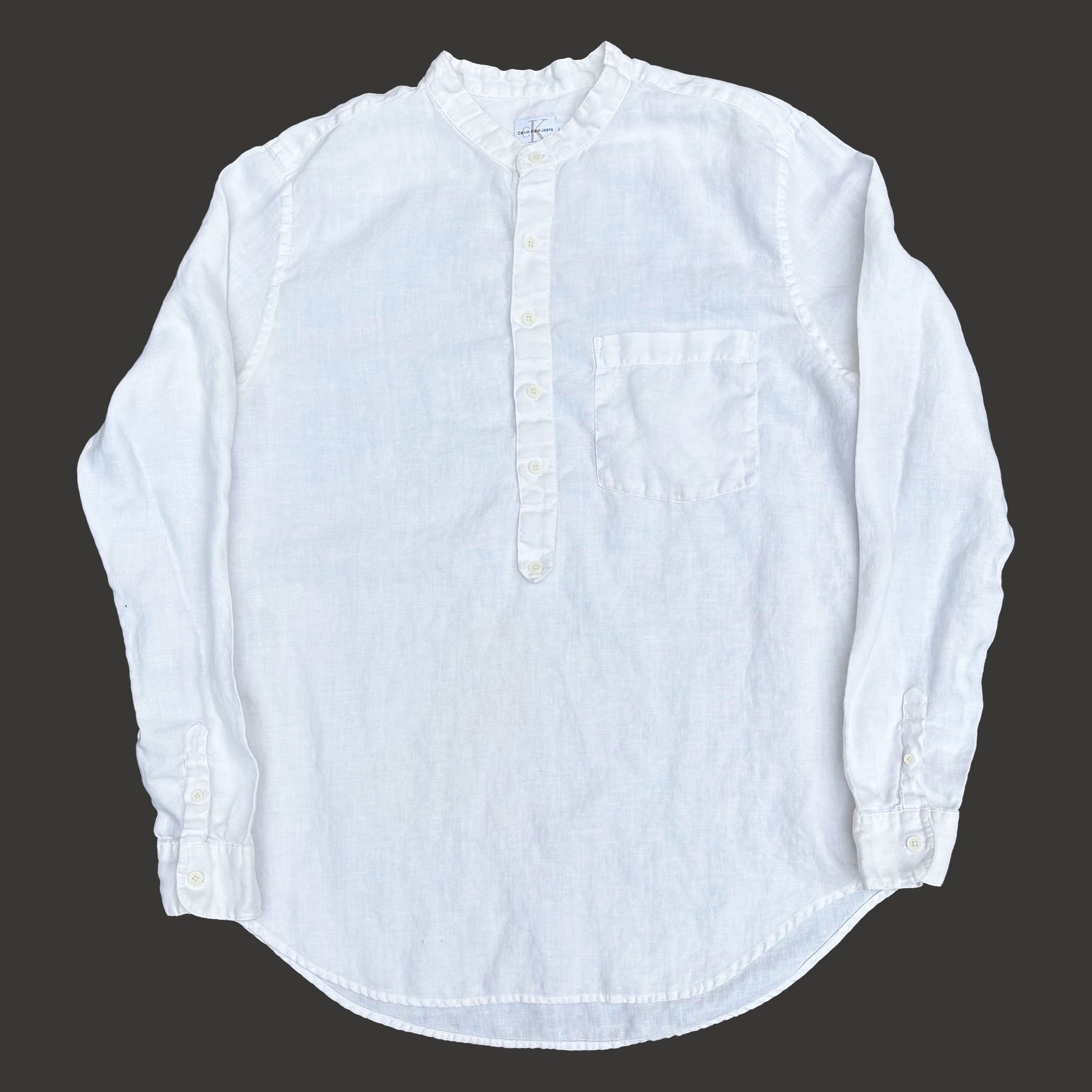 Superb original 1990's Calvin Klein button up vintage long sleeve band collar shirt, in white linen, beautiful details.