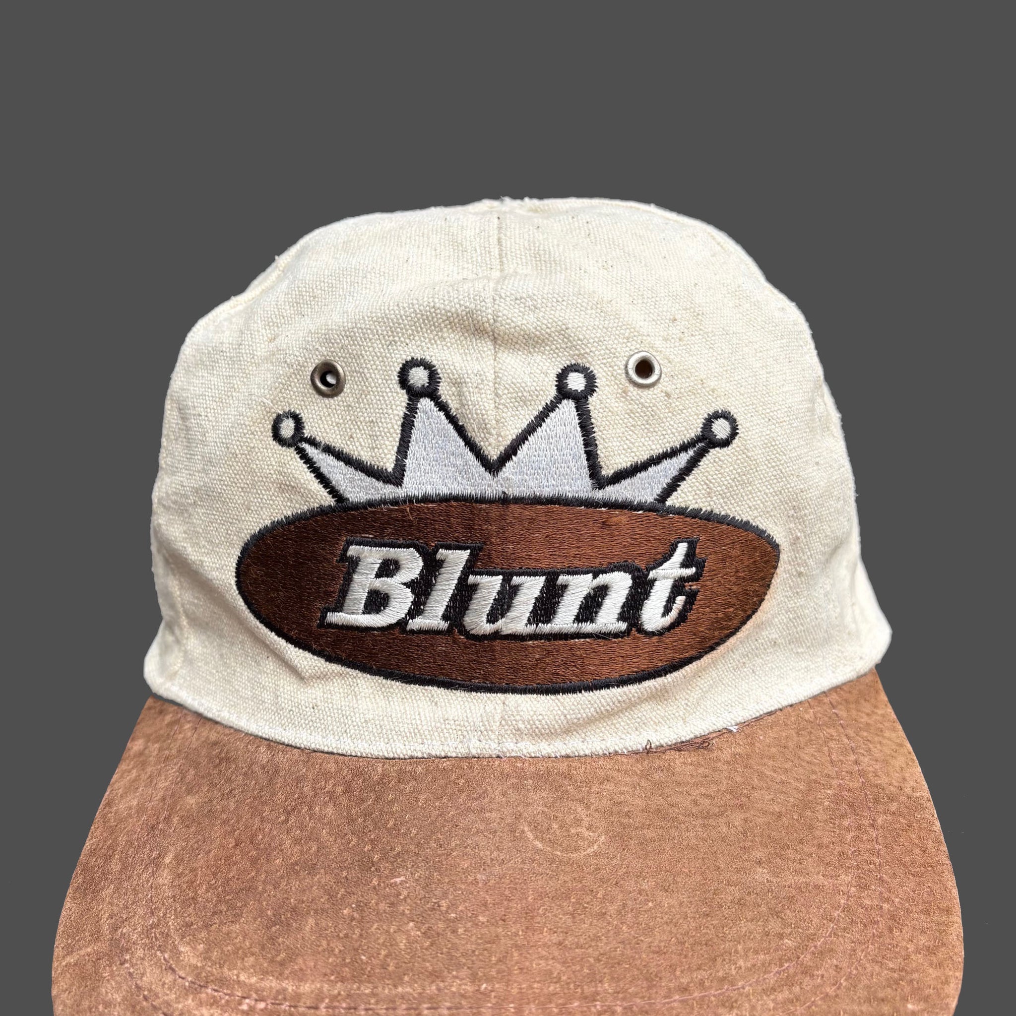 Vintage rare 1990's Blunt streetwear brand cap, in beige cotton with brown leather brim and strap and with logo embroidered on the front and on the back. Adult size.