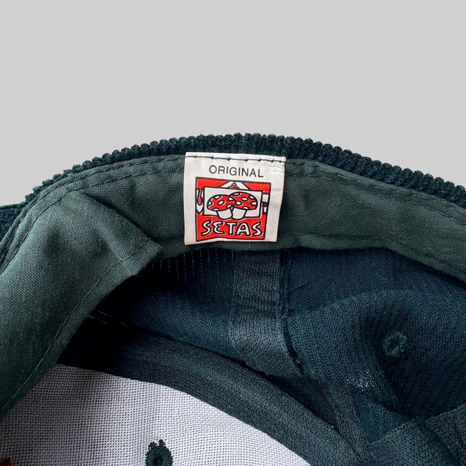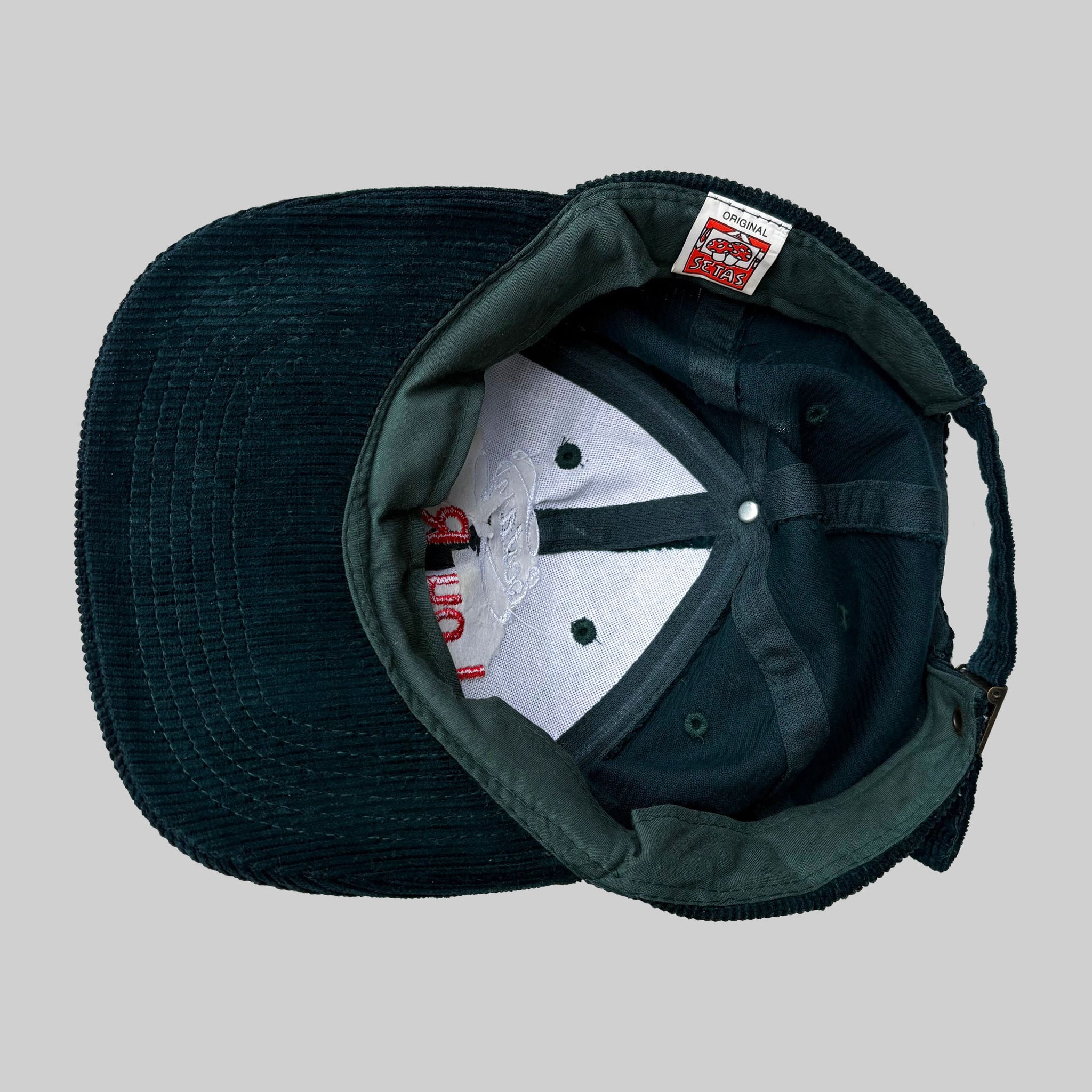 Very rare 2000 Lou Reed 'Ecstasy' vintage snapback band merch cap, in green corduroy with graphic font logo embroidered on the front. Adjustable strap on the back.