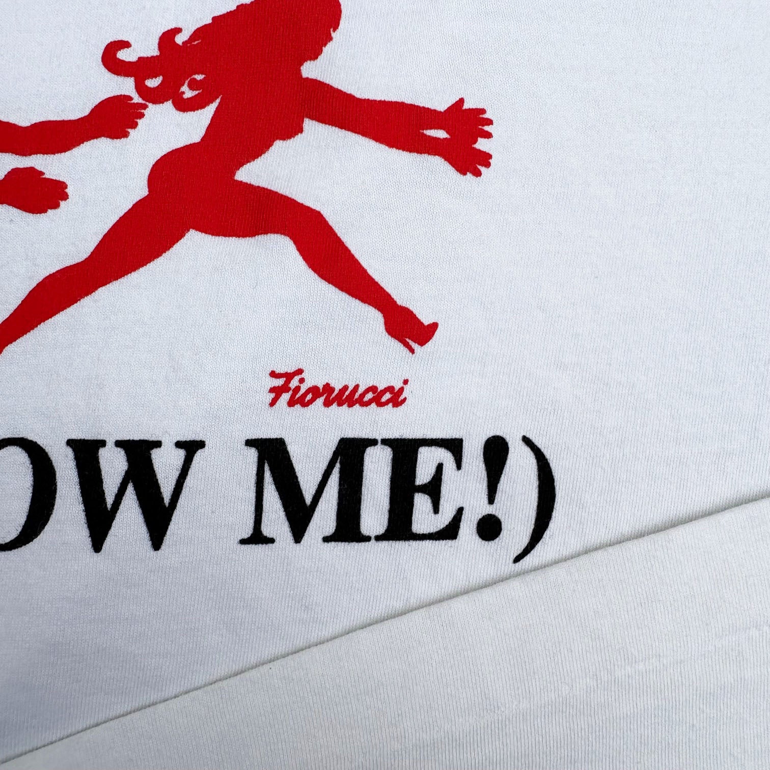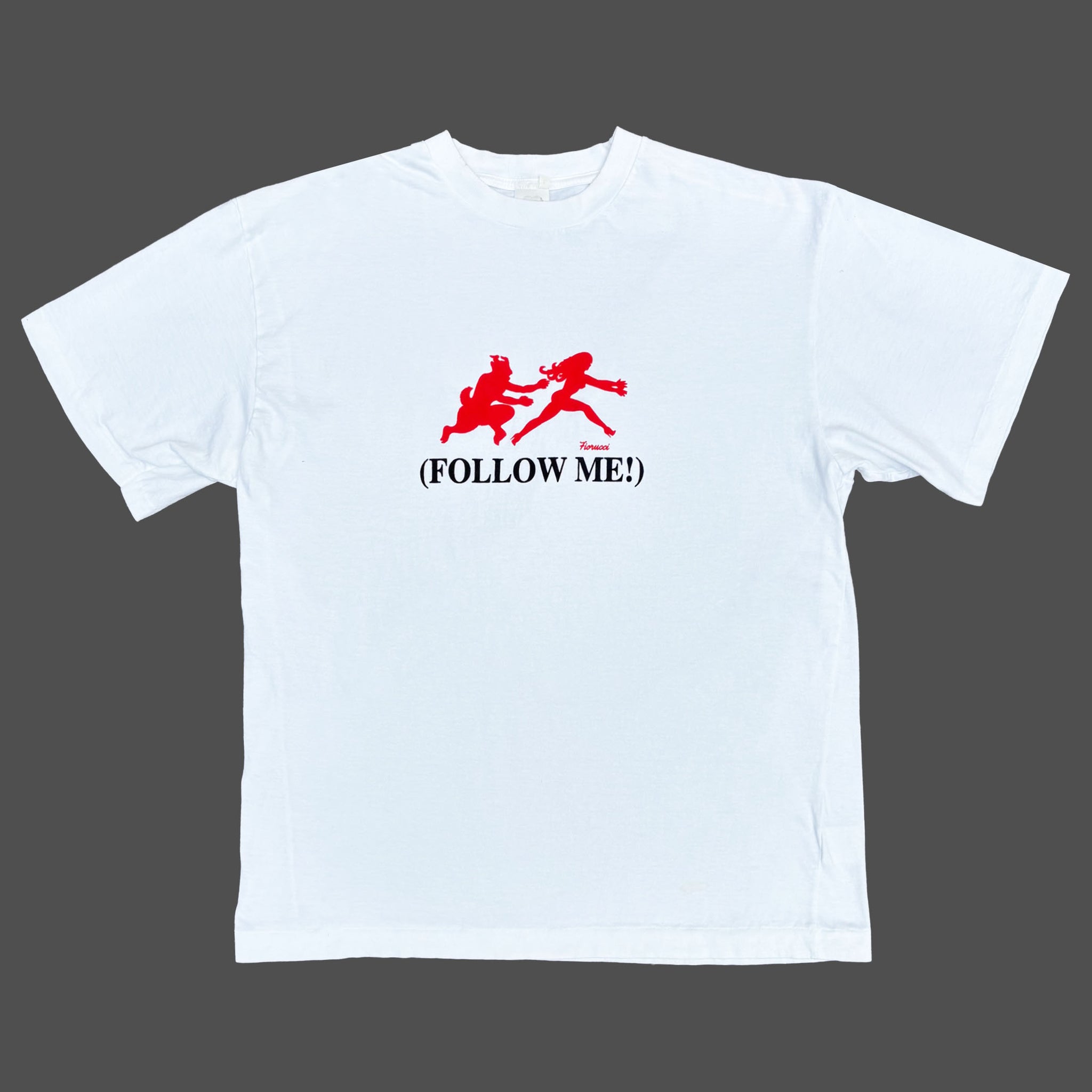 Vintage 1990's Fiorucci 'Follow Me!' t-shirt, in white single stitched cotton with graphic printed on the chest, in great condition. Made in Italy