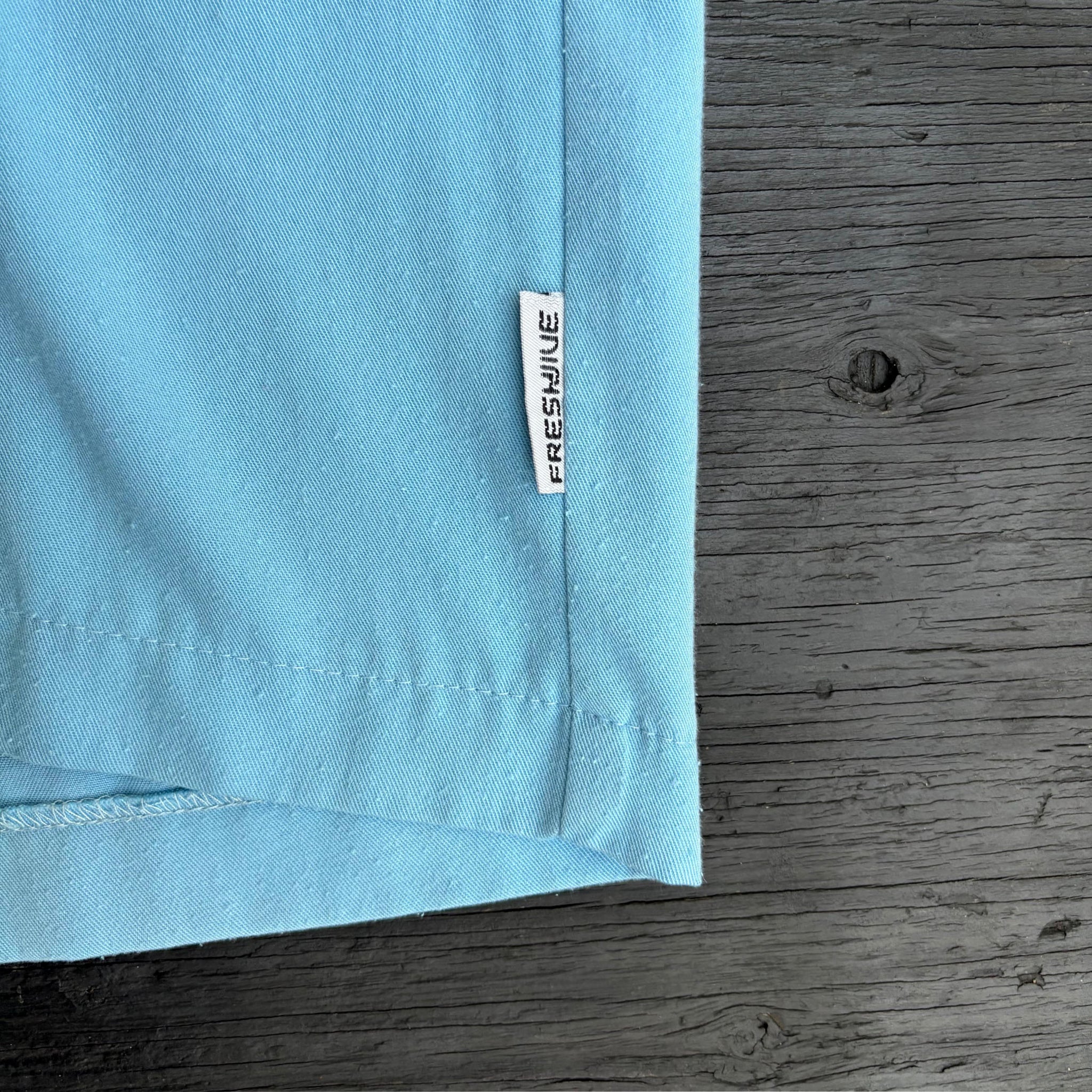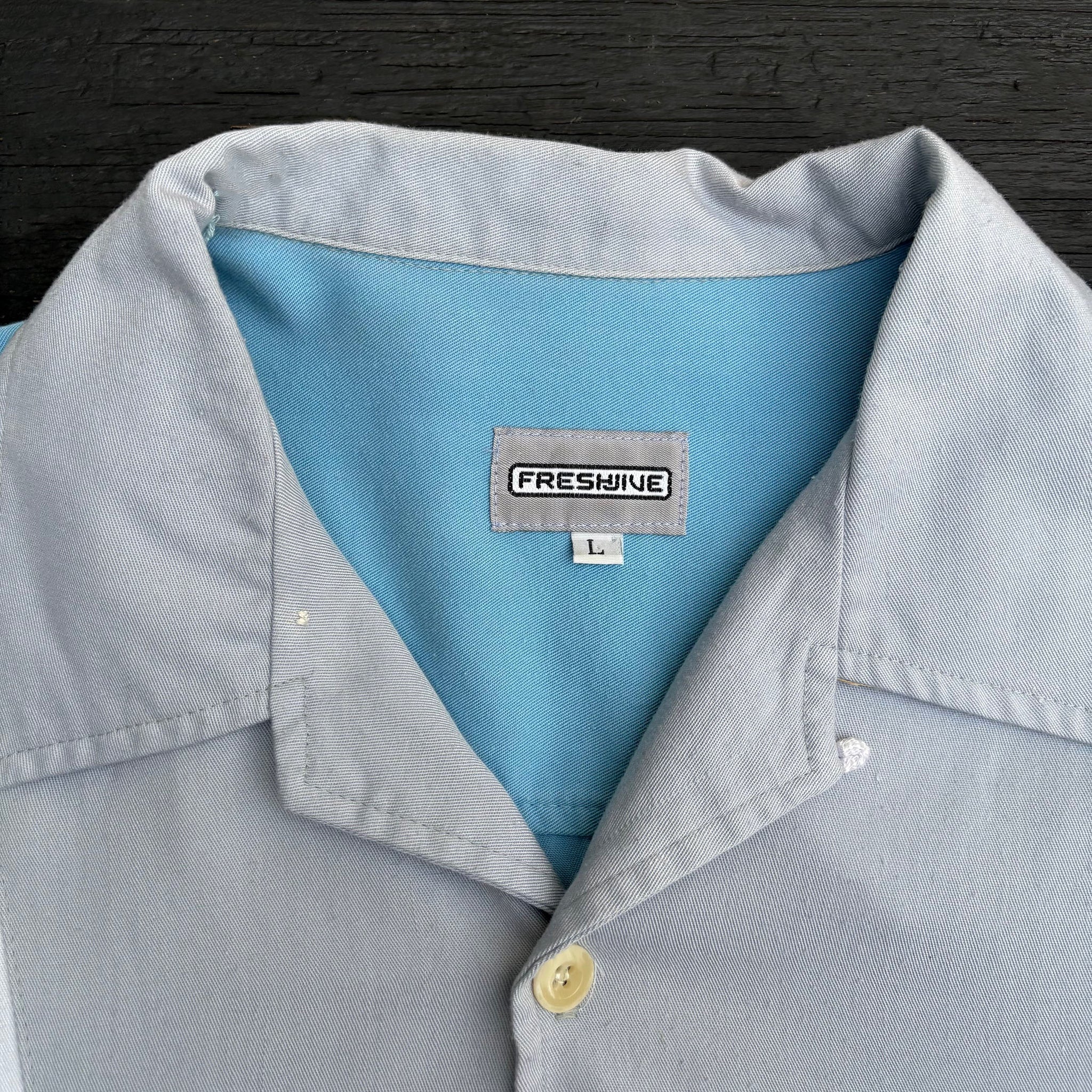 Very rare original 1990's Freshjive vintage loop collar short sleeve button up shirt, rockabilly inspired, in light blue, white and grey cotton with logo label sewed on the side. Made in USA
