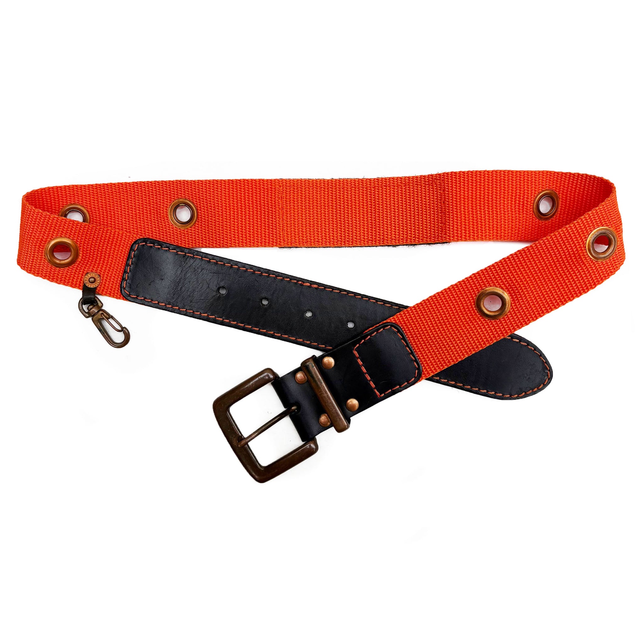 Original vintage 1995 Jean-Paul Gaultier Jean's Paris 'Skull Circuit' orange belt with logo velcro patch, small hook and metal logo buckle. Made in France.