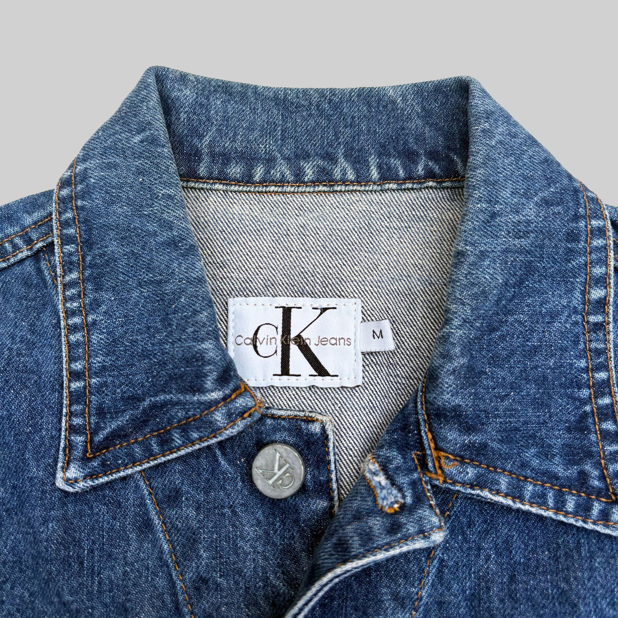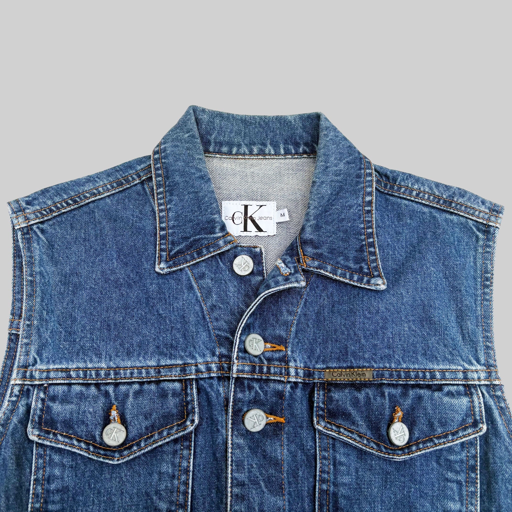 Vintage 1990's Calvin Klein sleeveless denim jacket, in blue washed denim jean with metal button, logo label, very nice vest. Made in USA