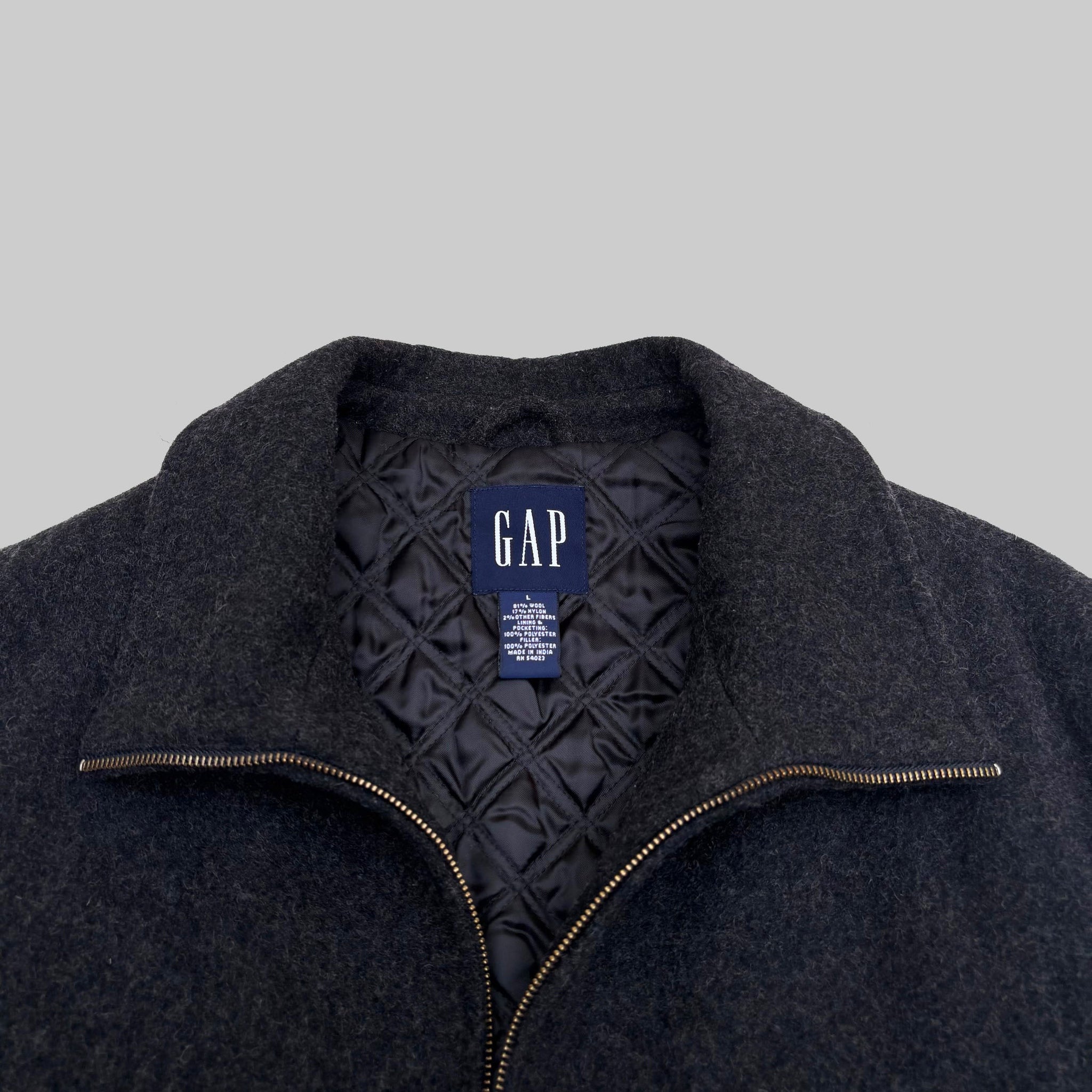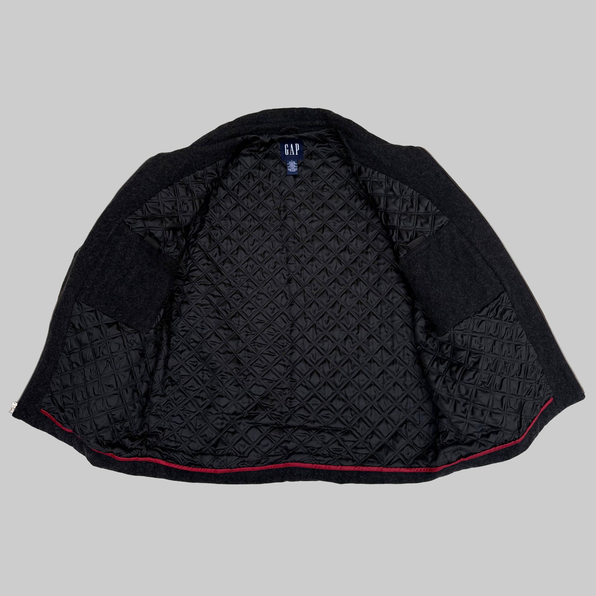 Vintage 1990's Gap zipped wool jacket, in dark grey wool, metal zipper, beautiful details, quilted lining.