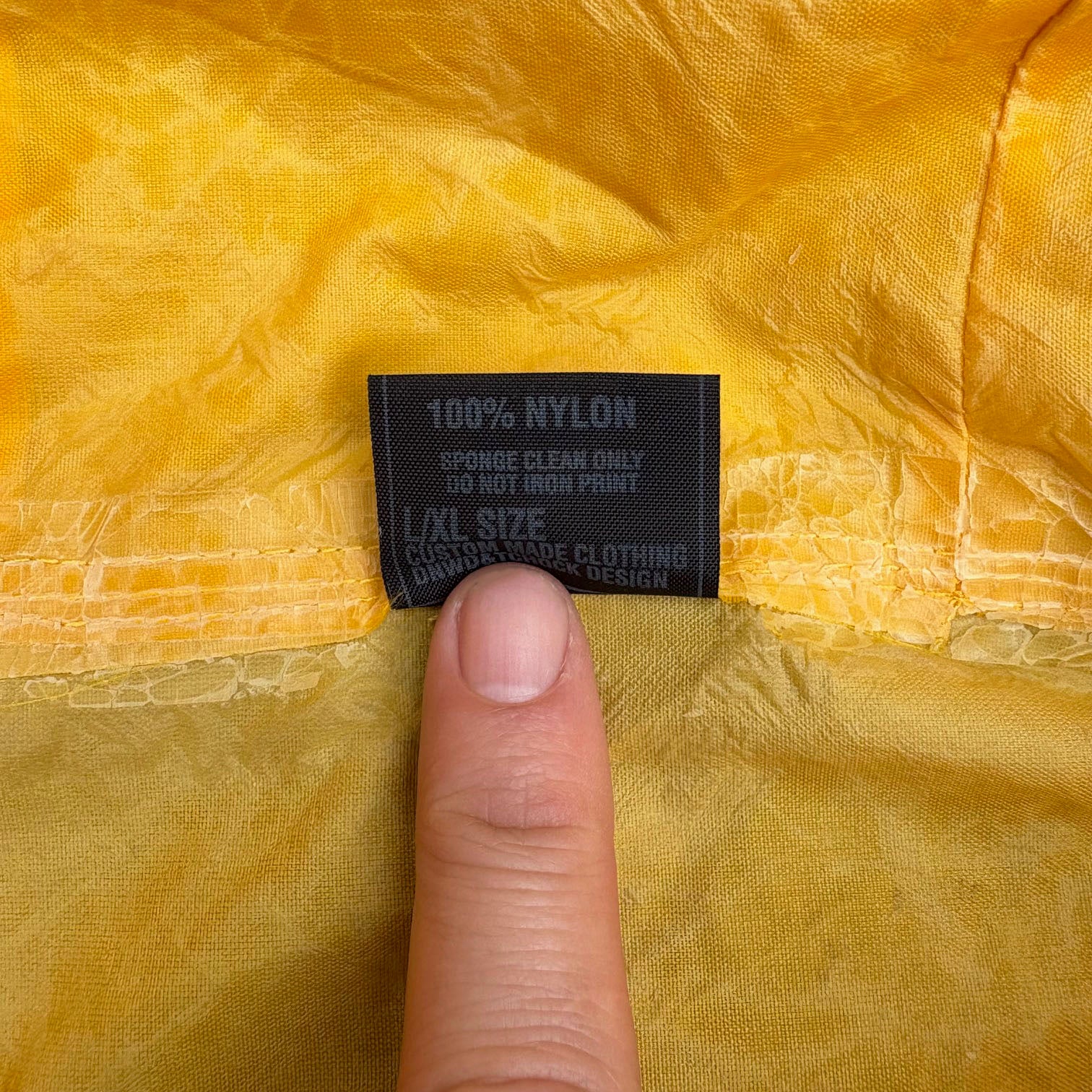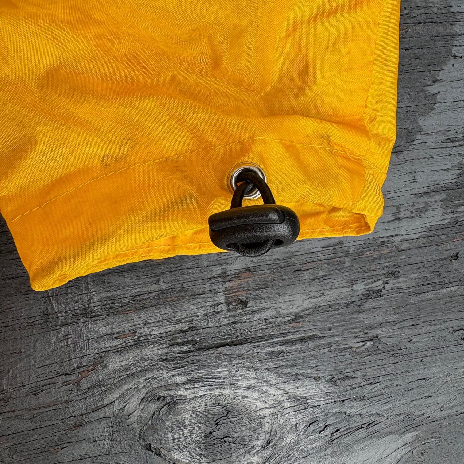 Original 2001 Radiohead, Kid A era vintage windbreaker anorak jacket. In yellow nylon with 'Don't Go' graphic printed on the front pocket and graphic on the back, multiple adjustable drawstrings.