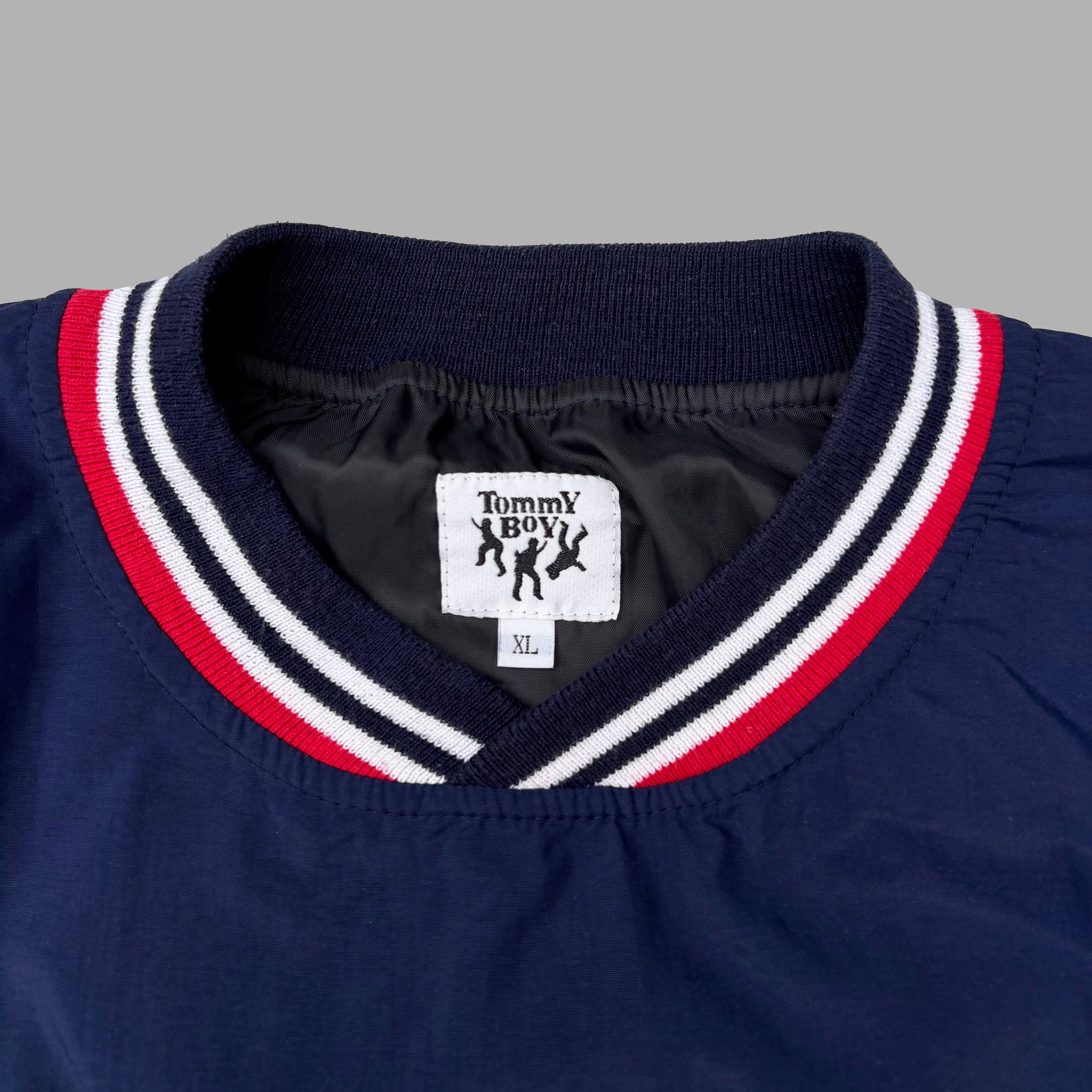 Original vintage 1990's Tommy Boy Records pullover jacket, in navy blue nylon with red and white details with large spellout logo embroidered on the chest and logo label on the upper back, great quality, in great conditions. Made in USA