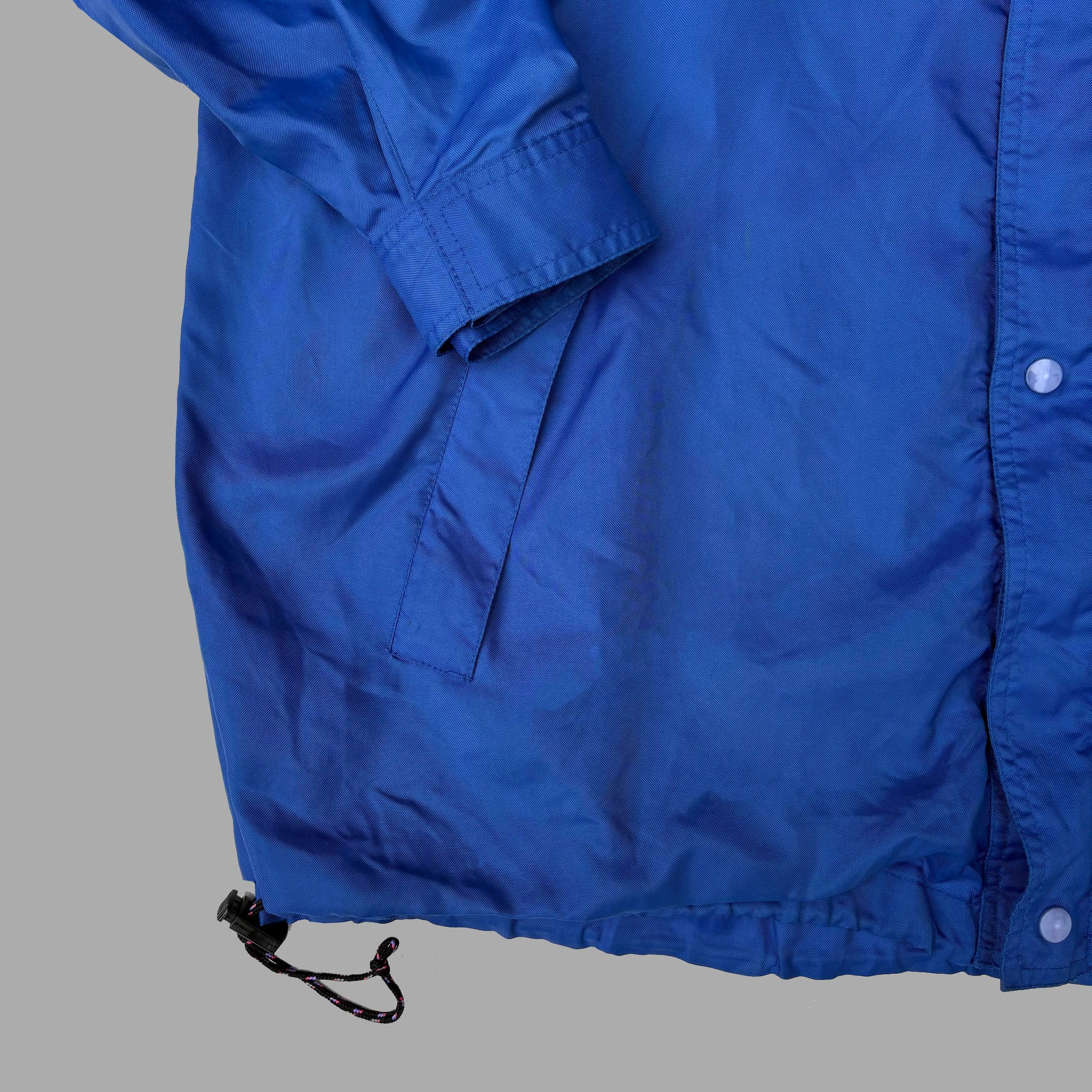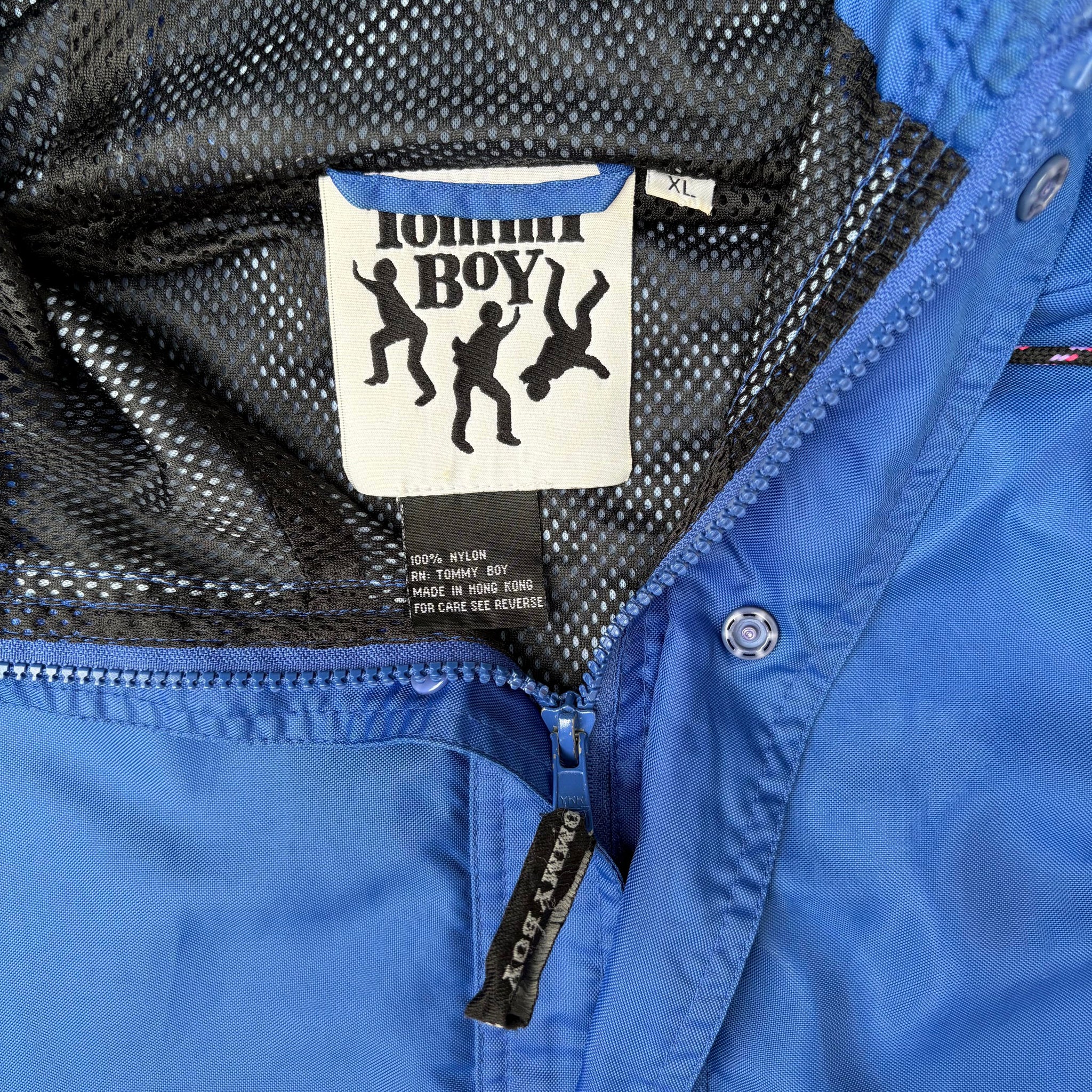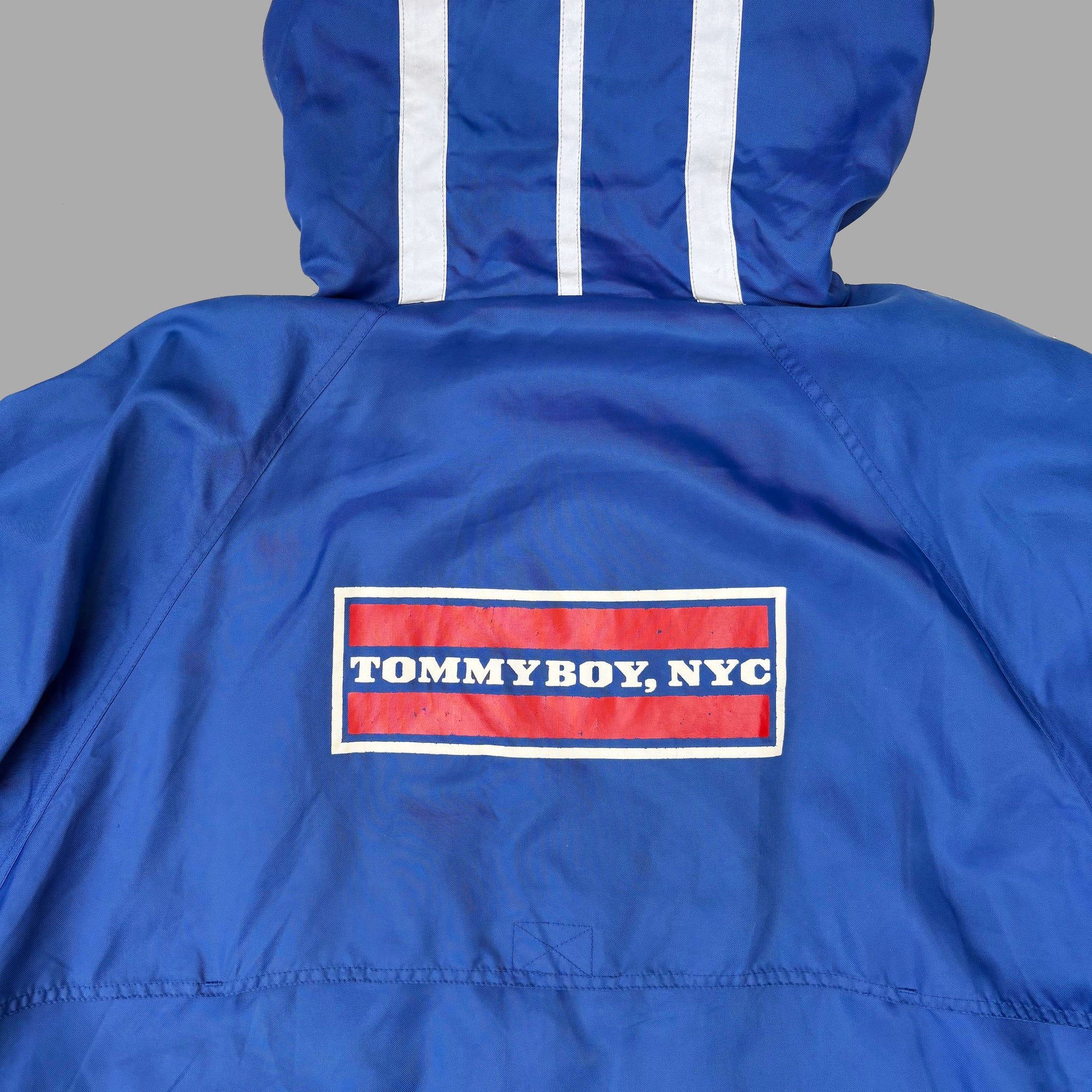 Original vintage 1990's Tommy Boy Records employee parka jacket, in blue nylon with red and white logo embroidered on the chest and printed on the back, reflective lines on the hood, great quality, in great conditions. Buried line after receiving a cease and desist from Tommy Hilfiger. Made in USA