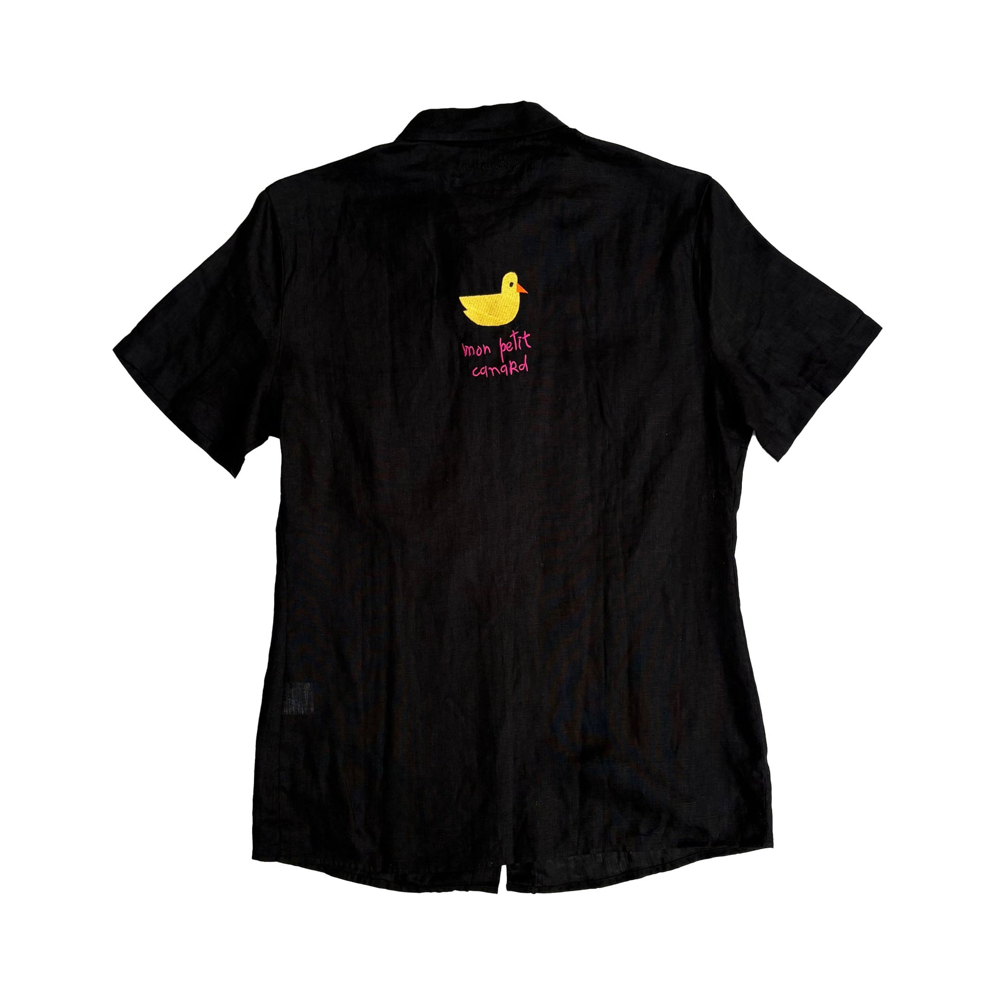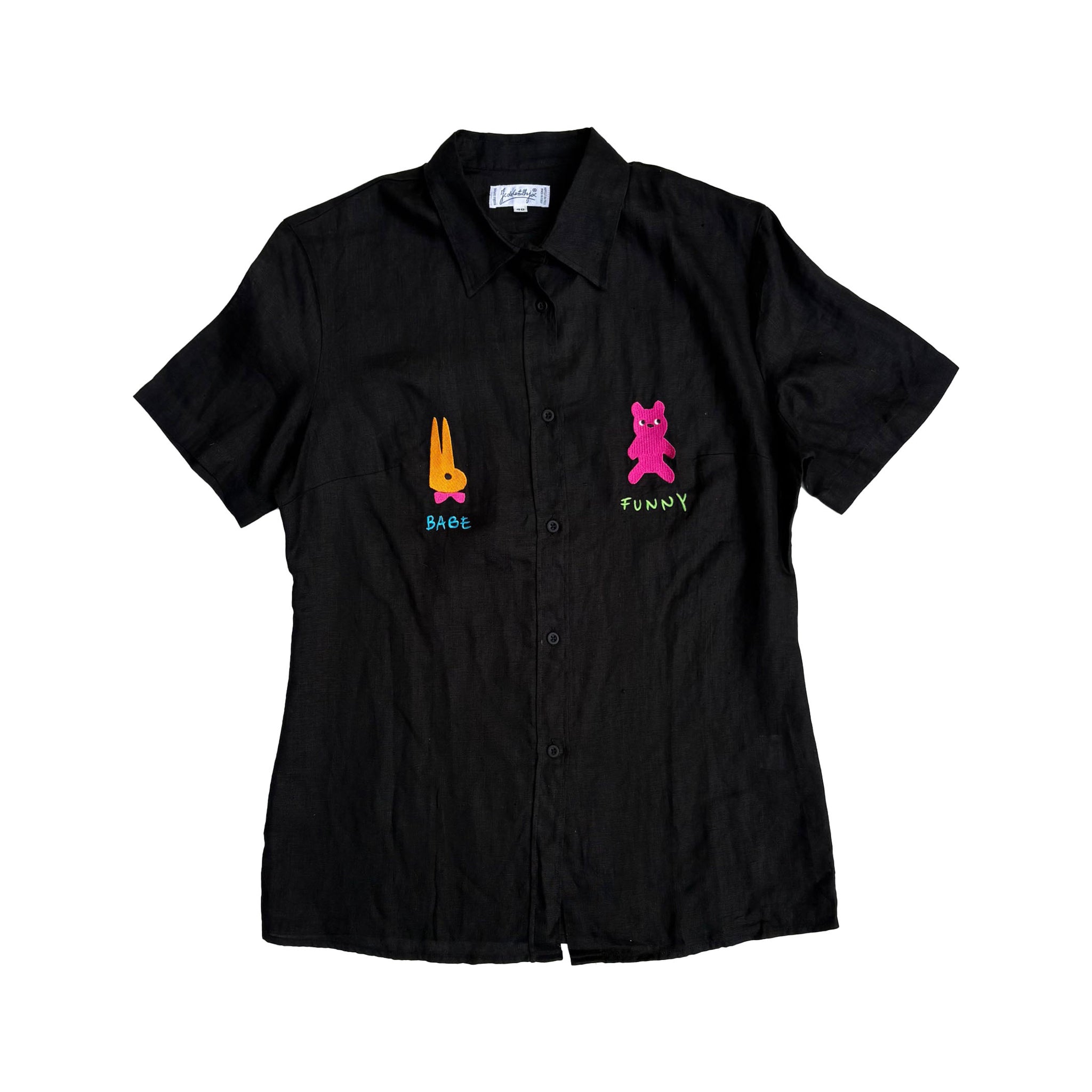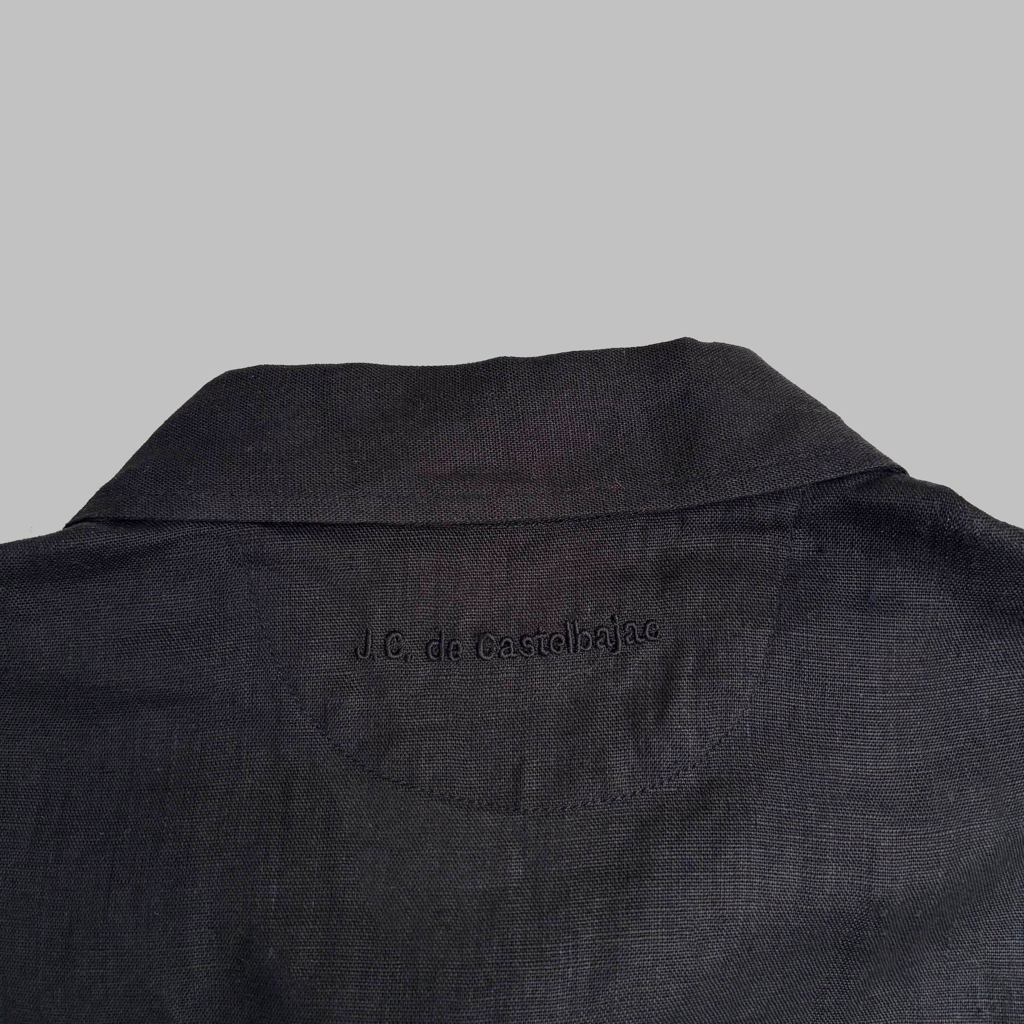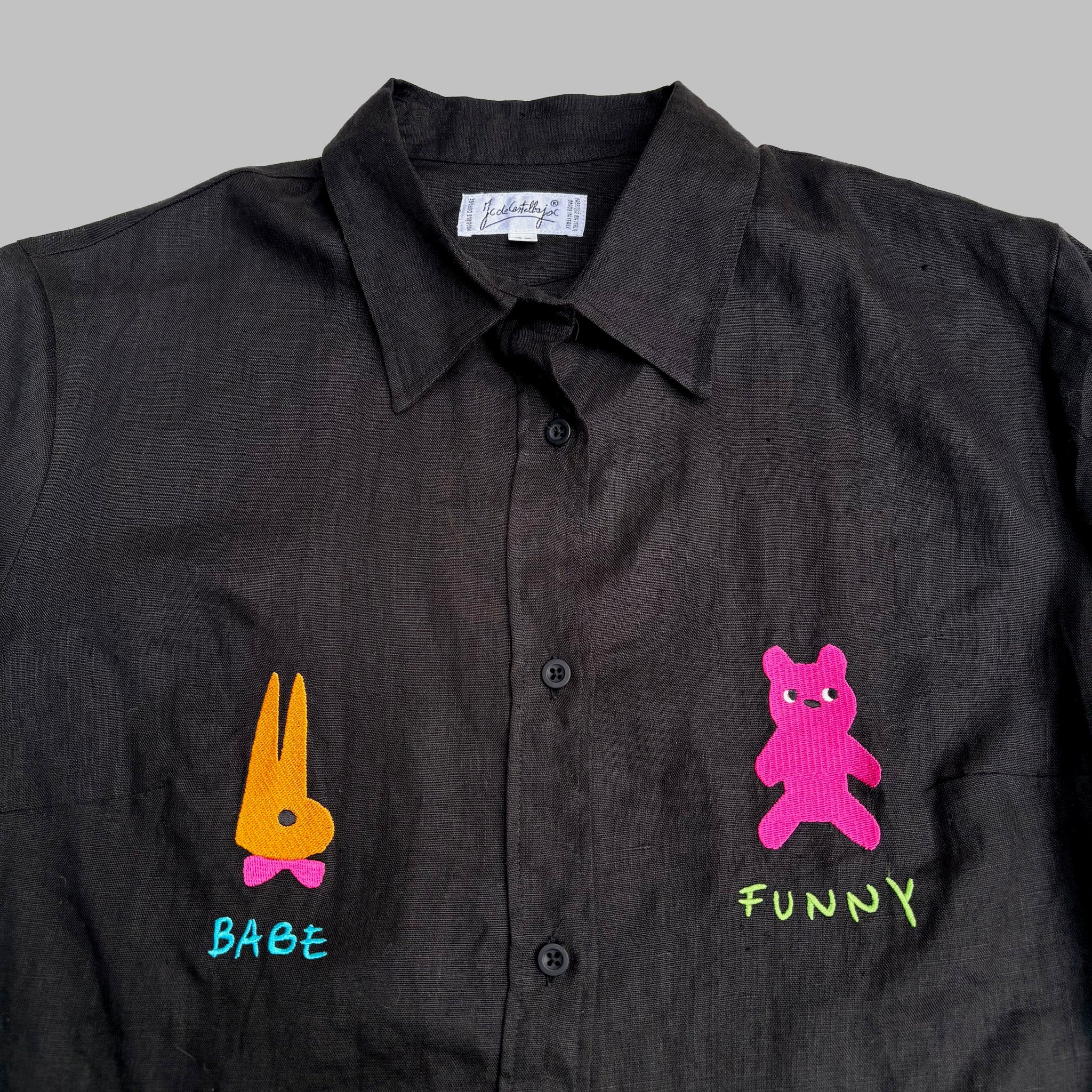 Vintage 1990's designer Jean-Charles de Castelbajac short sleeve button up women shirt, in black linen with cute animals graphics and logo embroidered on the front and back, very nice piece, great quality. Made in Italy
