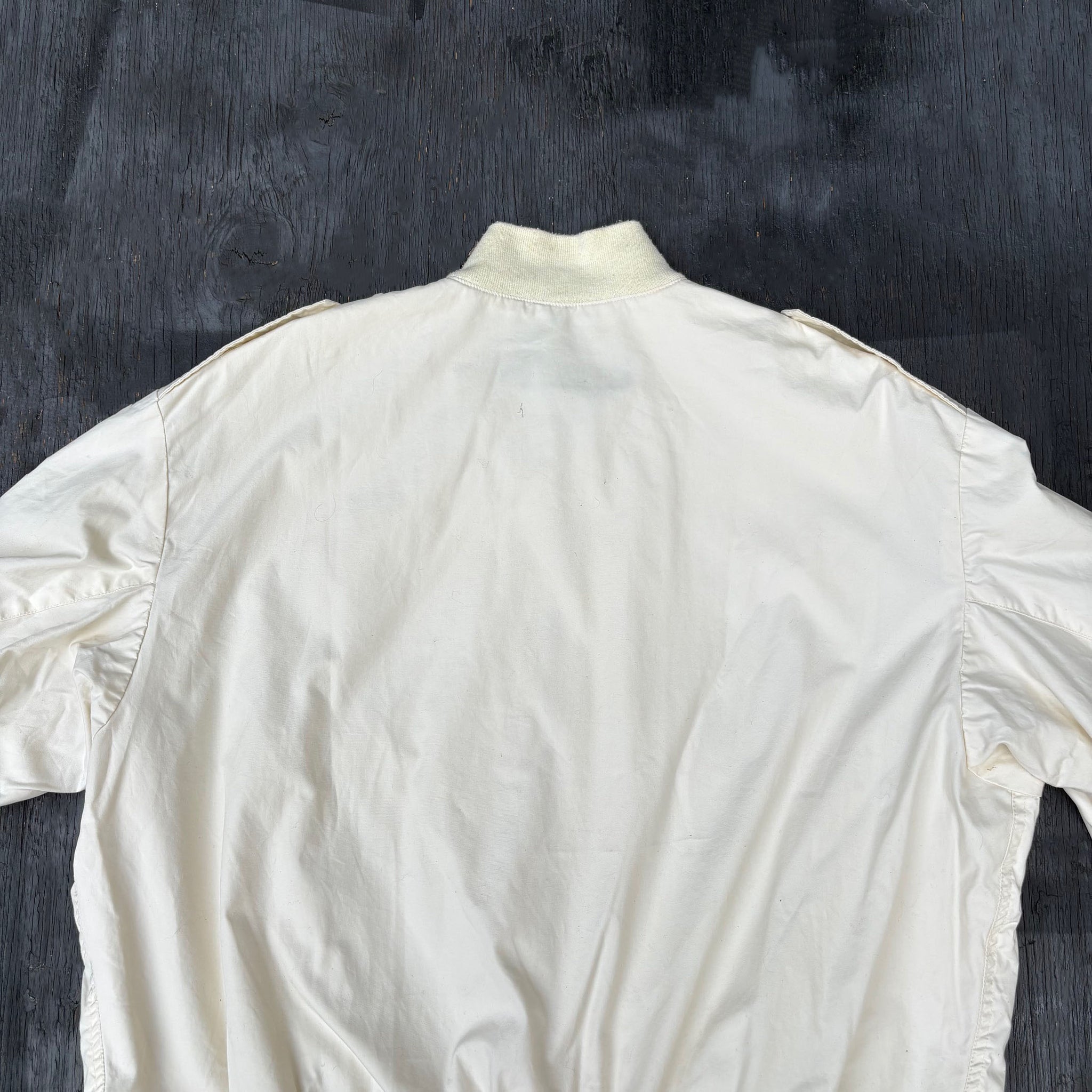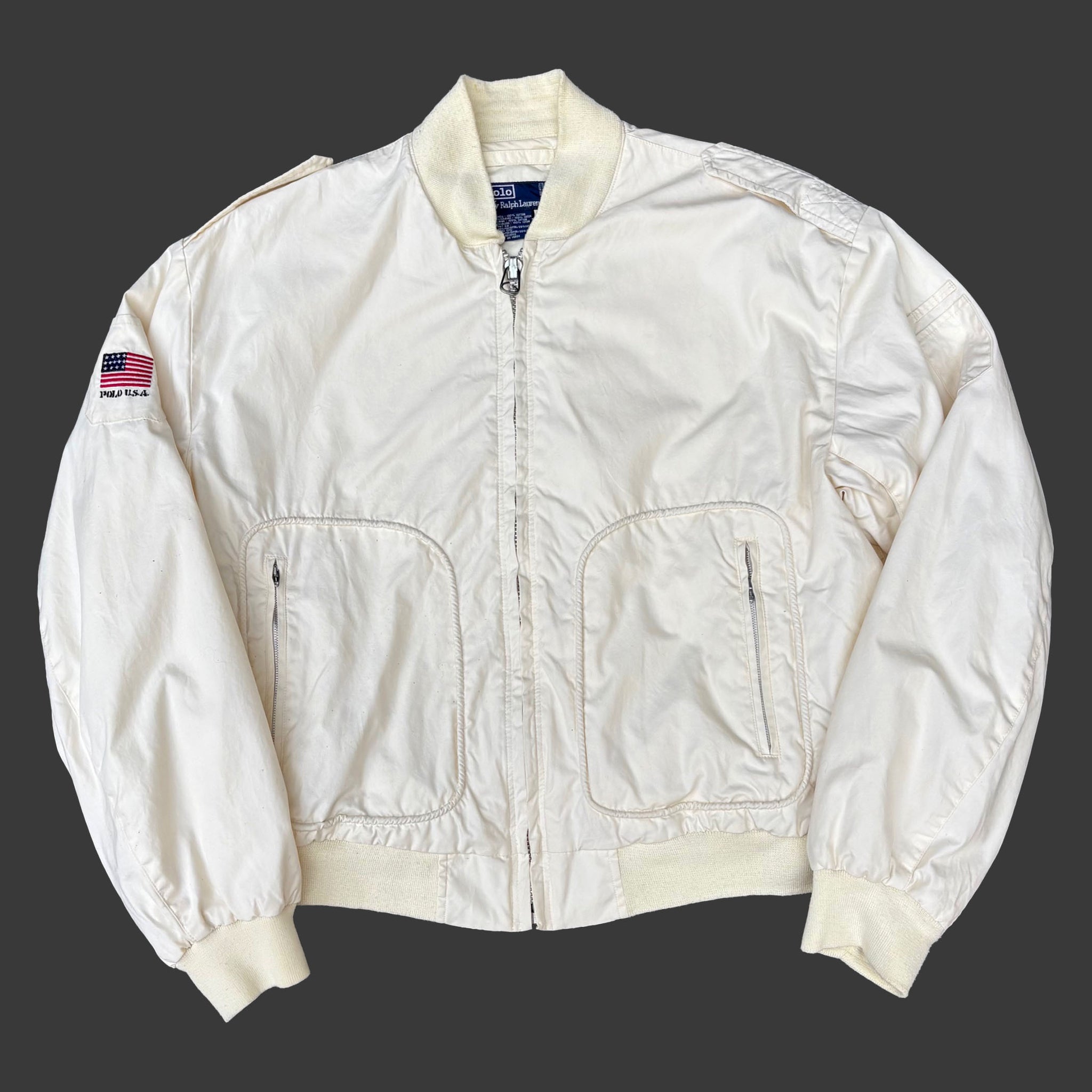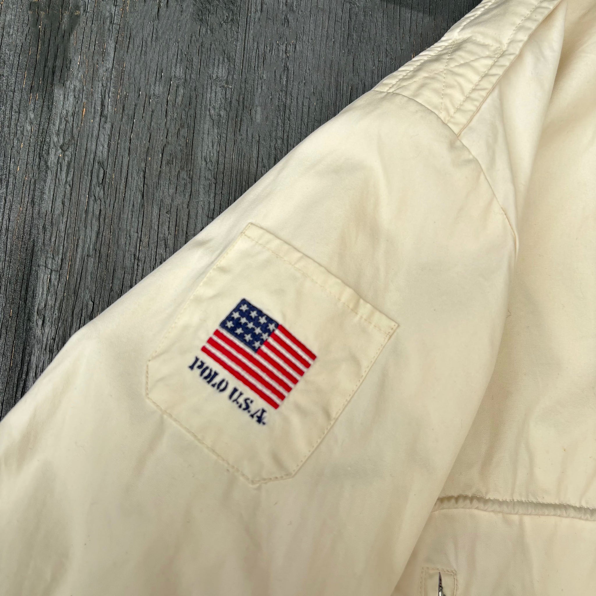 Beautiful, vintage 1990's Polo Ralph Lauren 'Polo USA' flight jacket. In white cotton with American flag logo embroidered on the sleeve, heavy metal zippers, beautiful details. In great conditions. Sought after piece.