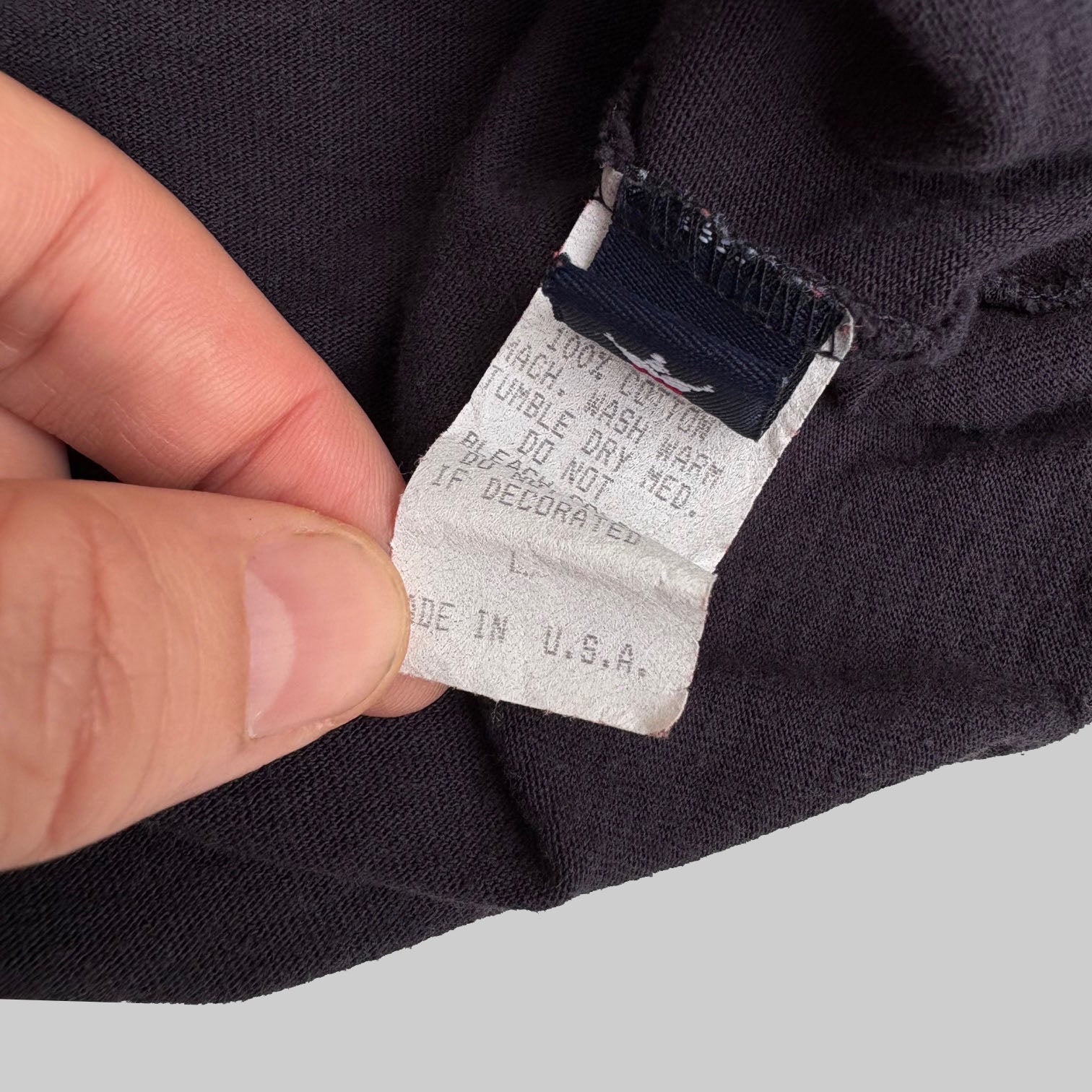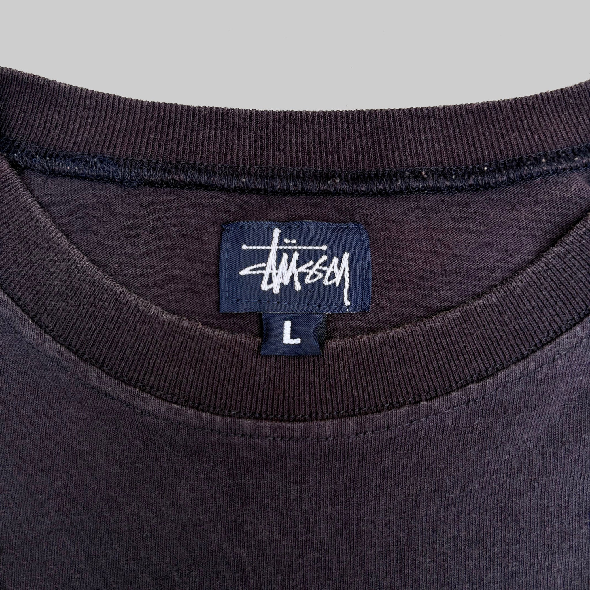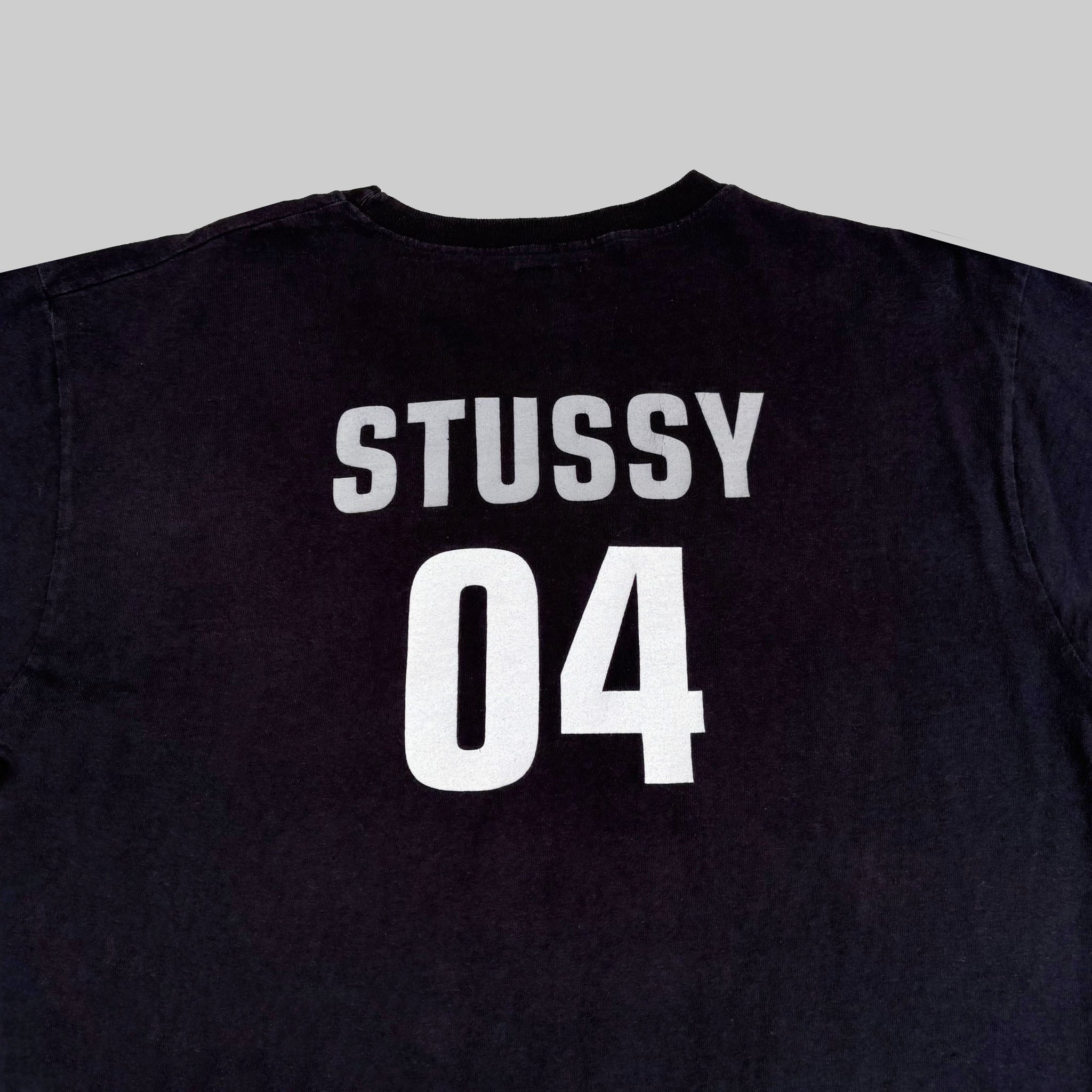 Rare 2004 original Stüssy 'NYLTLA' vintage long sleeve t-shirt, in navy blue cotton with graphic logo printed on the chest and number on the back. Made in USA