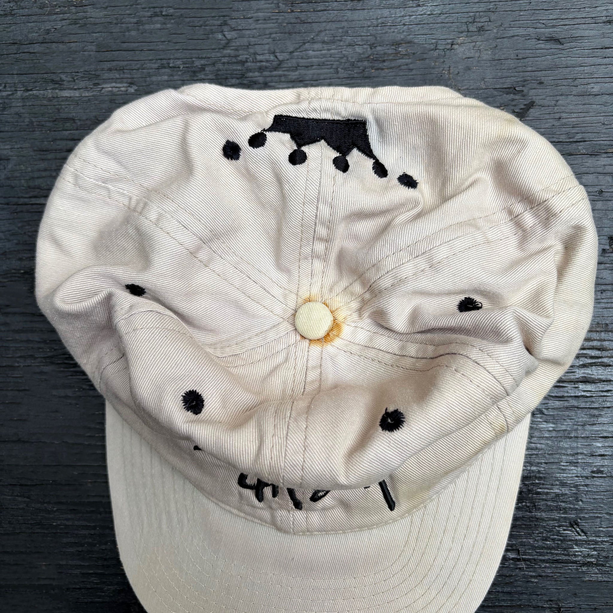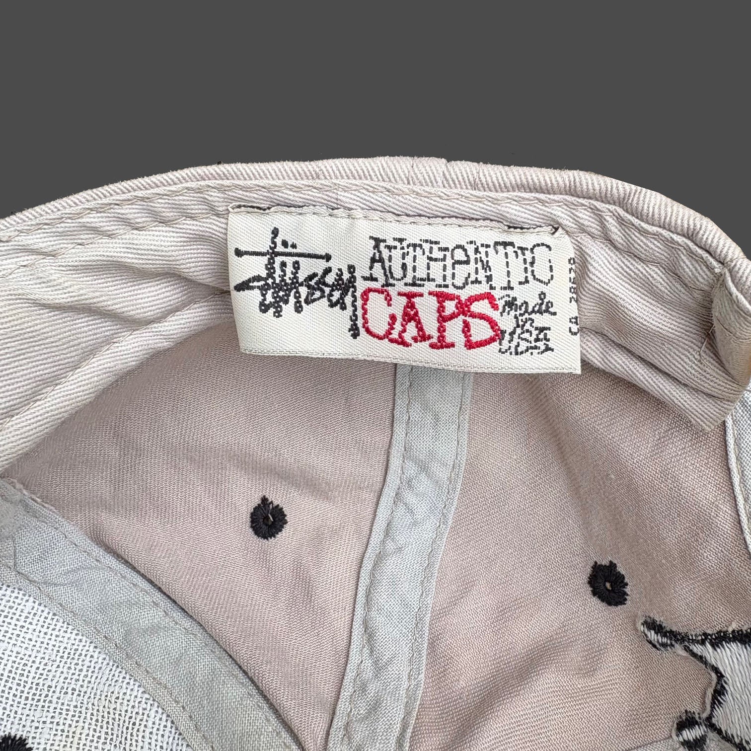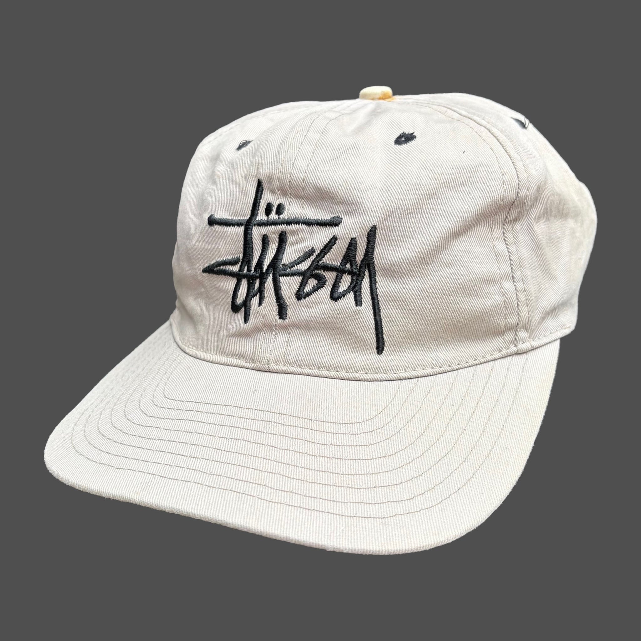 Very rare 1990's original vintage Stüssy snapback cap, in grey beige cotton with crown logo embroidered on the back. Good condition, small rusted mark on the top, made in USA