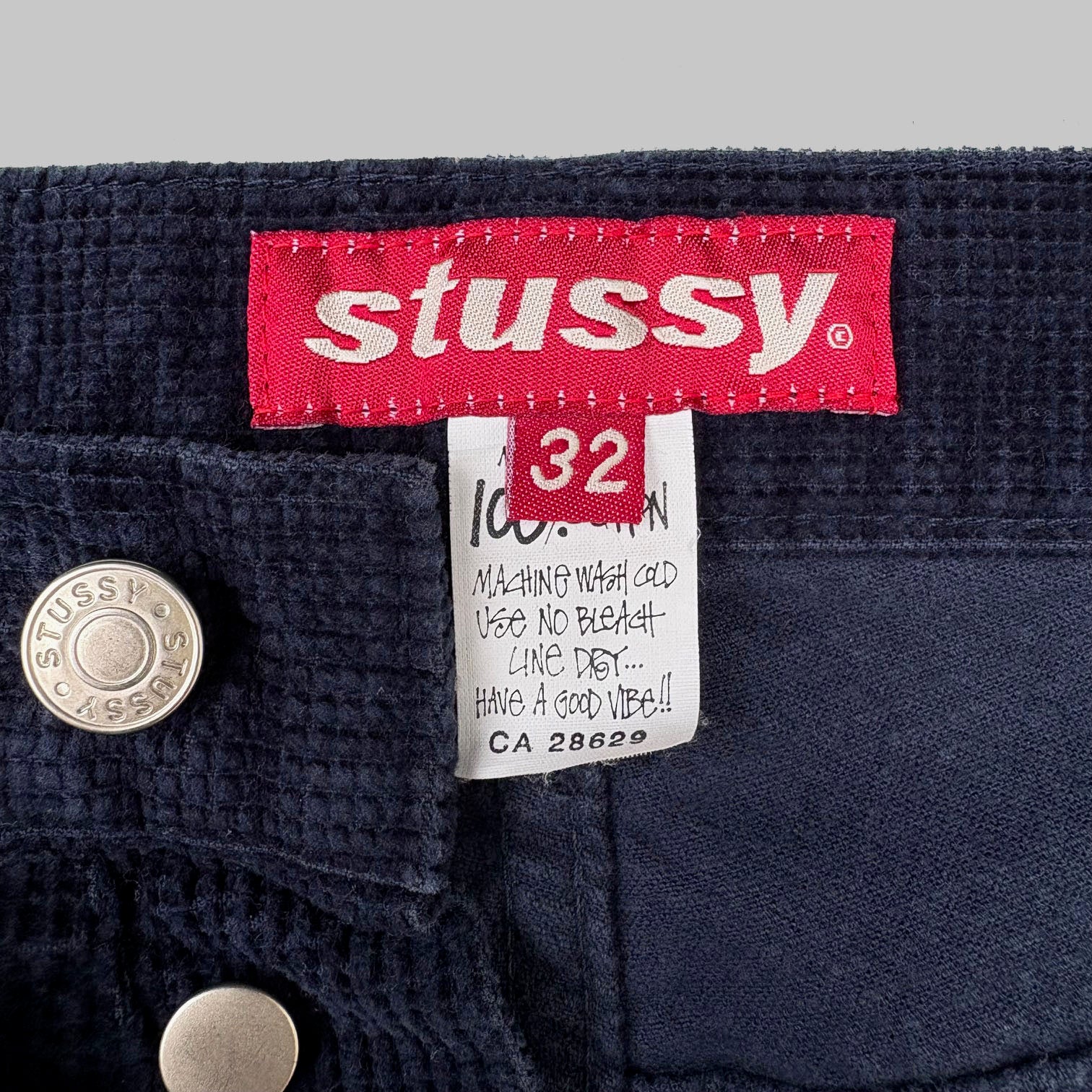 Very rare vintage pair of early 1990's Stüssy waffle corduroy pants, straight leg, regular fit, measured waist size 31, length 30, rise 12, leg opening 8.5, hips 22, thigh 11.