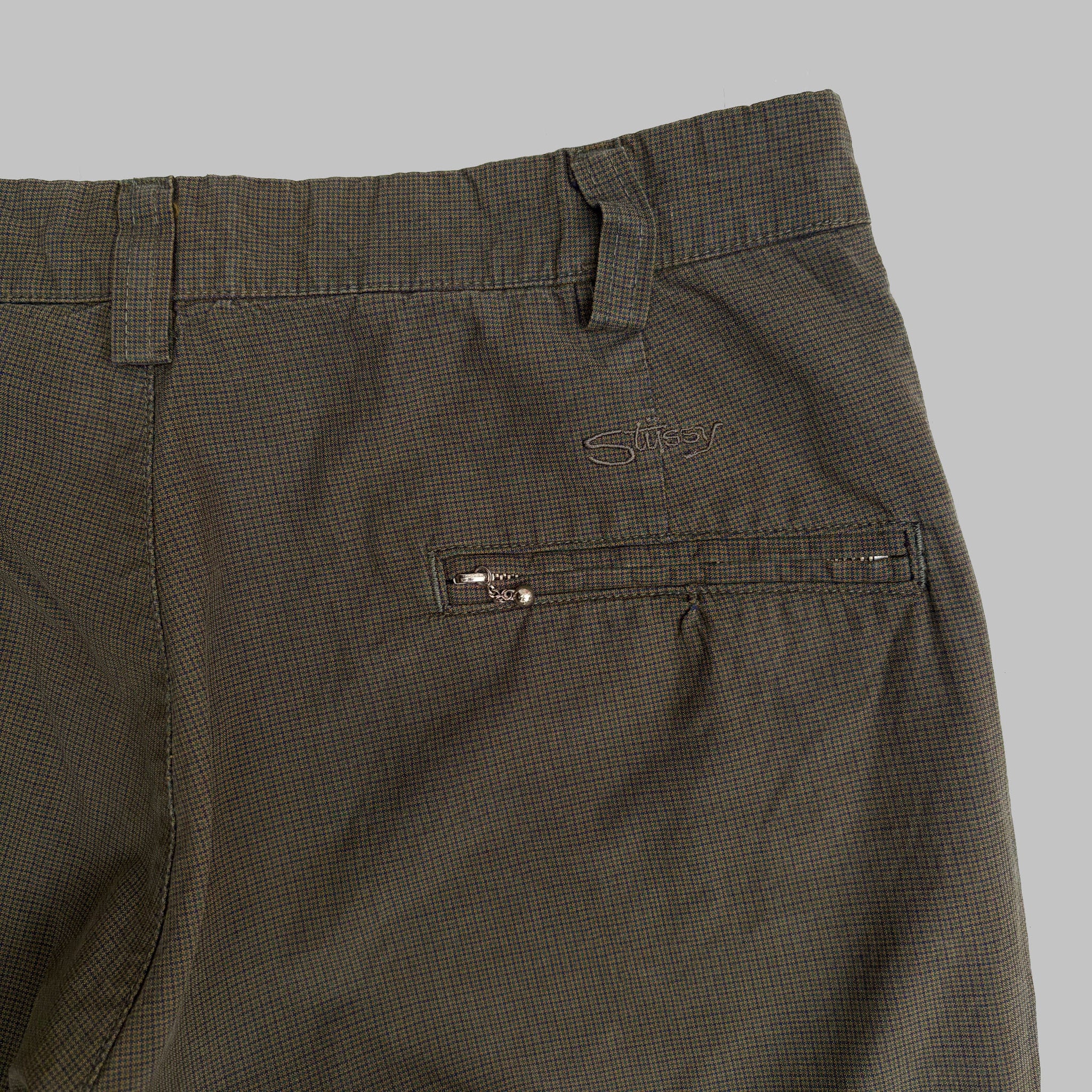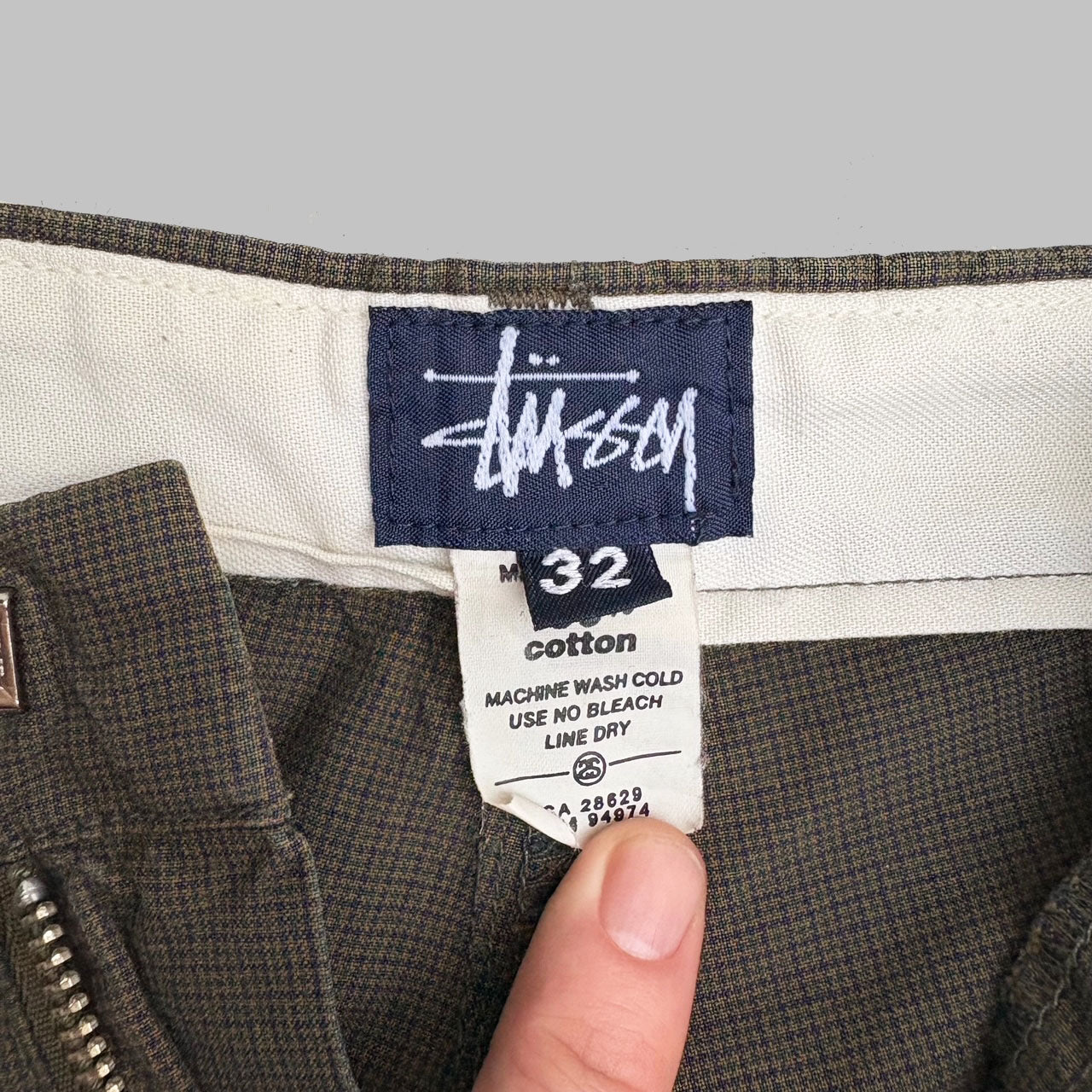 Rare vintage pair 1990's Stüssy green trousers, waist 32, length 30, rise 13, leg opening 8.5, hips 21, thigh 13.5.
