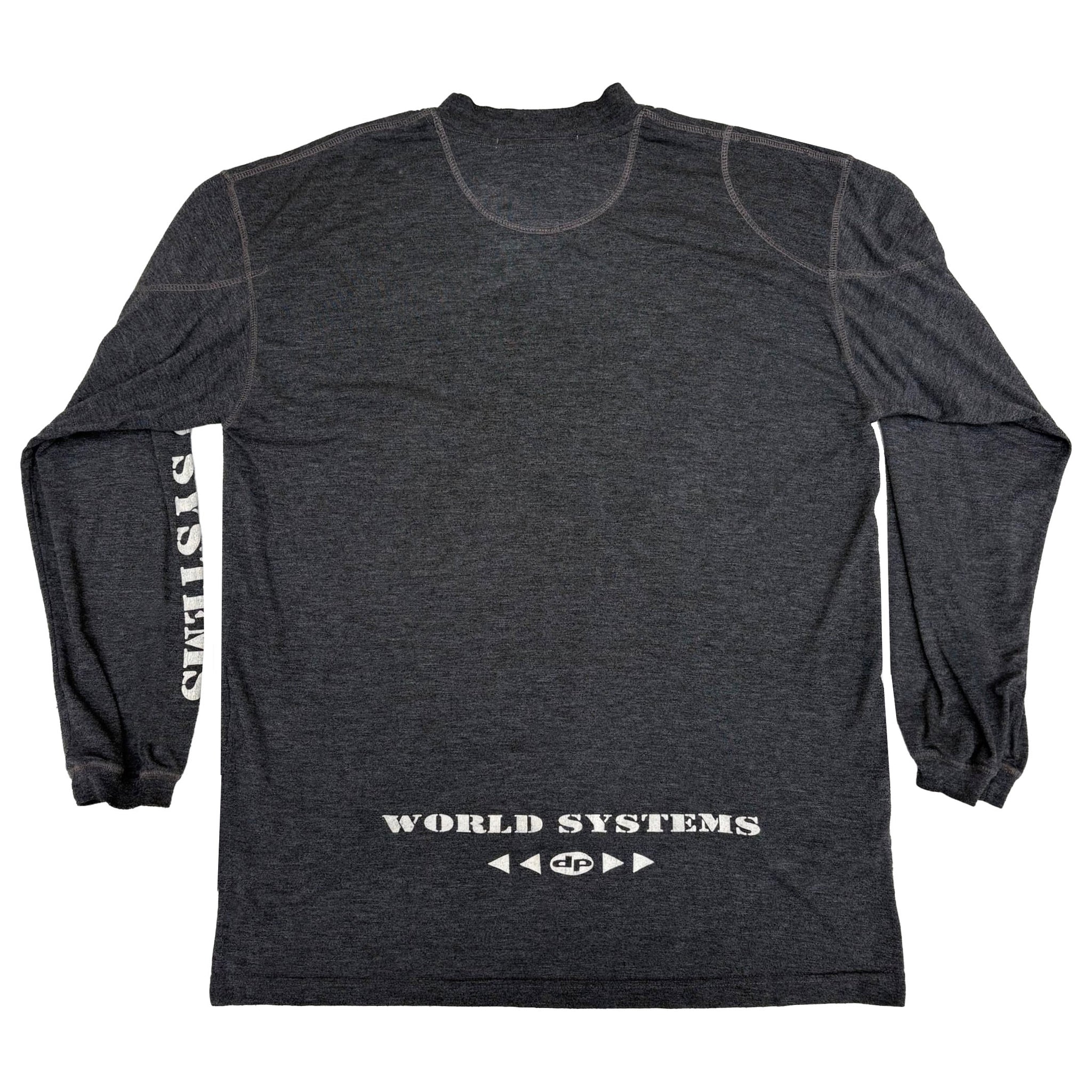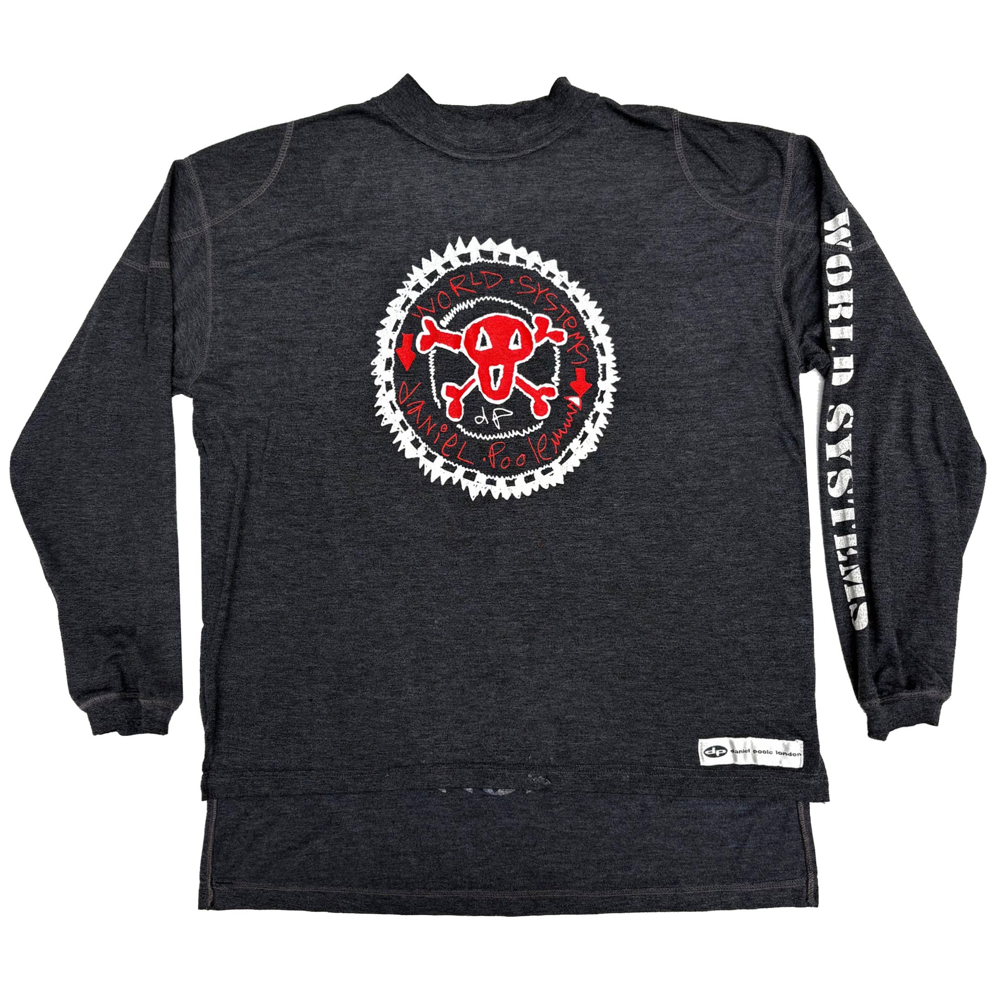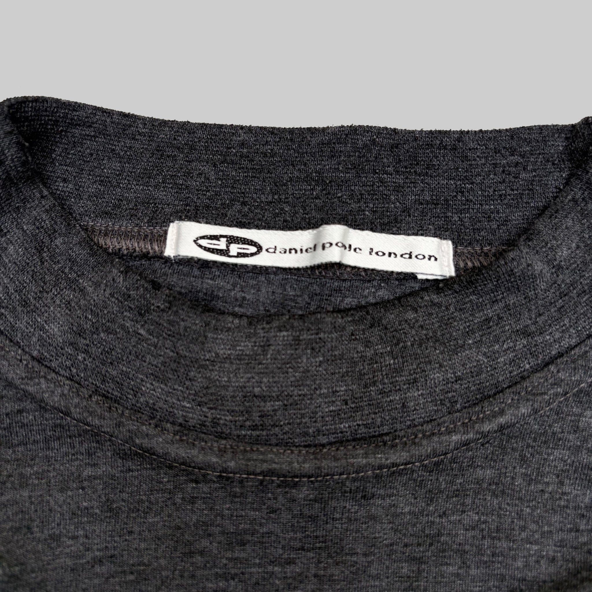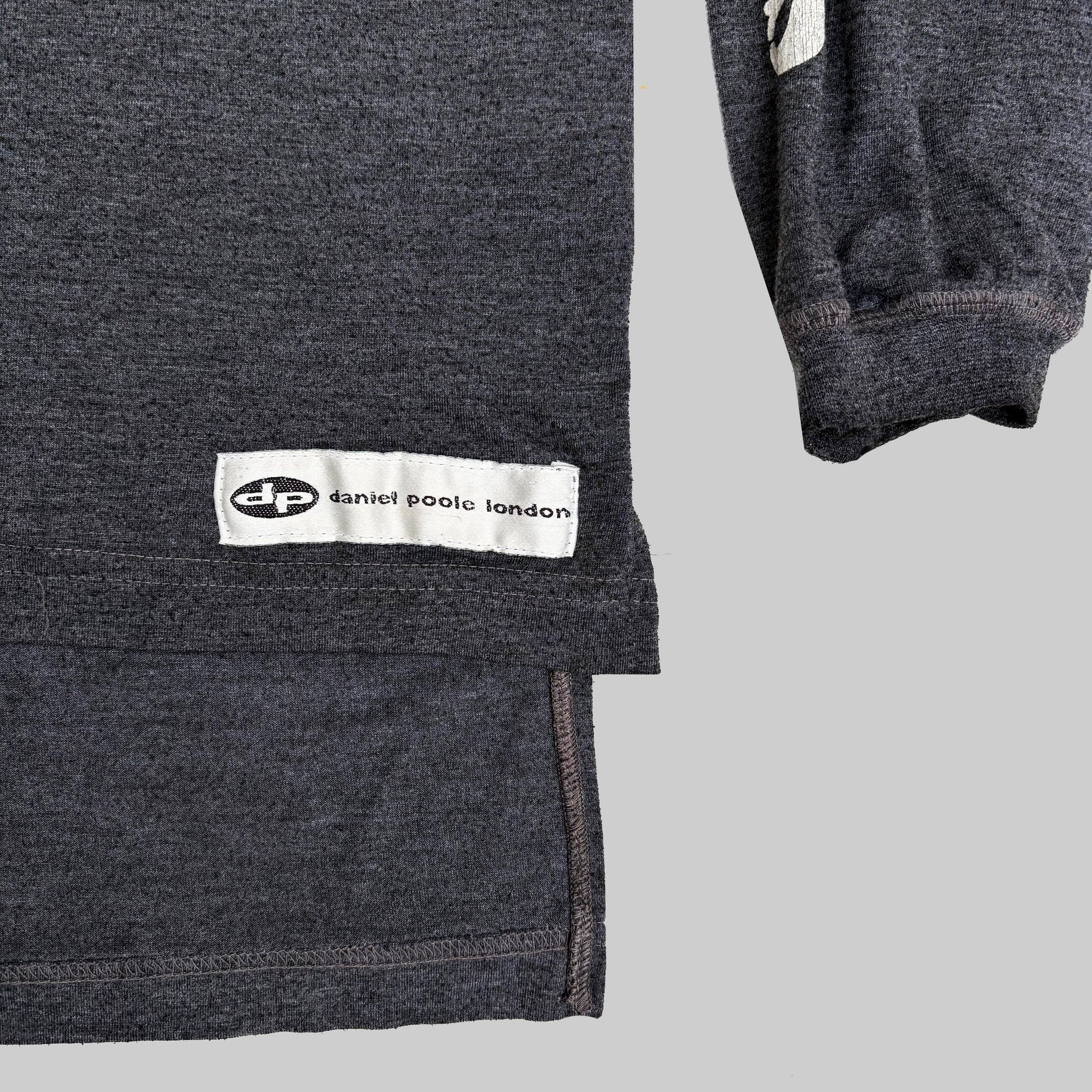 Original 1990's Daniel Poole vintage long sleeve t-shirt, logo label on the bottom, in dark heather grey cotton with graphic printed on front, lower back and on the sleeve!