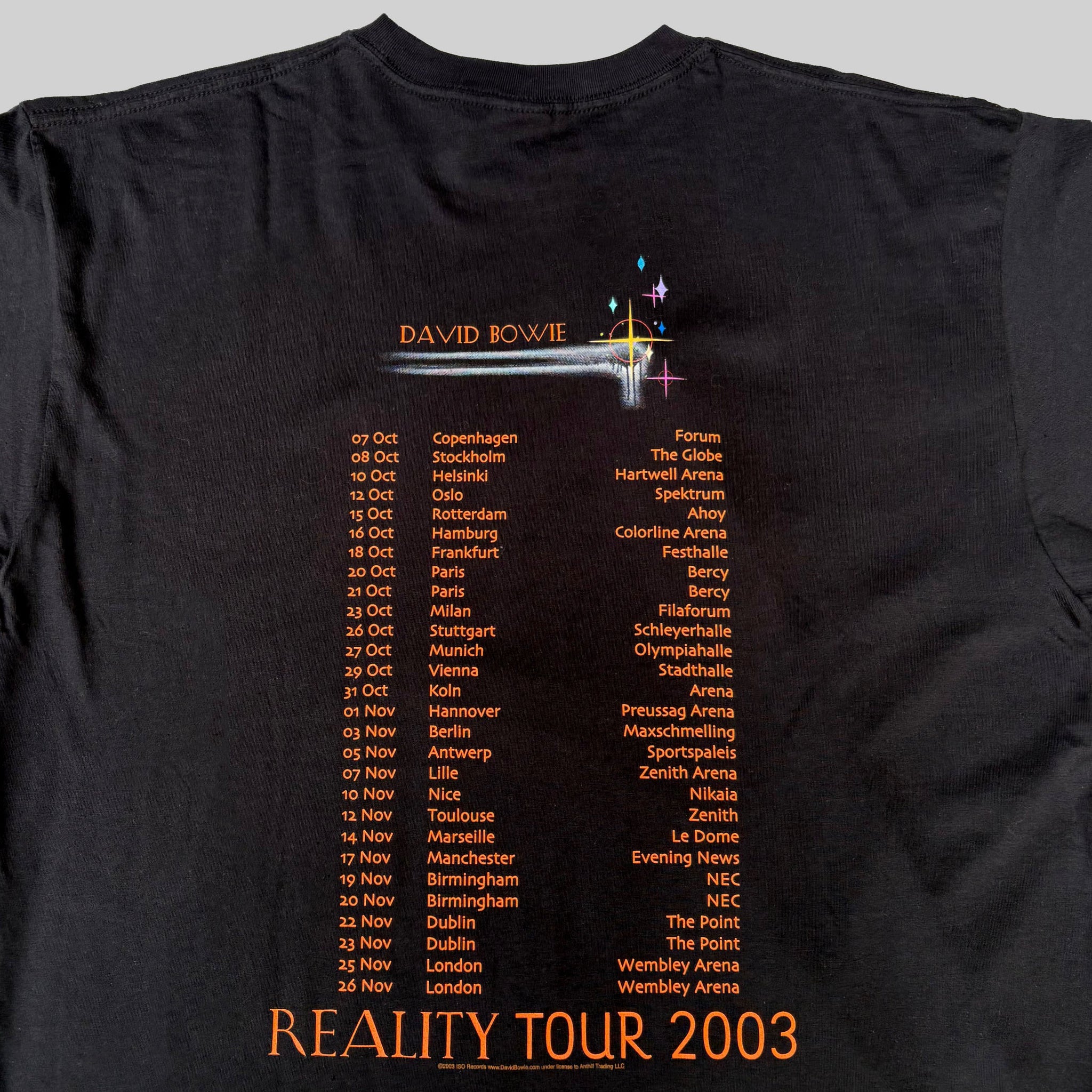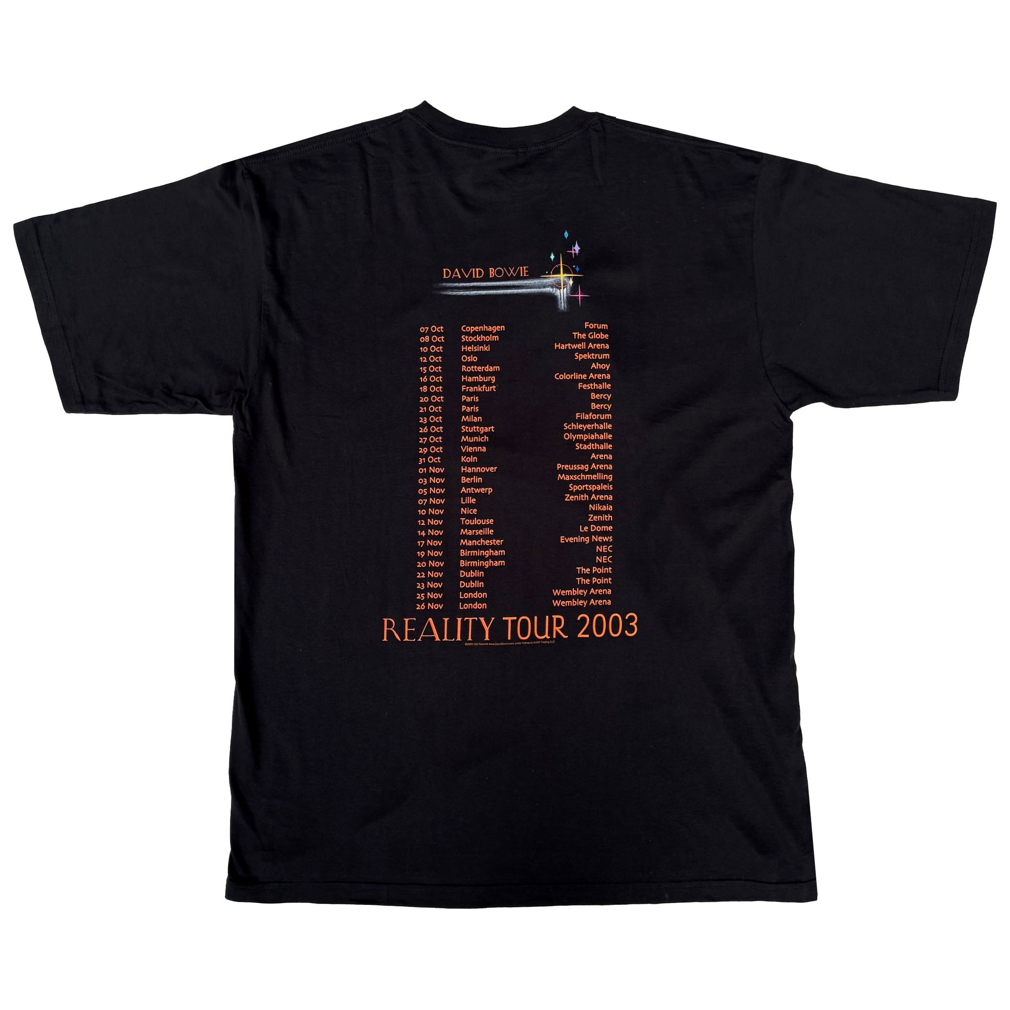 Rare, original 2003 David Bowie, Reality world tour vintage t-shirt, Anthill Trading LLC licensed, in black cotton with large graphic printed on the front and tour dates on the back.