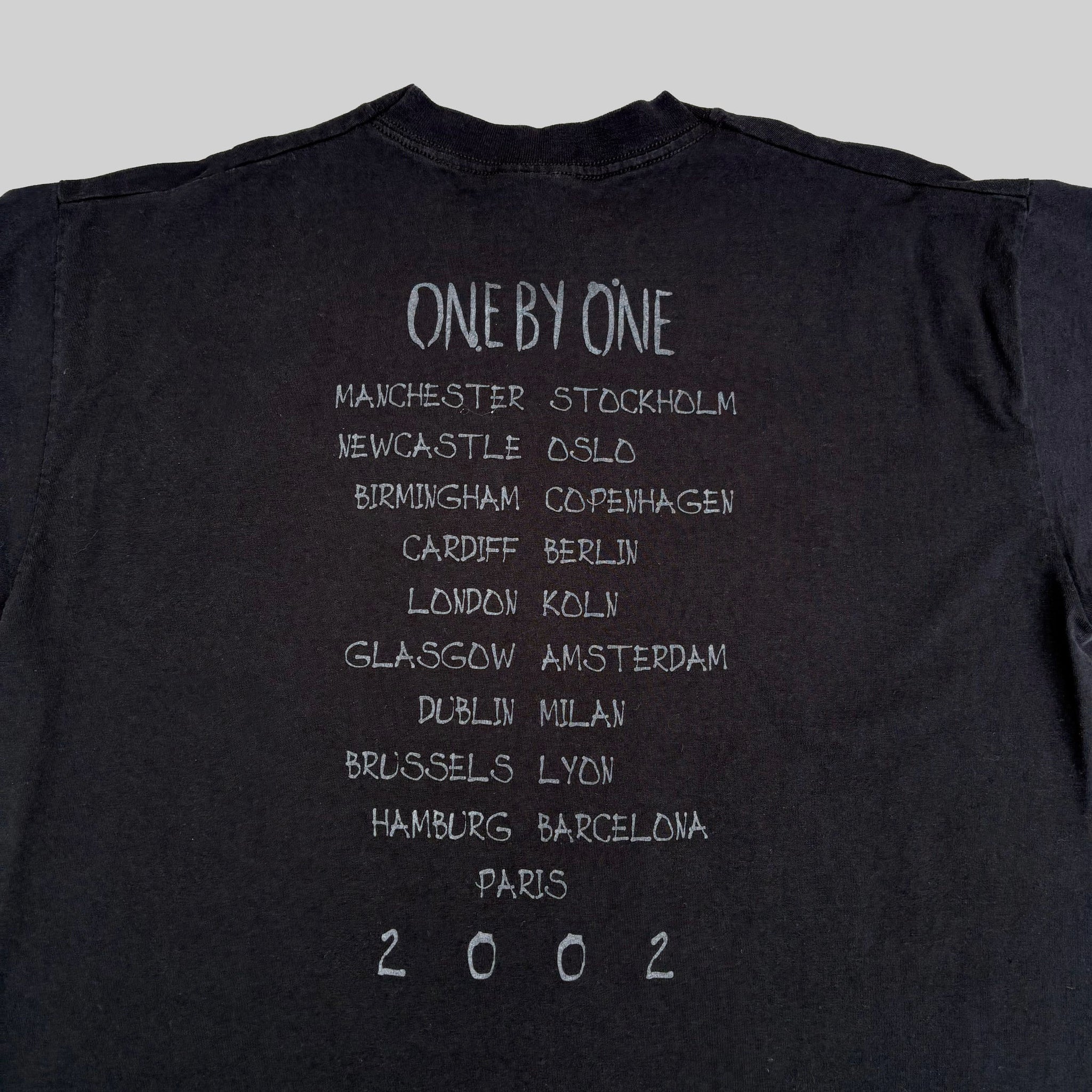 Original 2002 Foo Fighters 'One by One' Euro tour vintage t-shirt, in black cotton with band graphic printed on the chest, Roswell Records logo on the sleeve and tour dates on the back!
