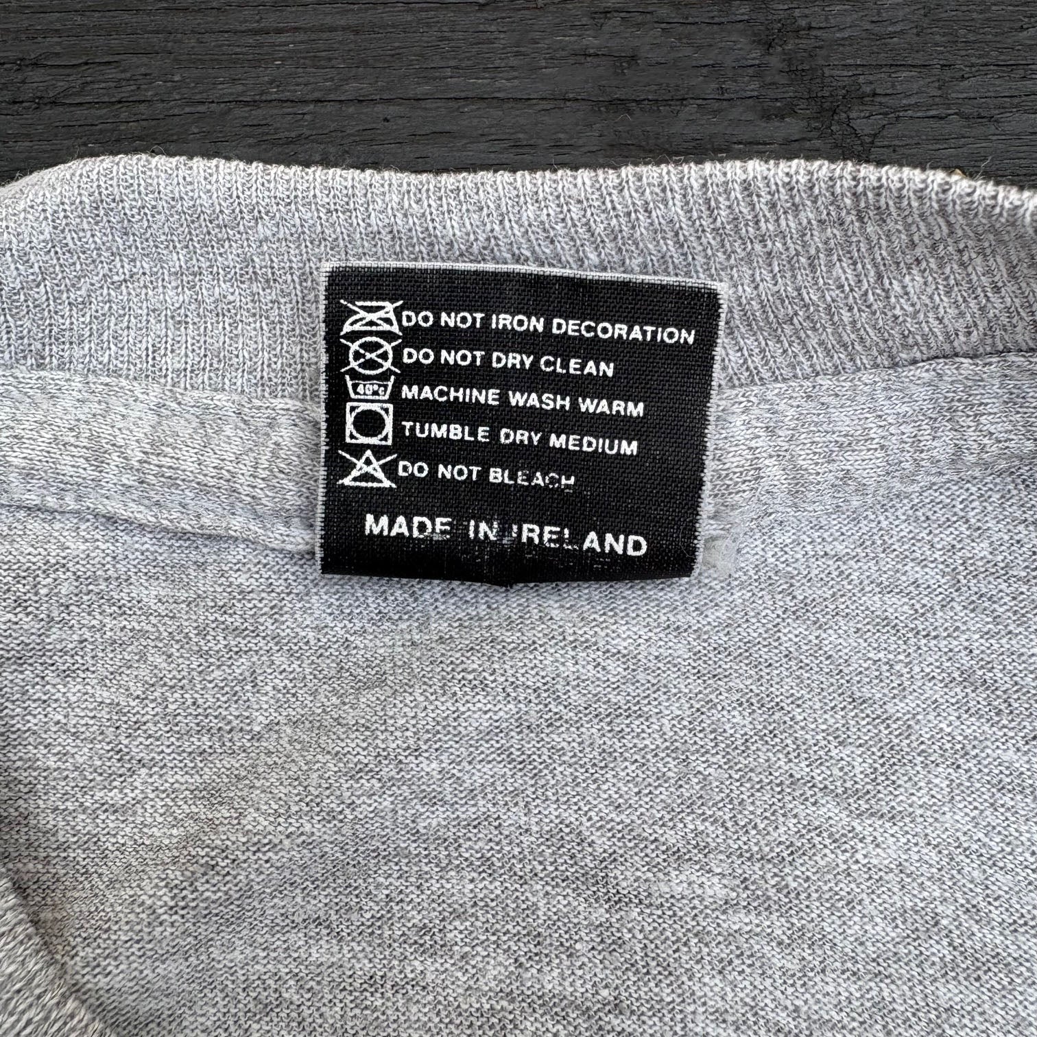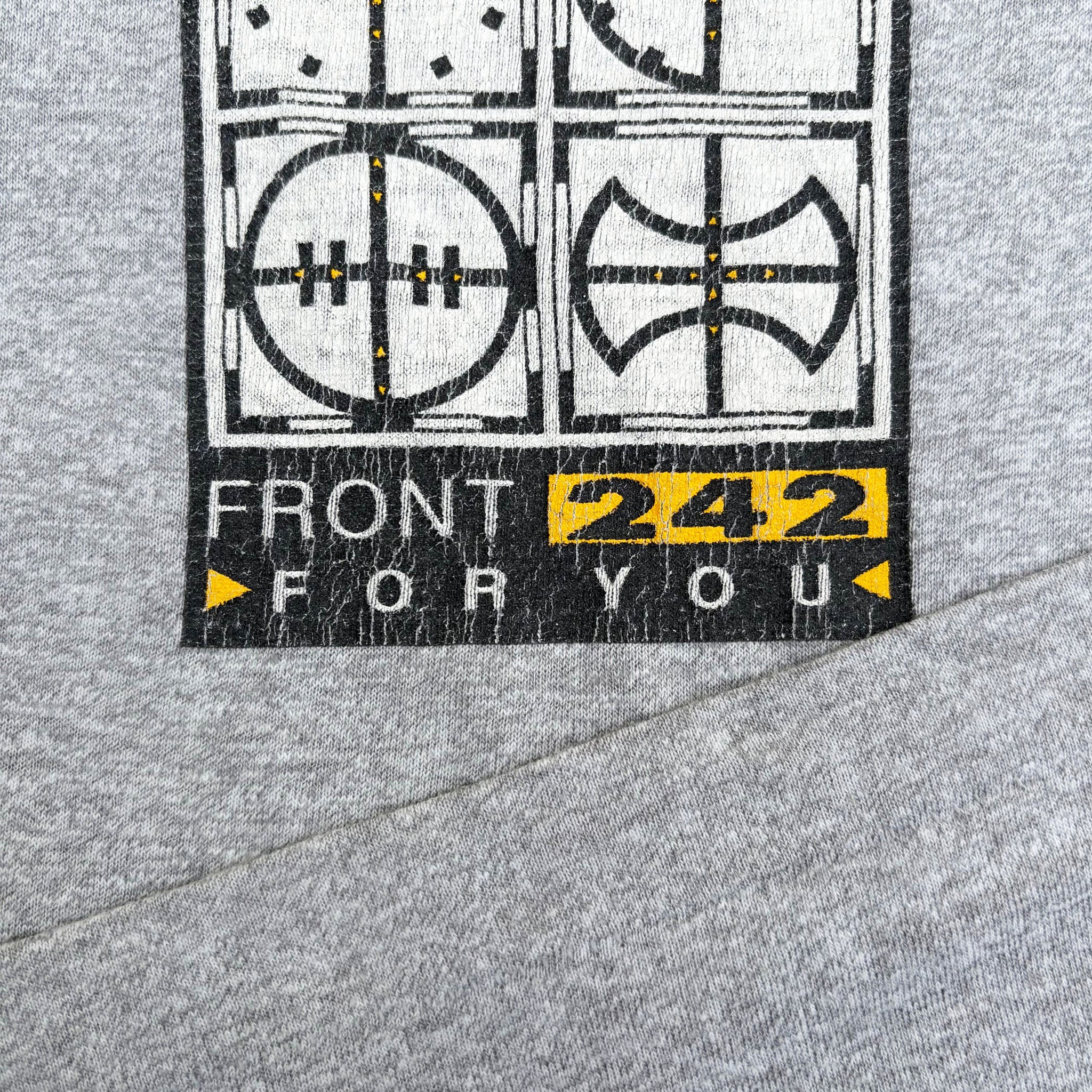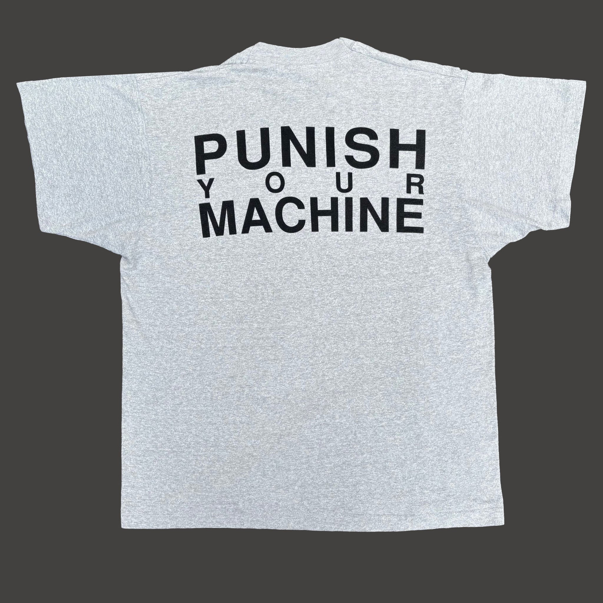 Rare, original 1991 Front 242 'Punish Your Machine' vintage band t-shirt, in heather grey single stitched cotton with graphic logo printed on the front and back.