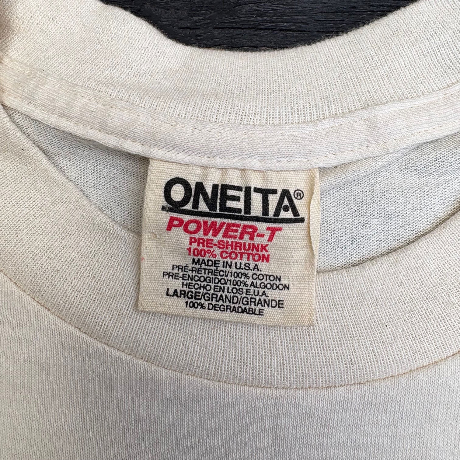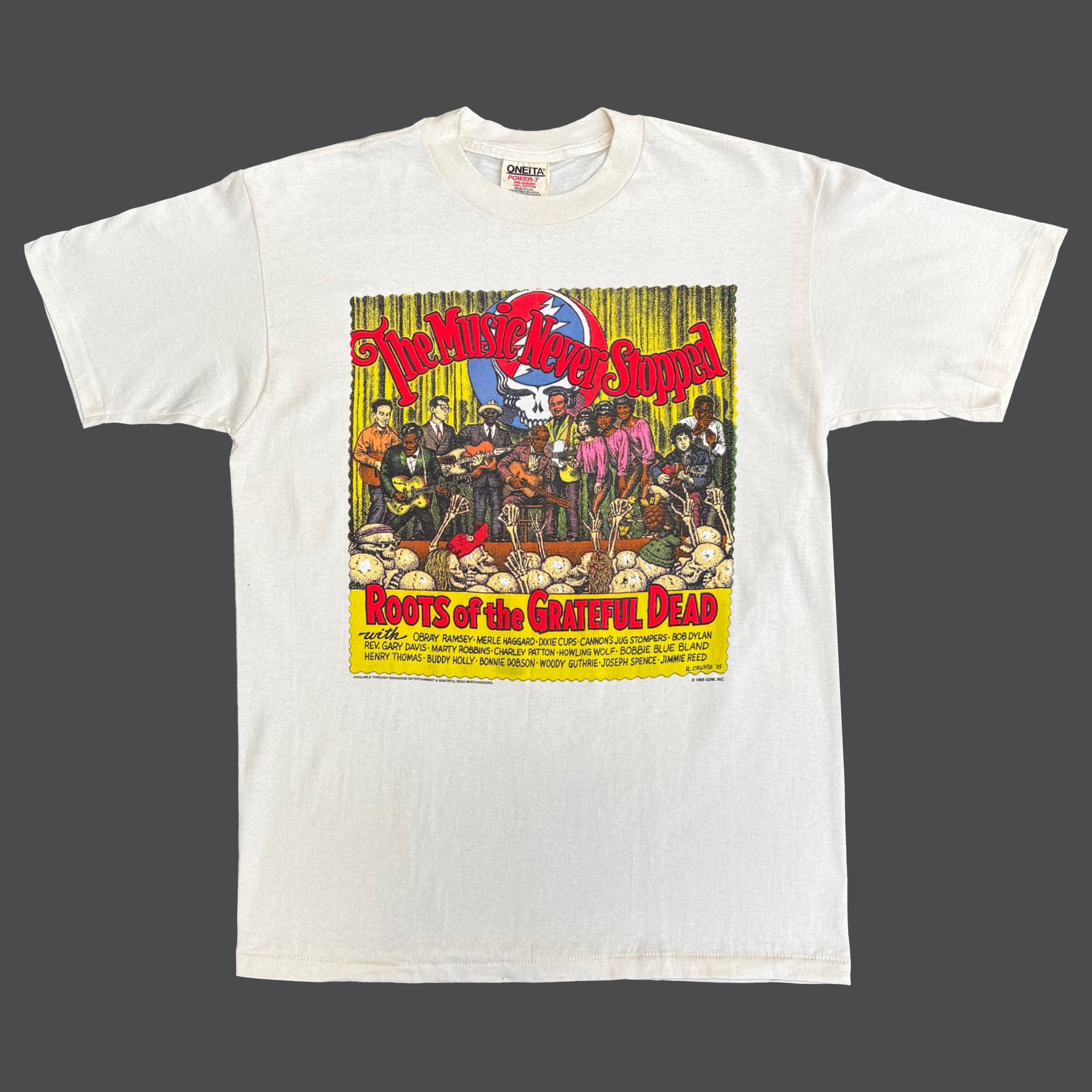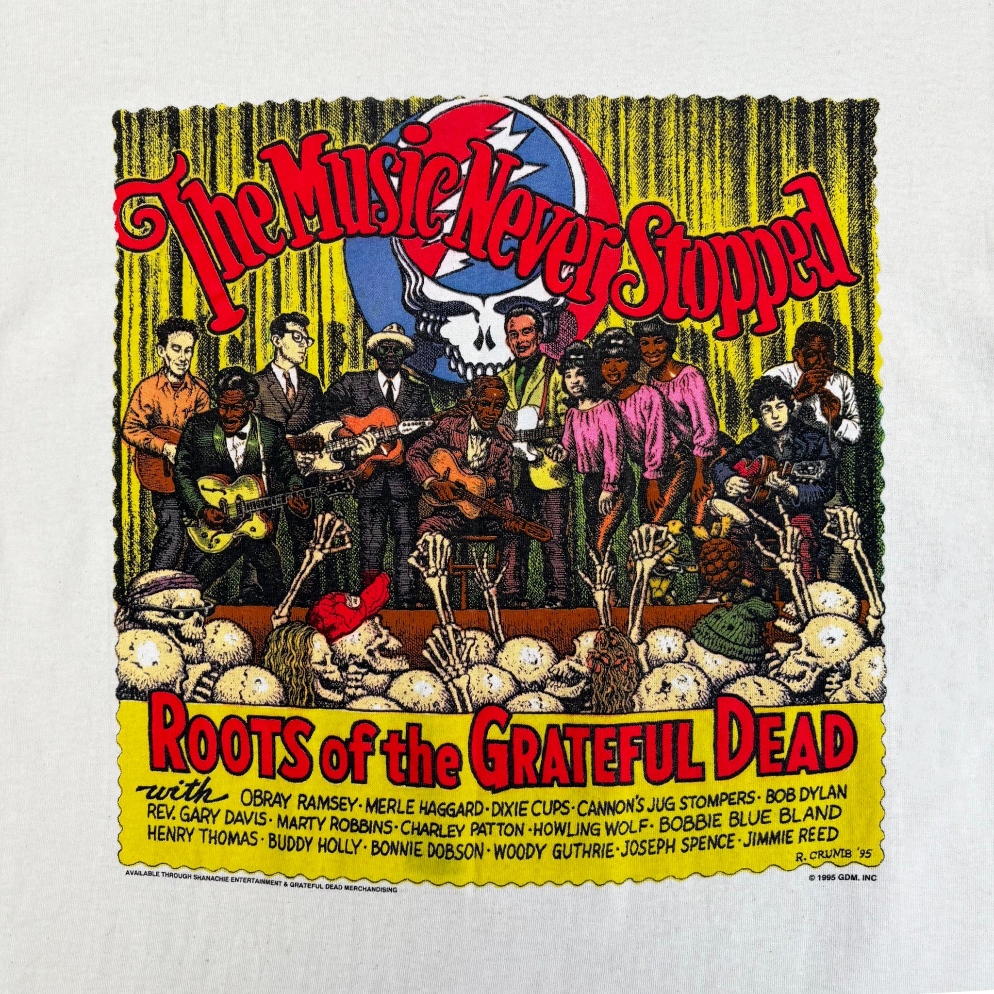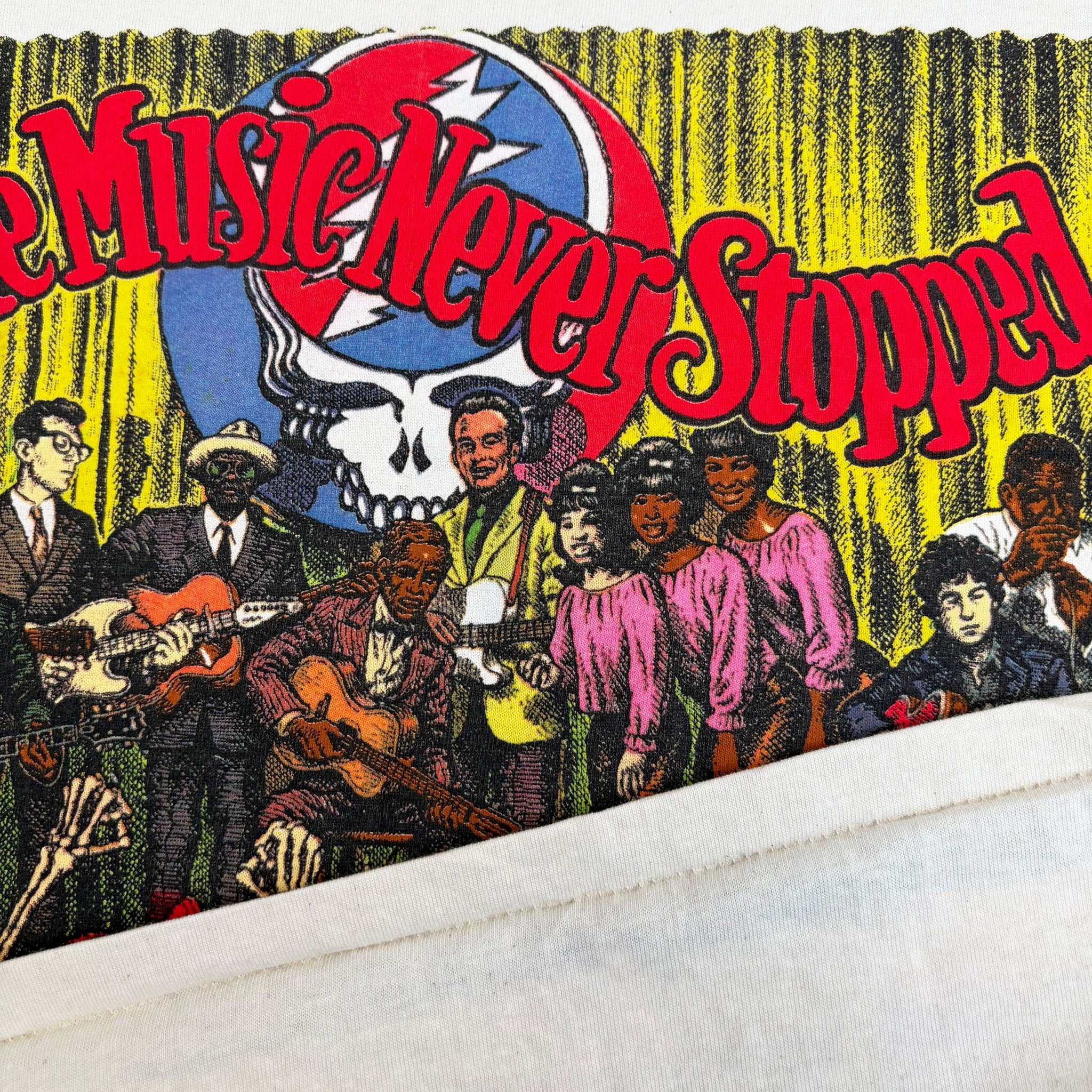 Rare 1995 Grateful Dead 'The Music Never Stopped' vintage t- shirt, in lighe eggshell, white single stitched cotton Robert Crumb original illustration featuring Bob Dylan, Buddy Holly, Woody Guthrie and more.. graphic printed on the chest. Made in USA