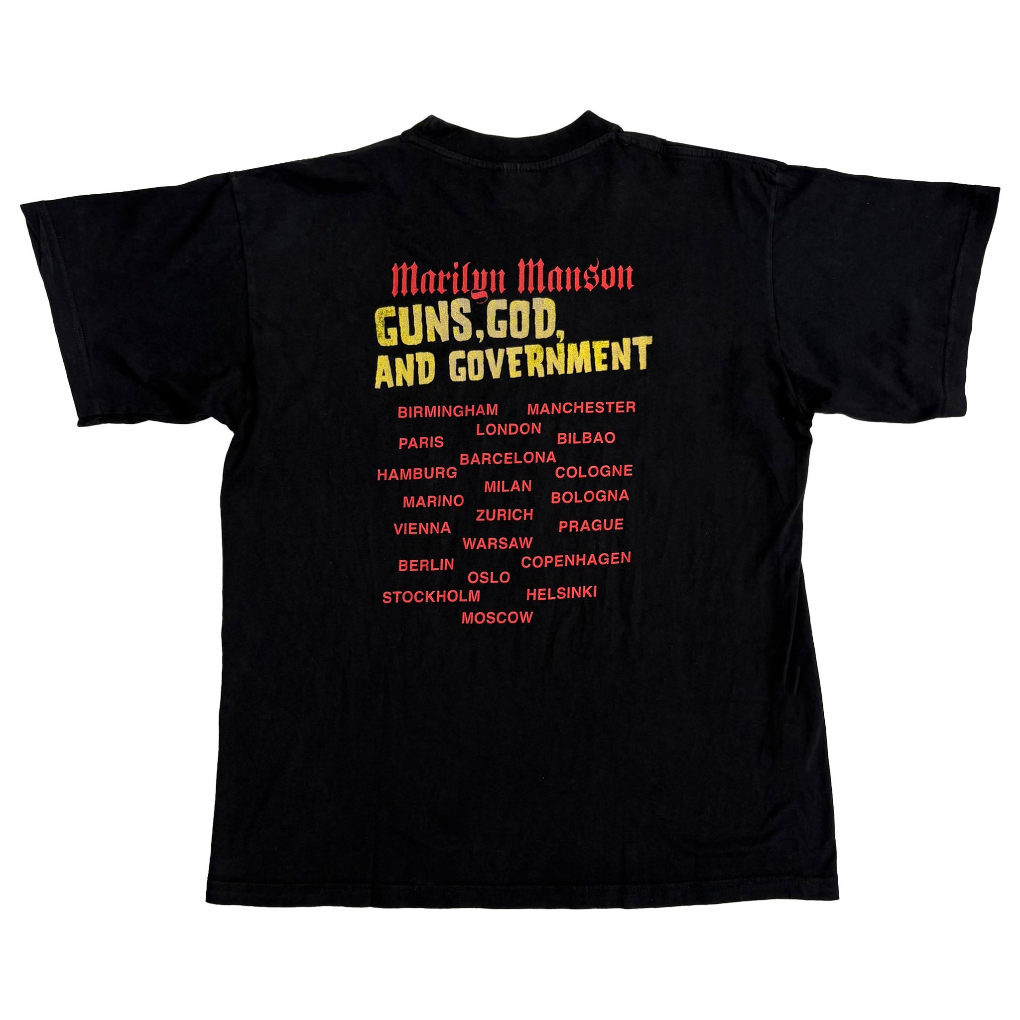 Original 2000 Marilyn Manson 'Guns, God, And Government' European tour vintage t-shirt, in black cotton with band graphic printed on the front and tour dates on the back, Giant licensed. Very rare shirt.