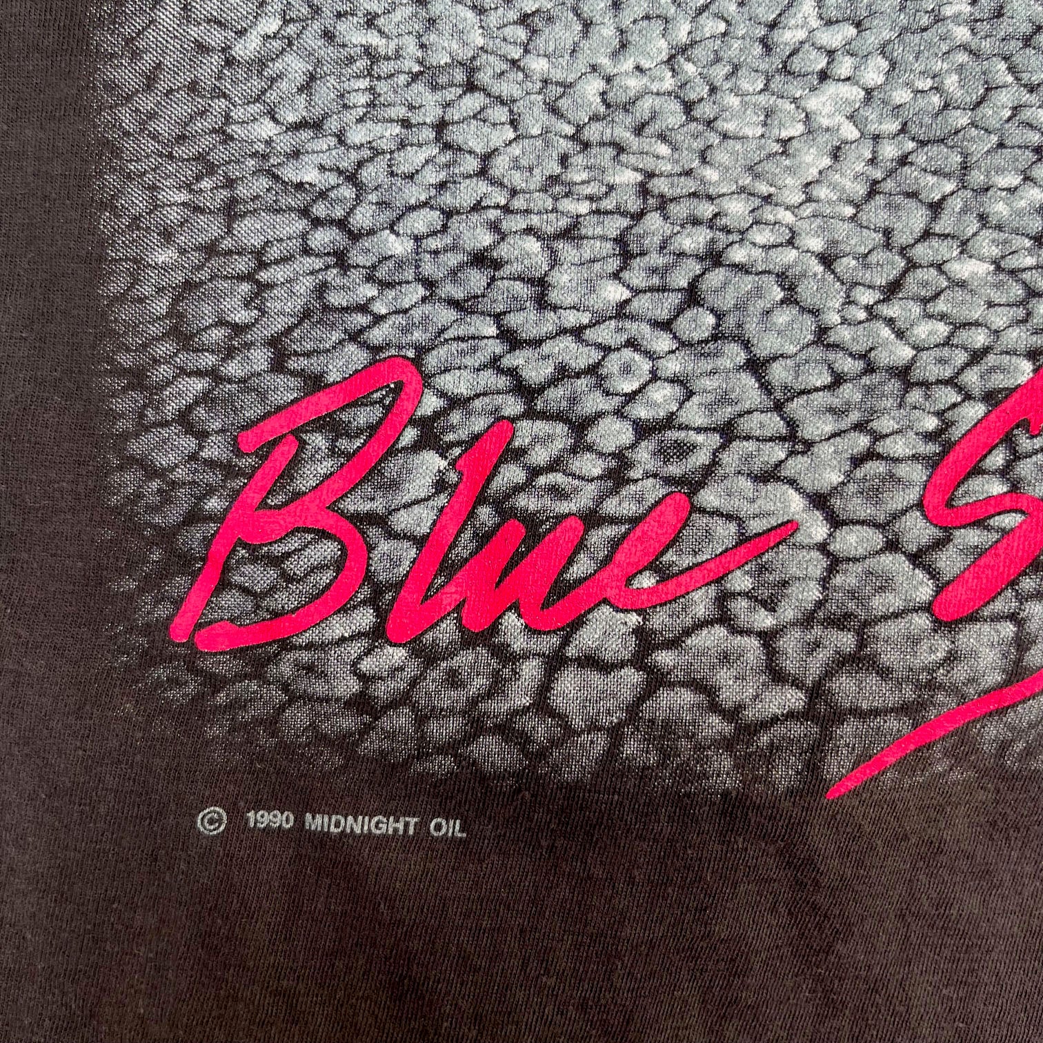 Original 1990 vintage Midnight Oil 'Blue Sky Mining' band t-shirt, in soft black cotton with graphic printed on the front and back.