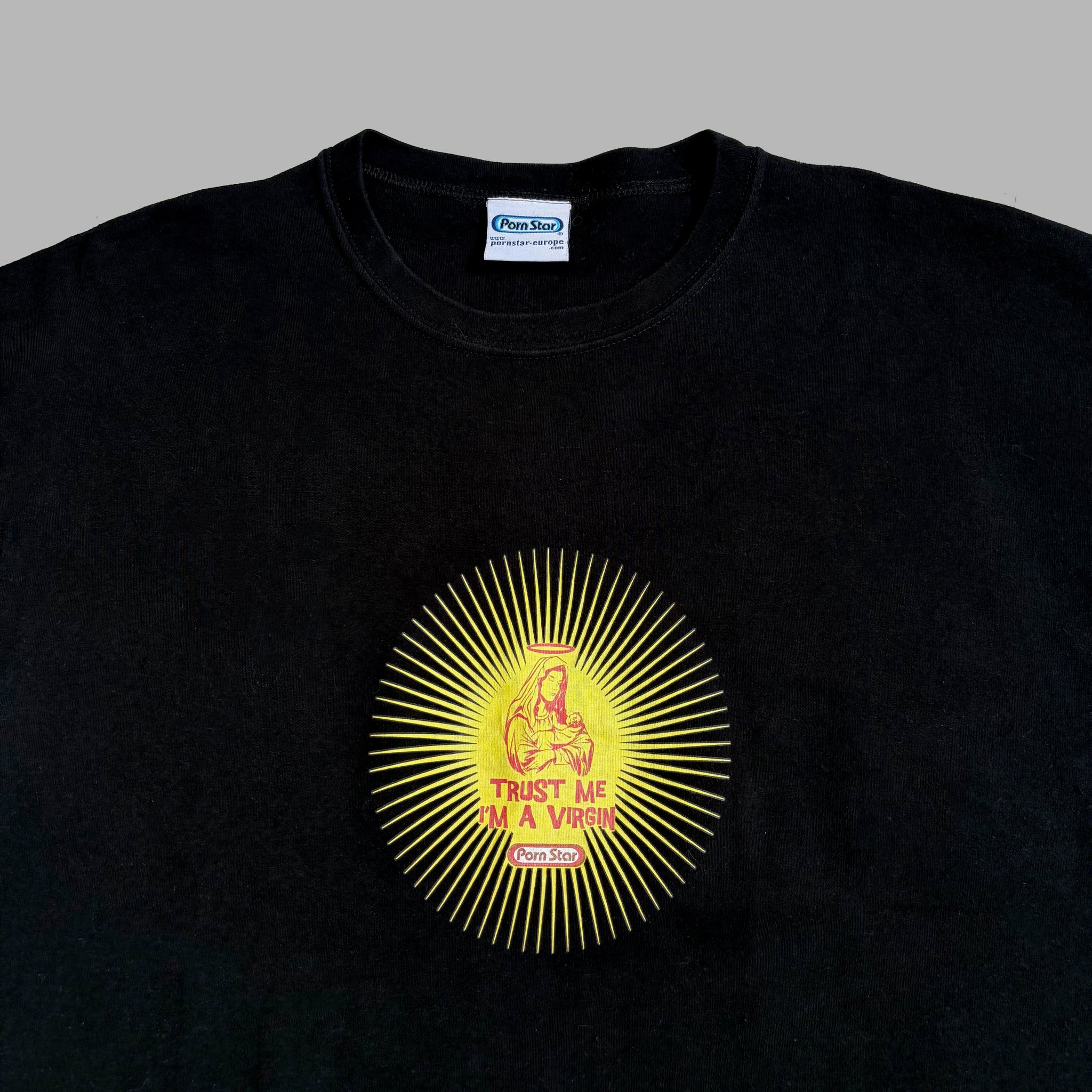 Crazy 1990's original Pornstar 'Trust Me I'm a Virgin' vintage t-shirt, in black cotton with graphic printed on the chest.