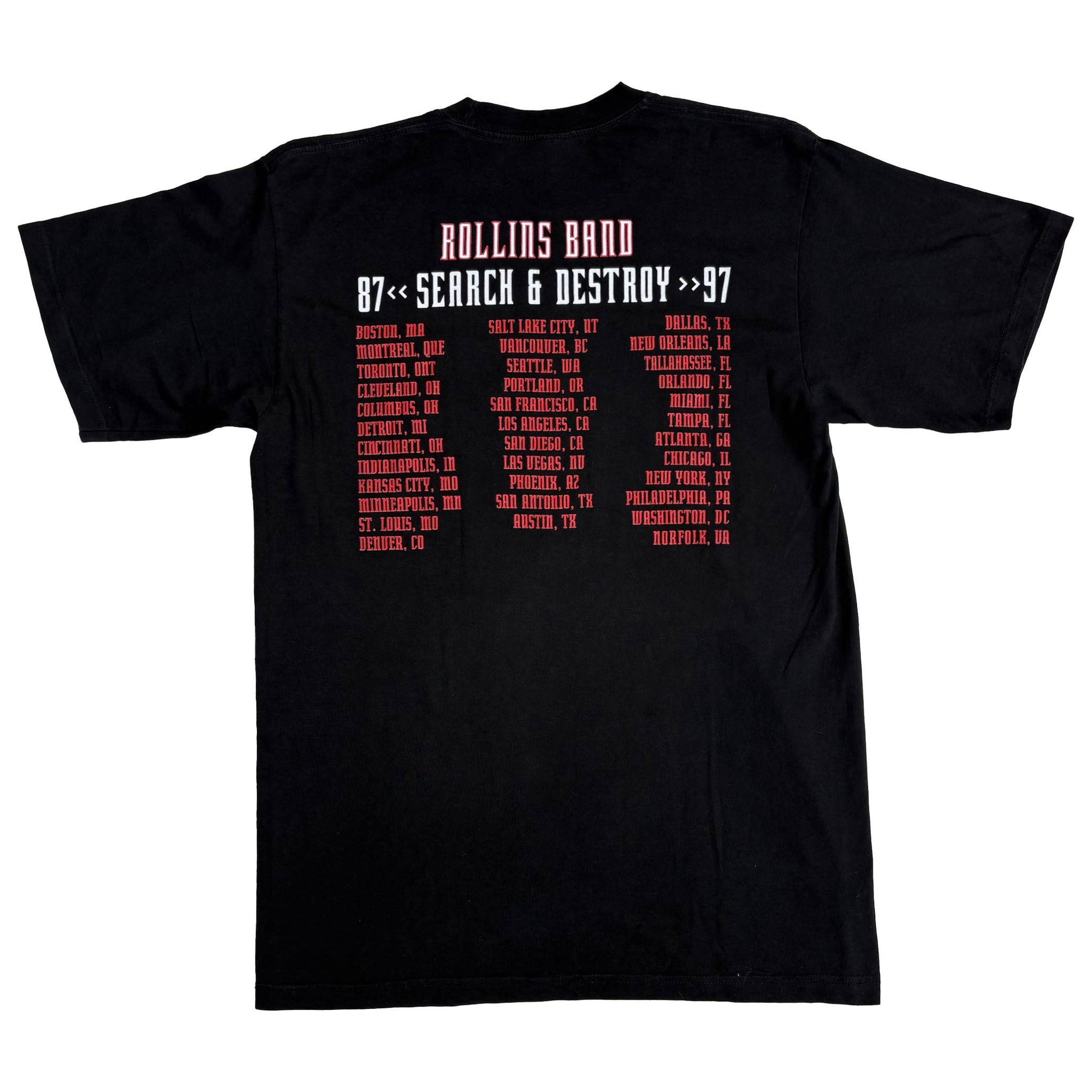 Original 1997 Rollins Band 'Search & Destroy' tour vintage t-shirt, in black cotton with graphic printed on the front and tour dates on the back. Superb piece.