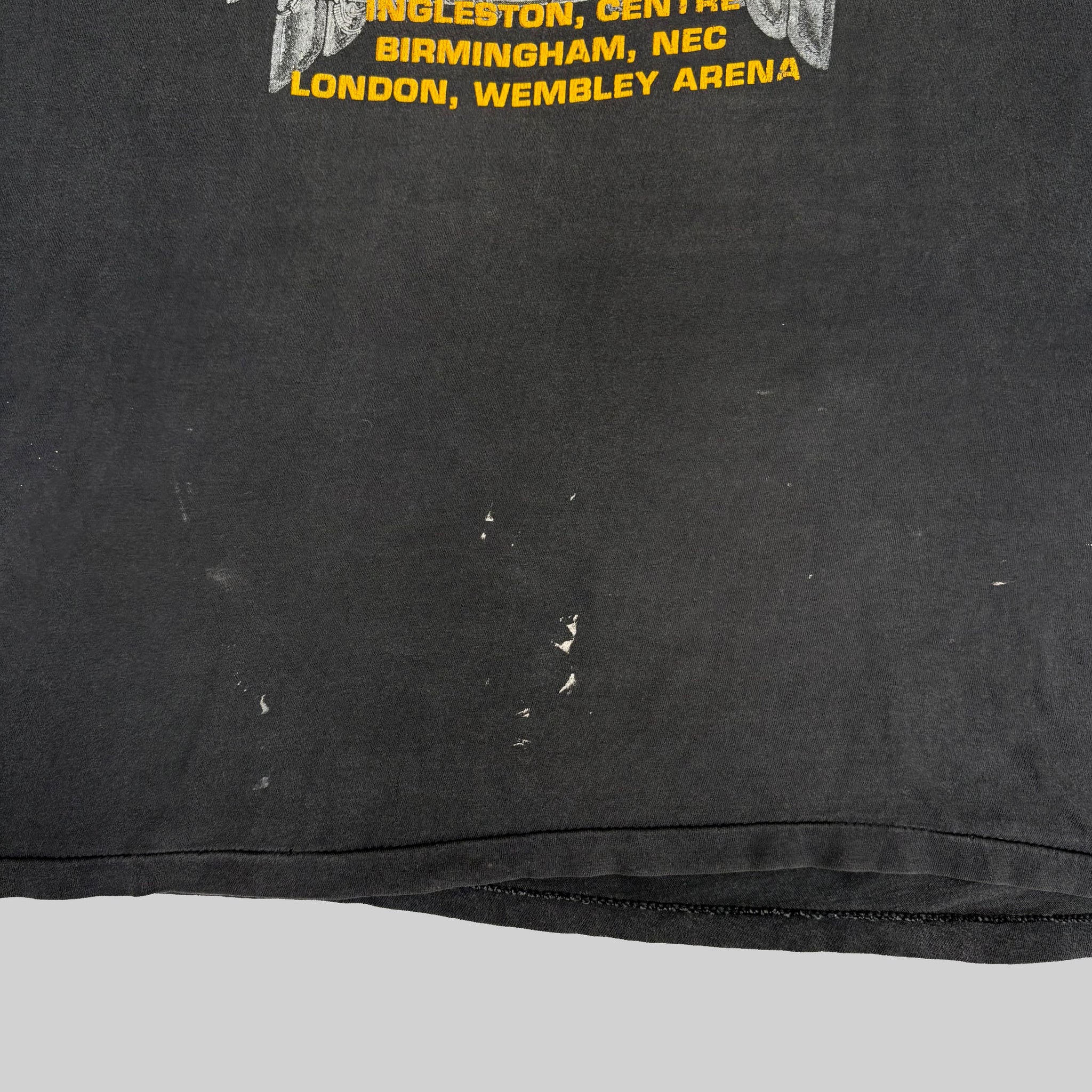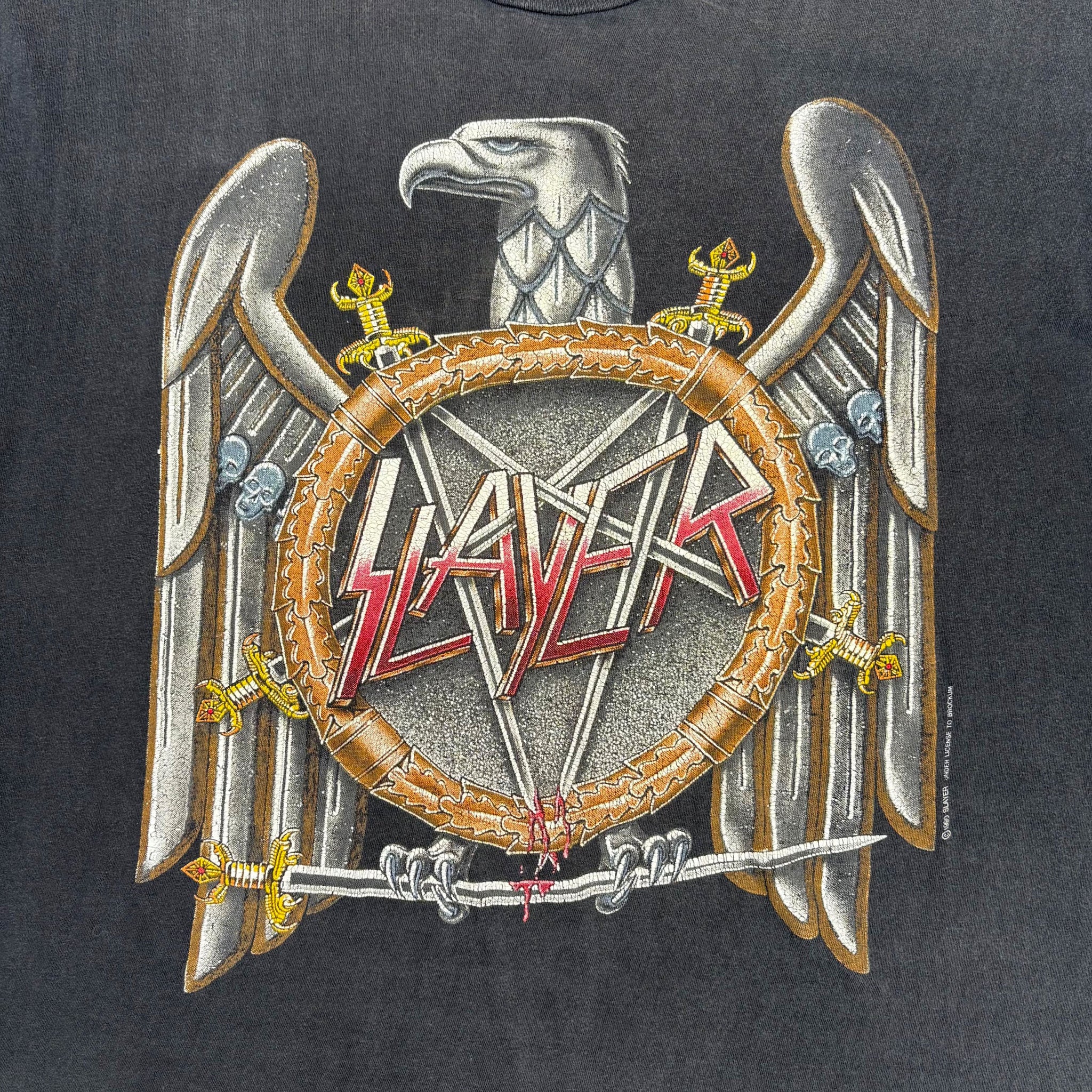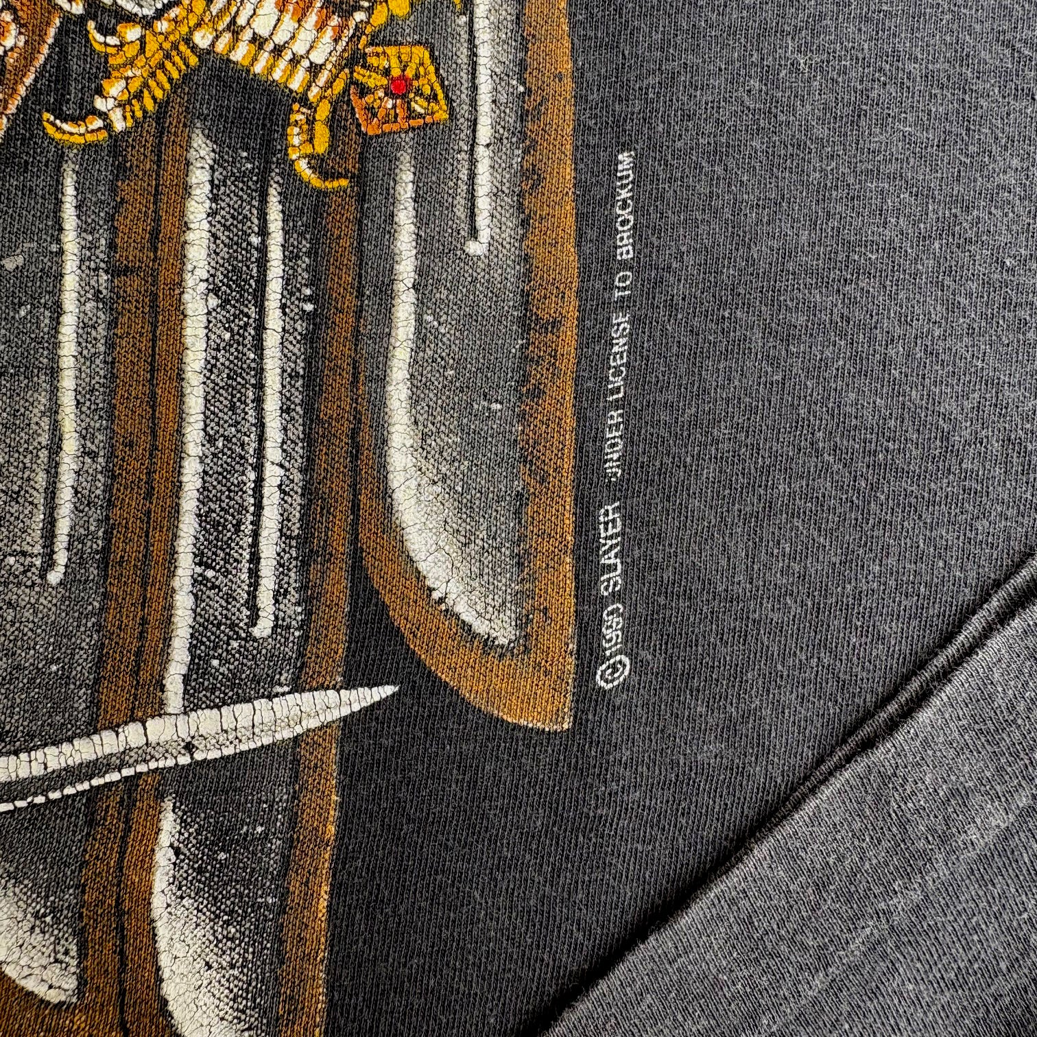 Very rare 1990 Slayer 'European Campaign' vintage band t-shirt, Brockum licensed, in gently faded black single stitched cotton with eagle graphic printed on the chest and tour dates on the back.