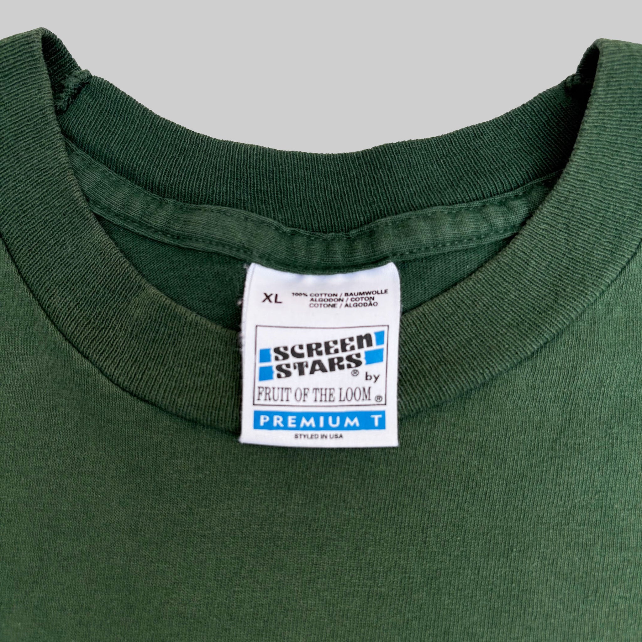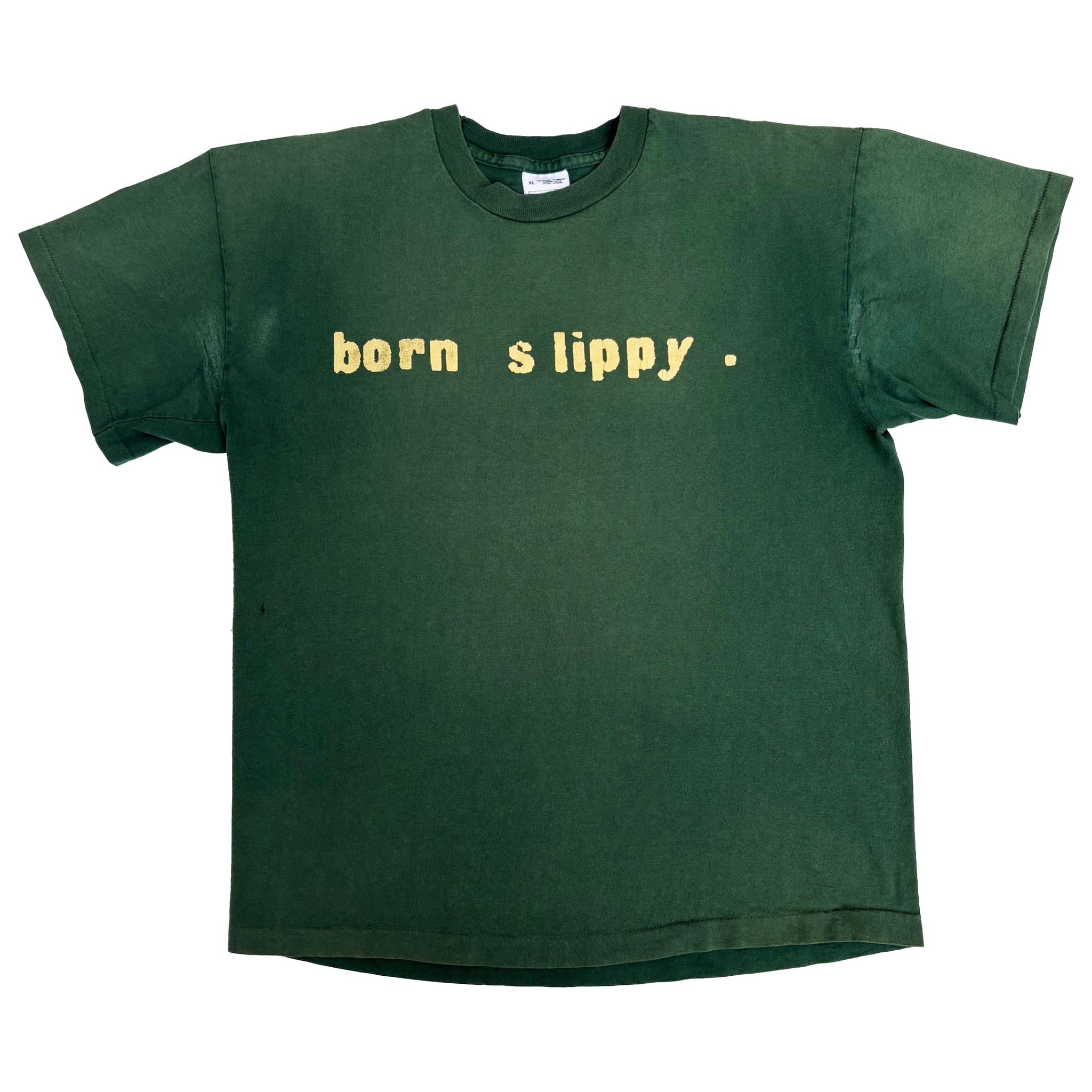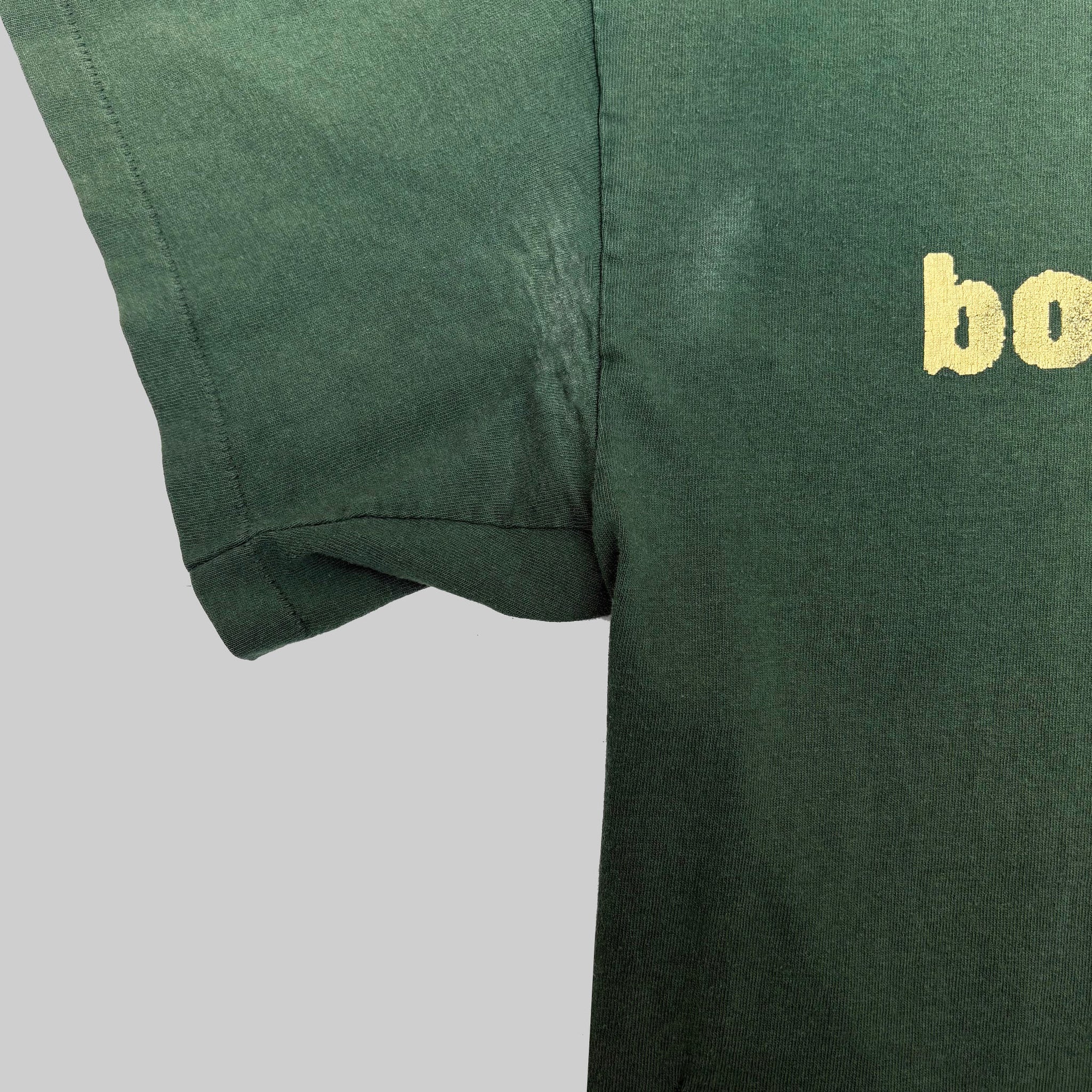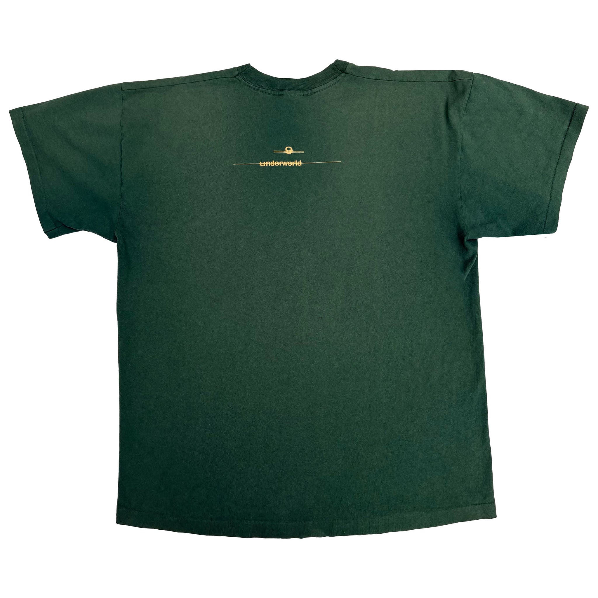 Original 1996 Underworld 'Born Slippy' vintage band t-shirt, in green single stitched cotton with graphic printed on the chest and band logo printed on the upper back.