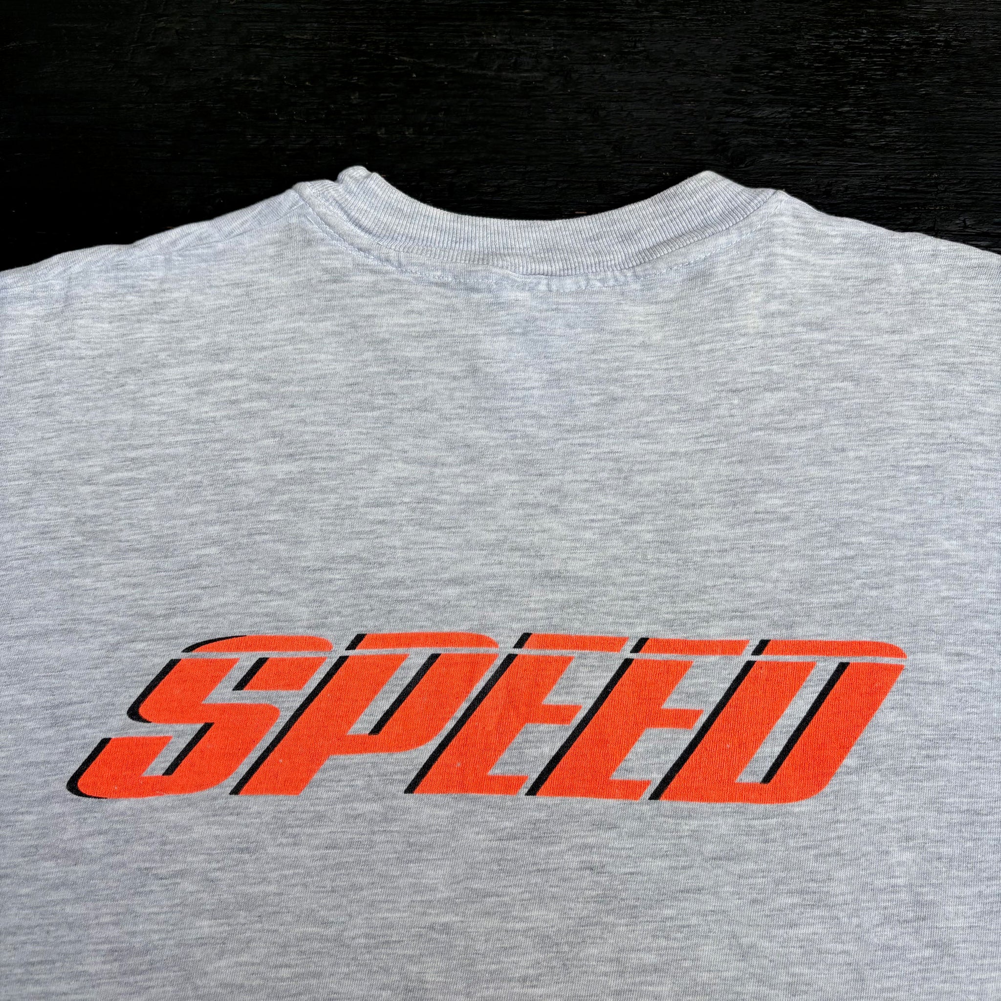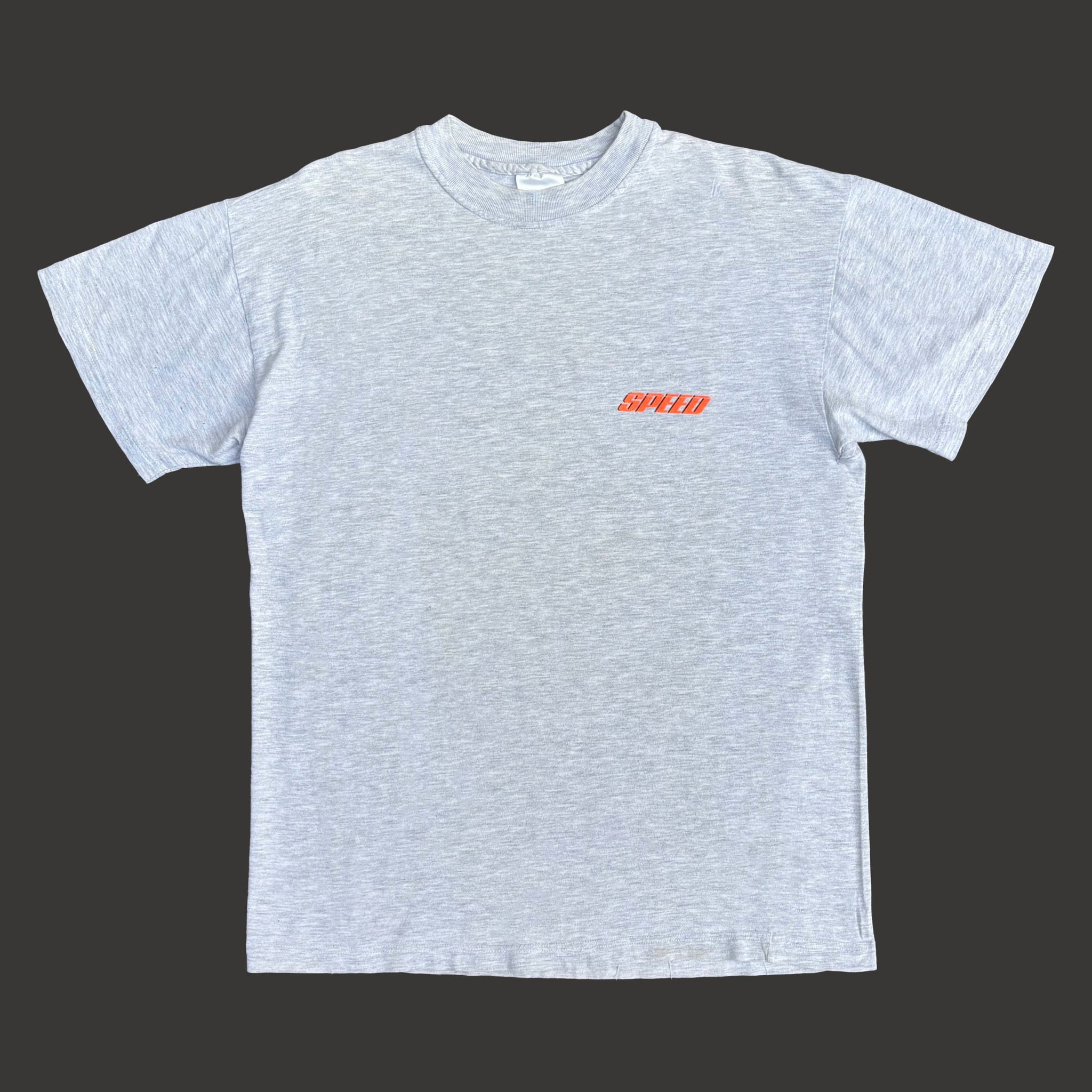 Rare 1994 Speed movie vintage promo t-shirt, in heather grey cotton with movie font graphic printed on the chest and back in bright orange.