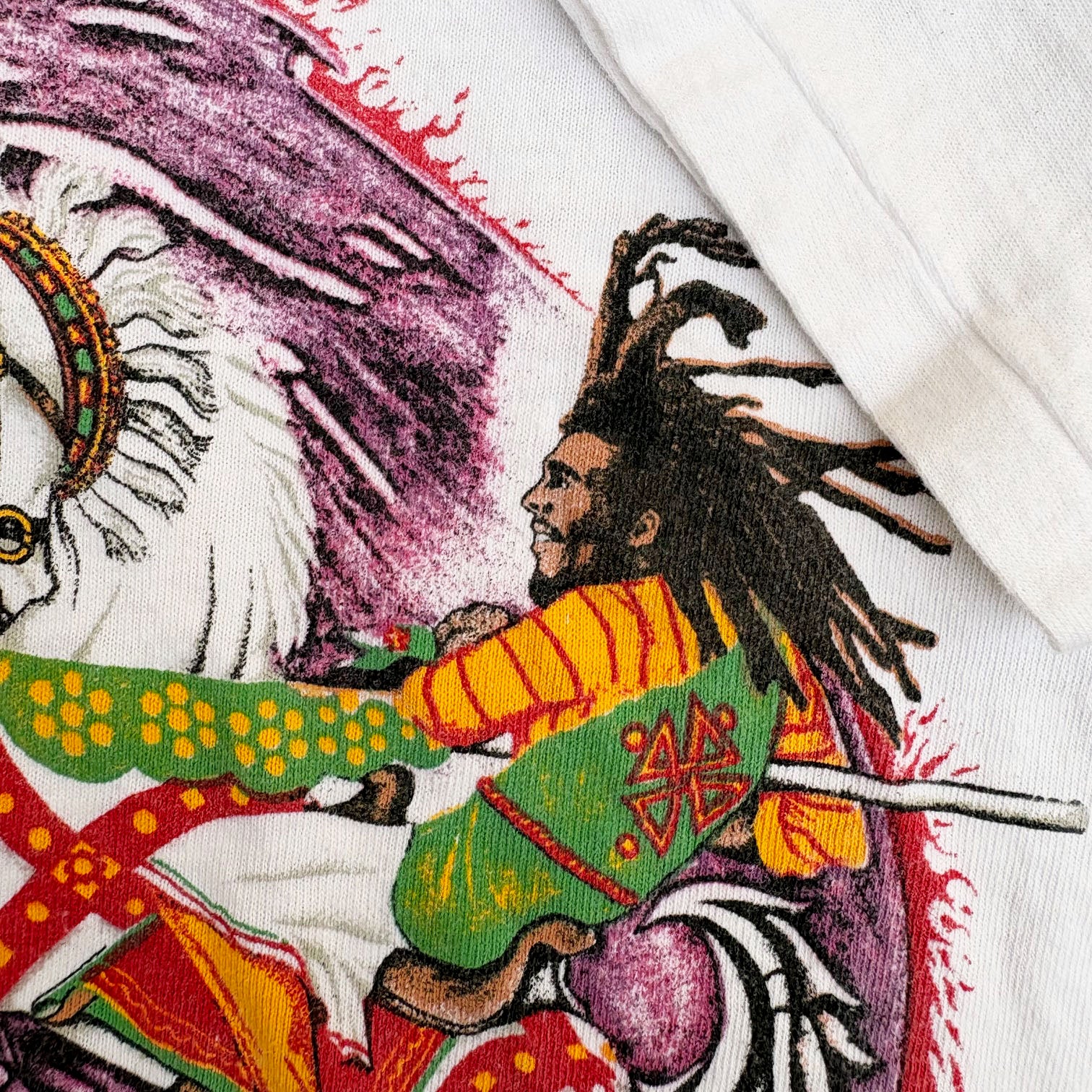 Extremely rare 1983 Bob Marley and The Wailers 'Confrontation' vintage band t-shirt, in white single stitched cotton with album cover graphic printed on the front.