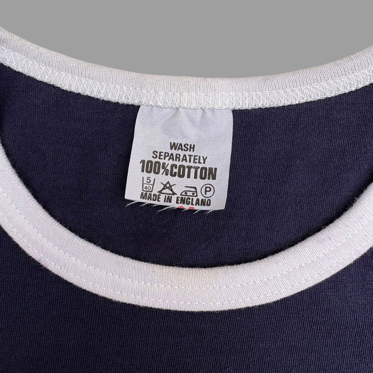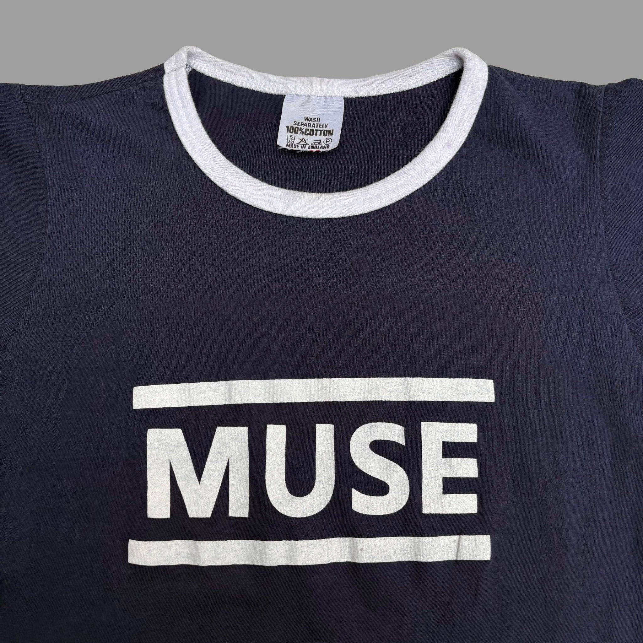 Rare original 1999 Muse 'Showbiz' vintage girl top ringer t-shirt, in navy blue cotton with white details and graphic logo printed on the front and back. Great piece. Made in England