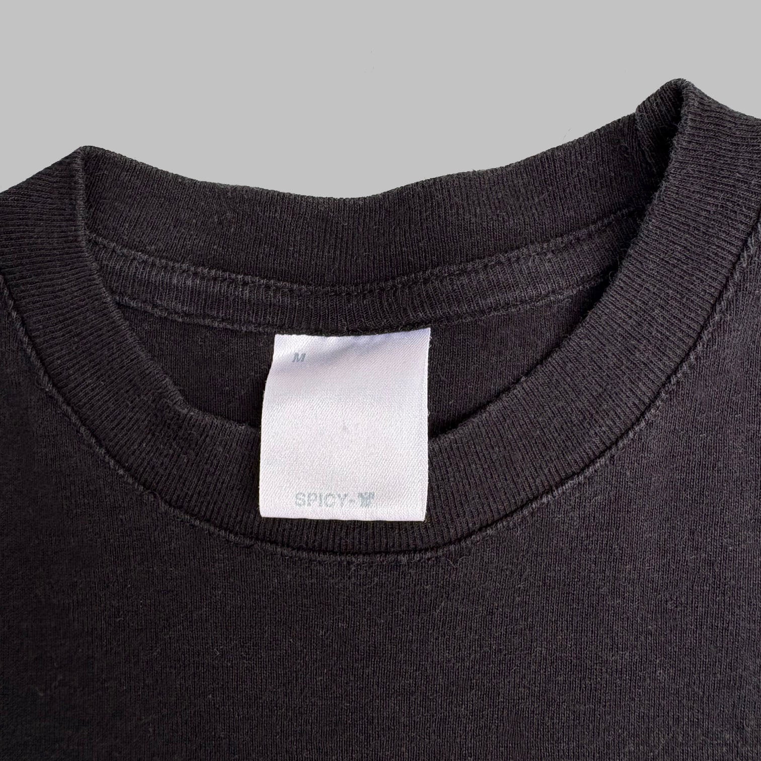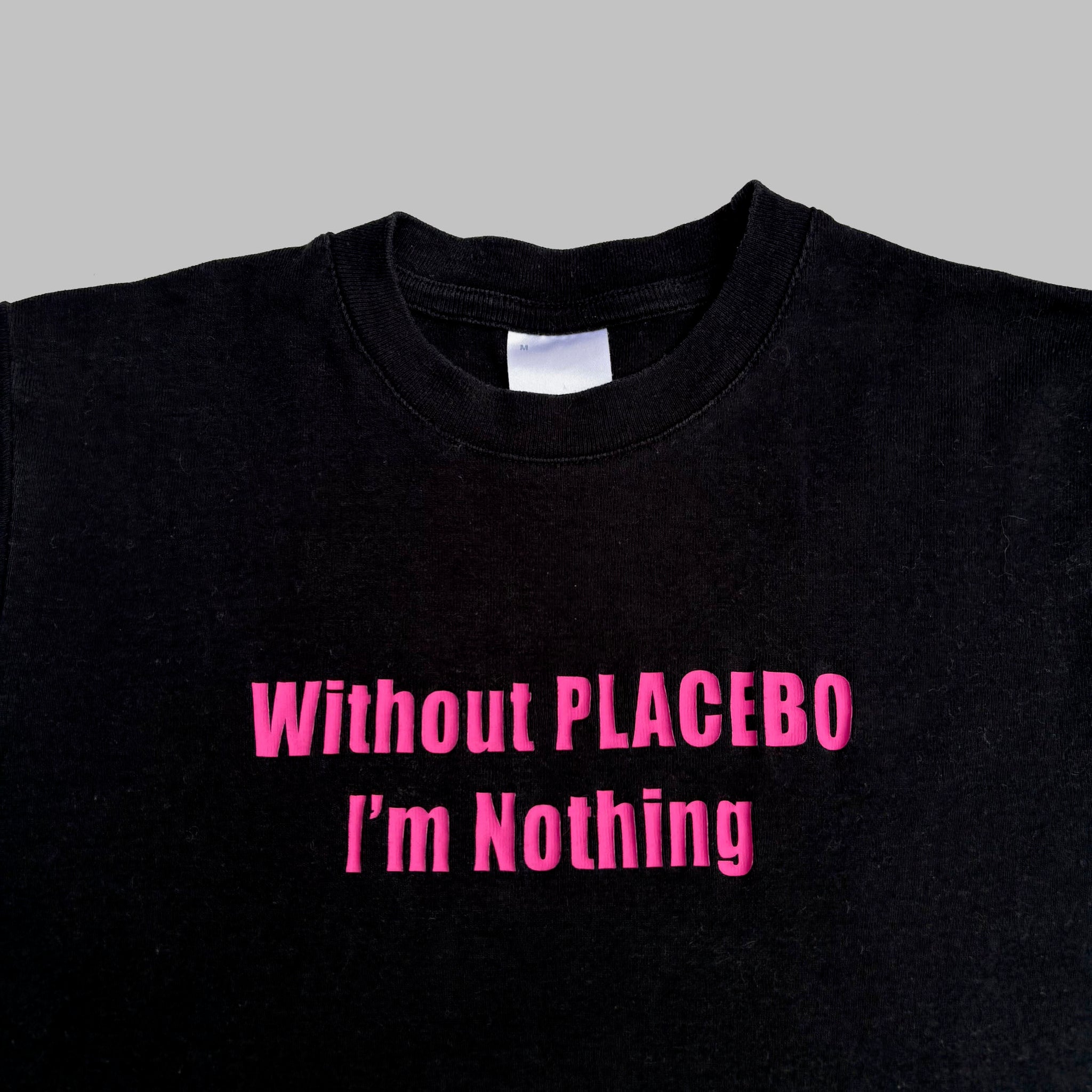 Rare original late 1990's Placebo 'Without Placebo I'm Nothing' vintage girl top t-shirt, in black cotton with pink quote graphic printed on the front.