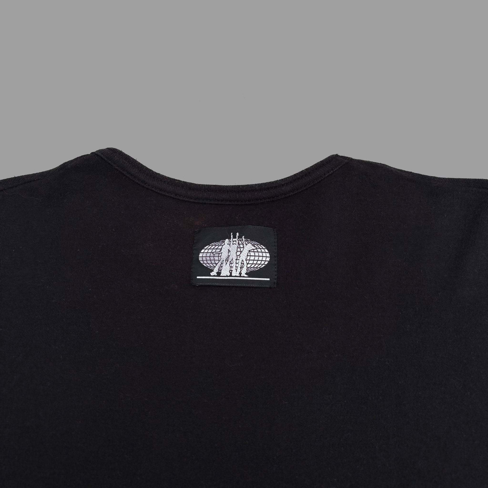 Original 1999 Supergrass vintage girl top concert t-shirt, in black cotton with band graphic printed on the front and small patch on the upper back. Very rare.