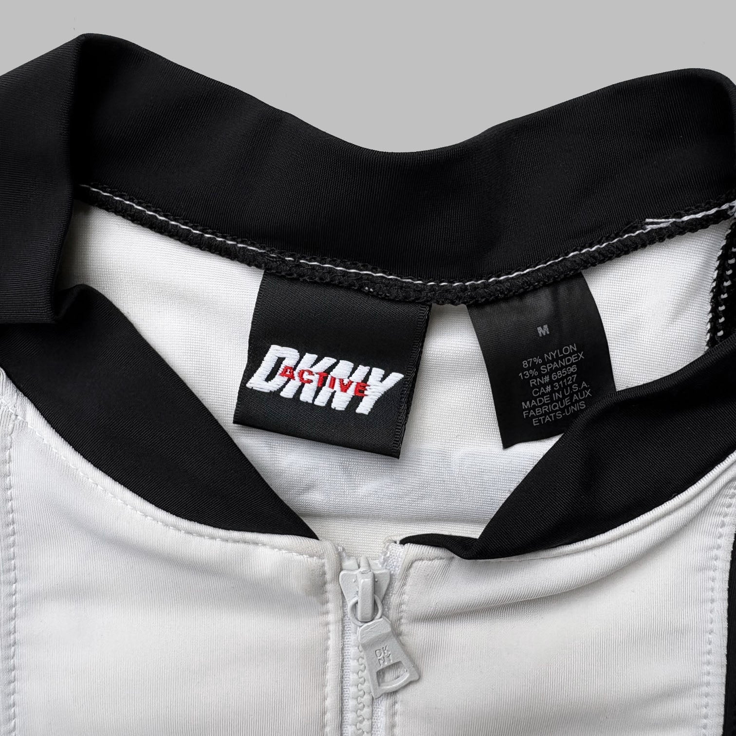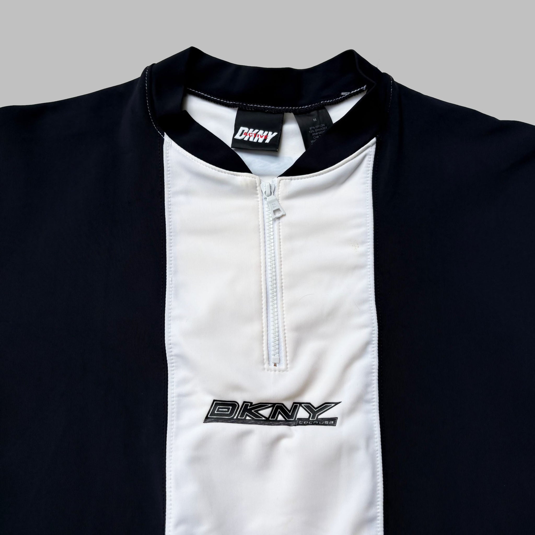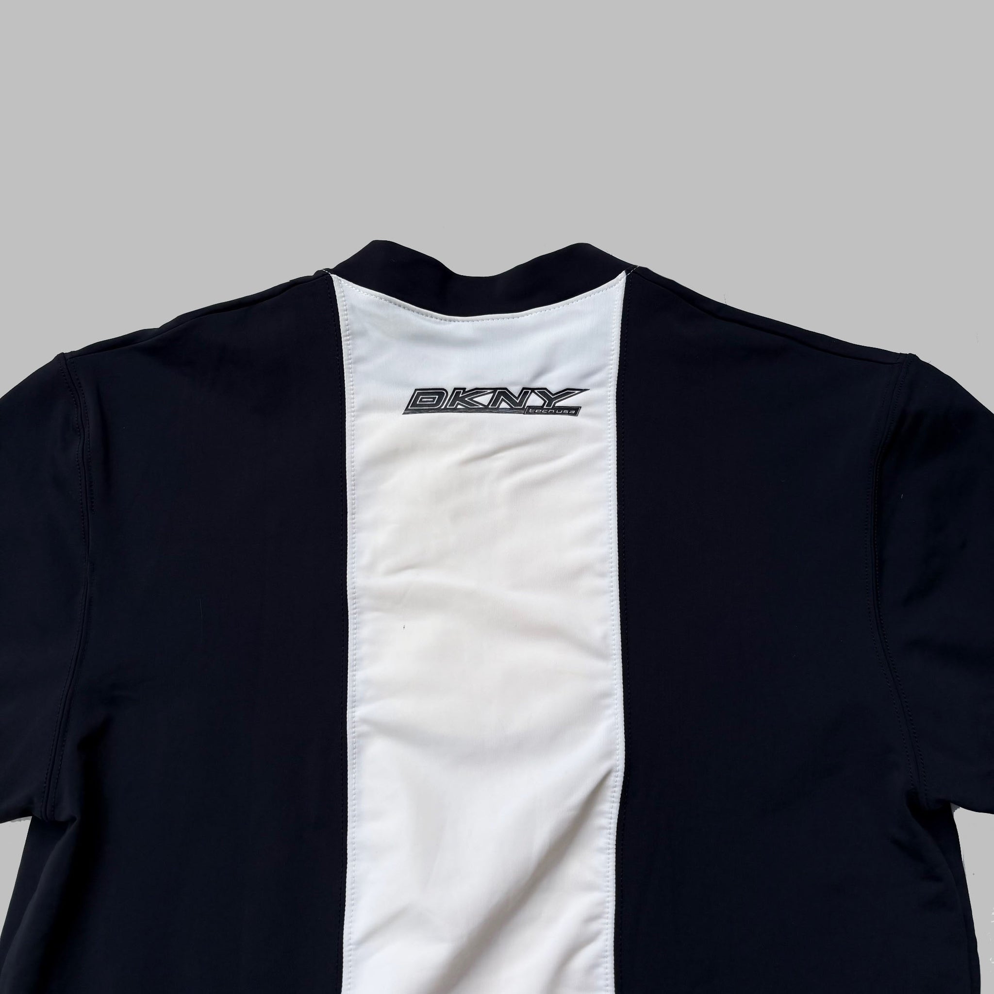 Rare 1990's DKNY 'Tech USA' vintage sport t-shirt, in black and white with graphic logos on the chest and upper back, zipped collar. Made in USA