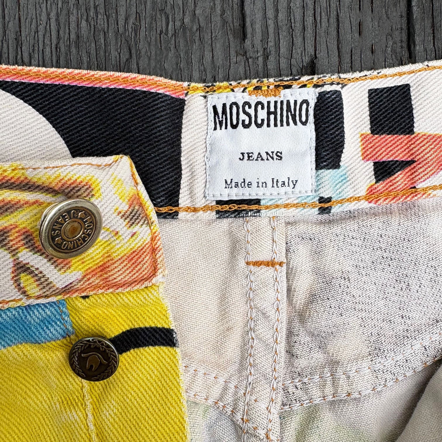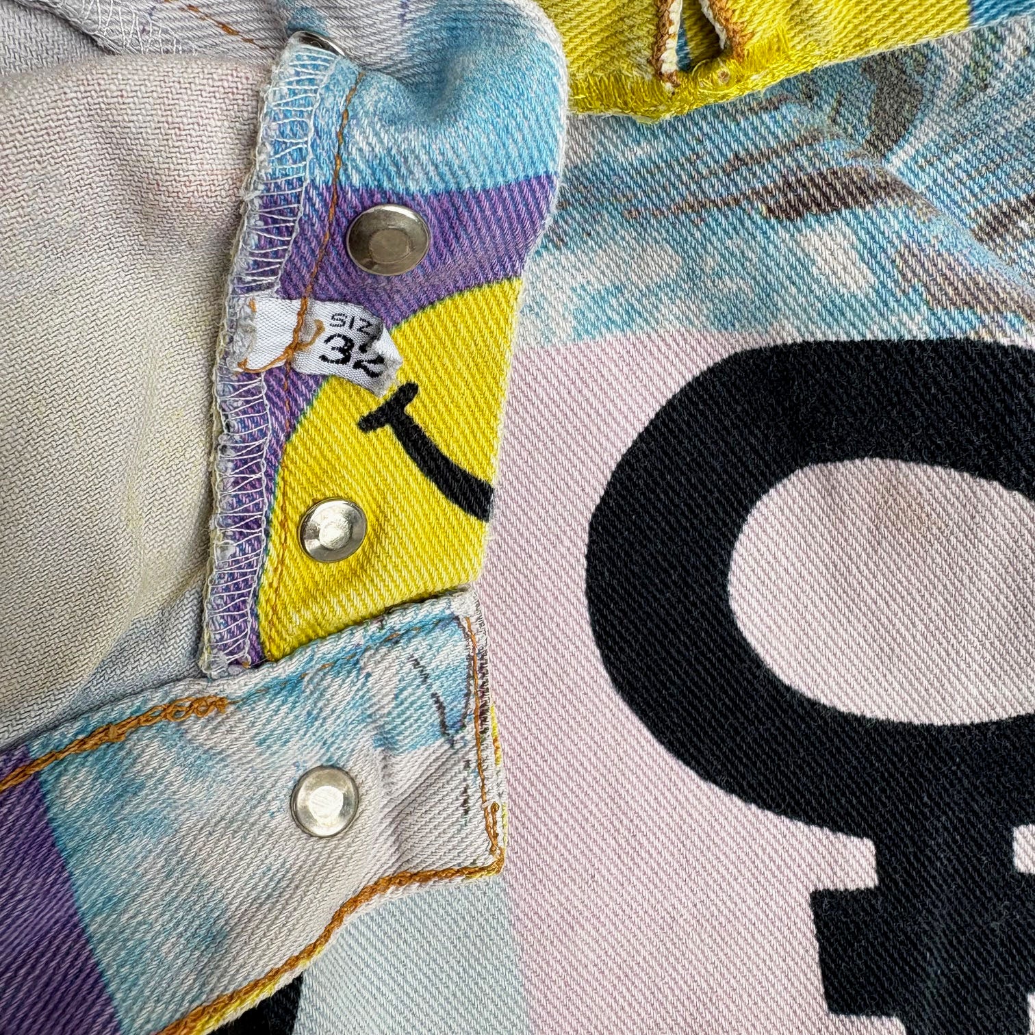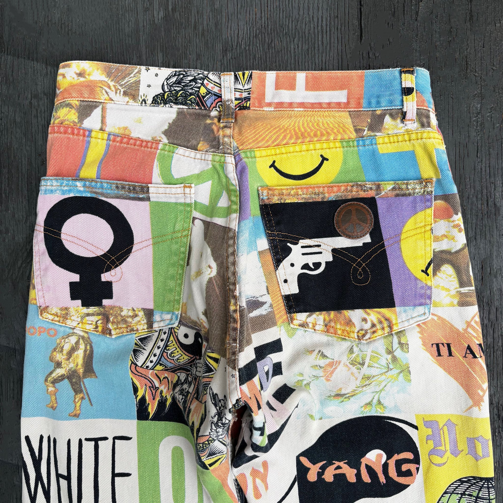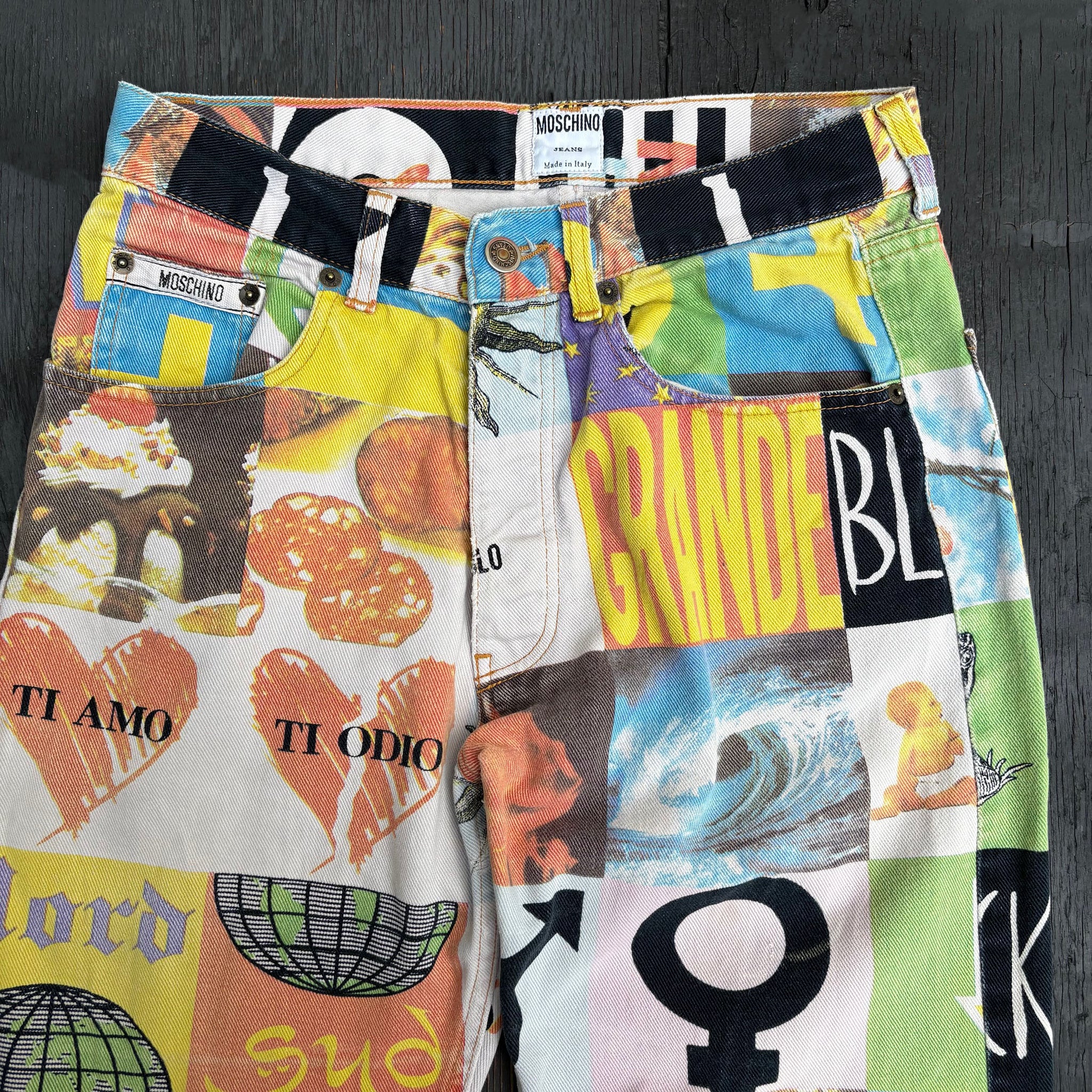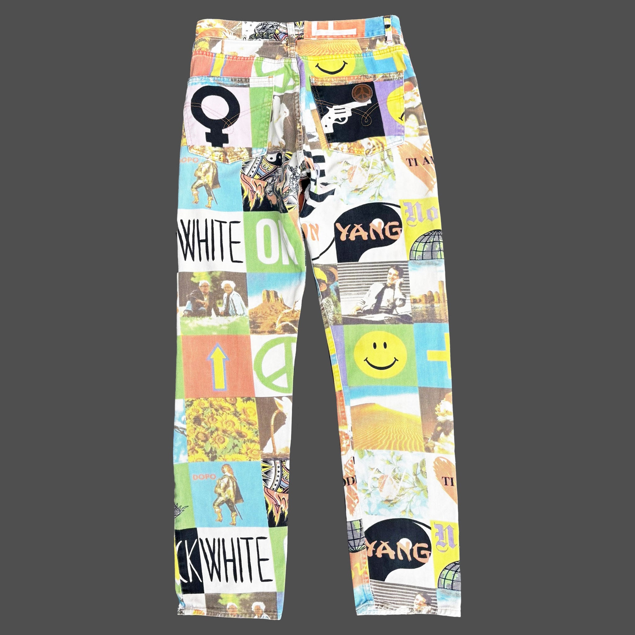 Vintage pair of 1990's authentic Moschino 'Opposites' designer denim jeans, in all over denim with peace patch and multiple great details. Minor signs of wear. Button fly.