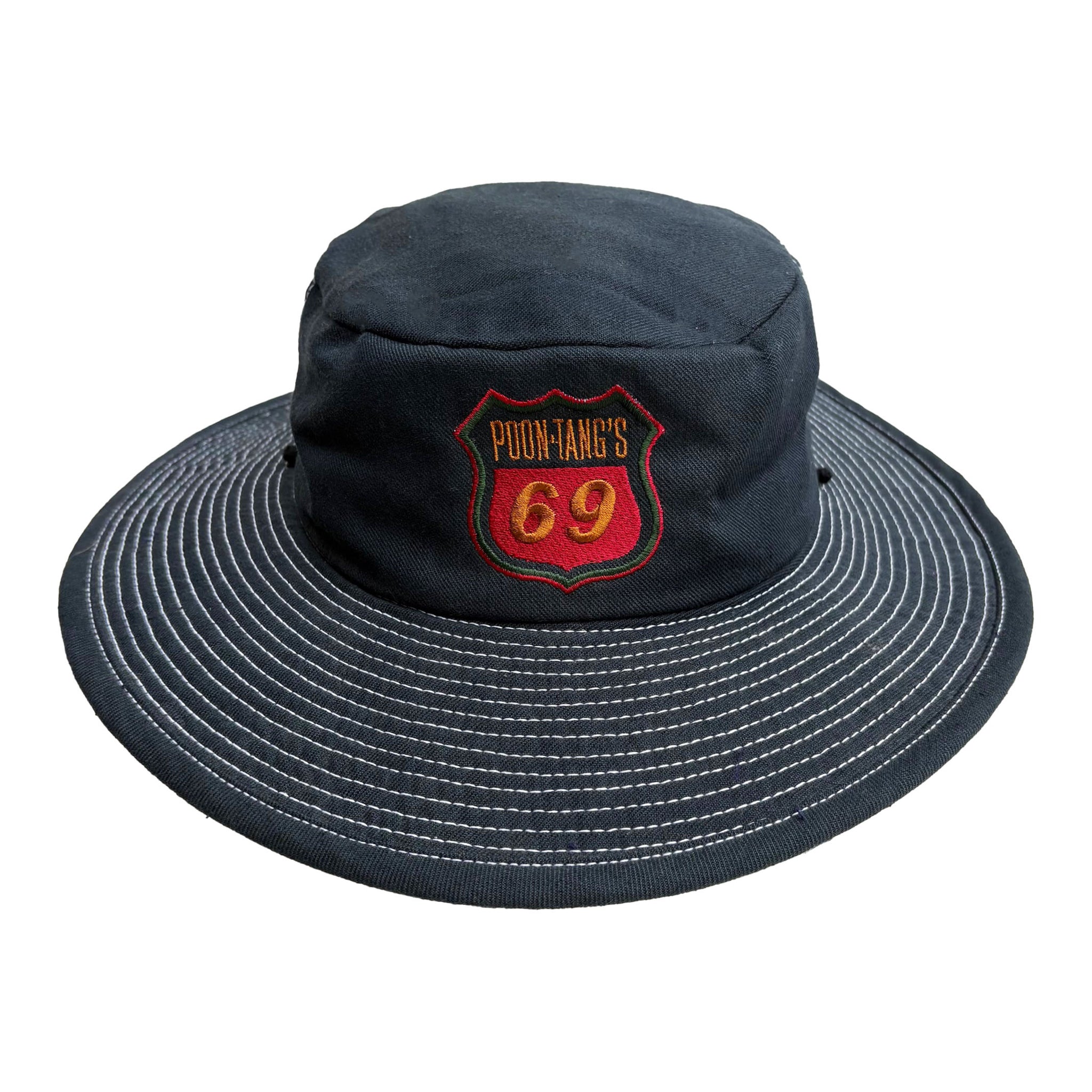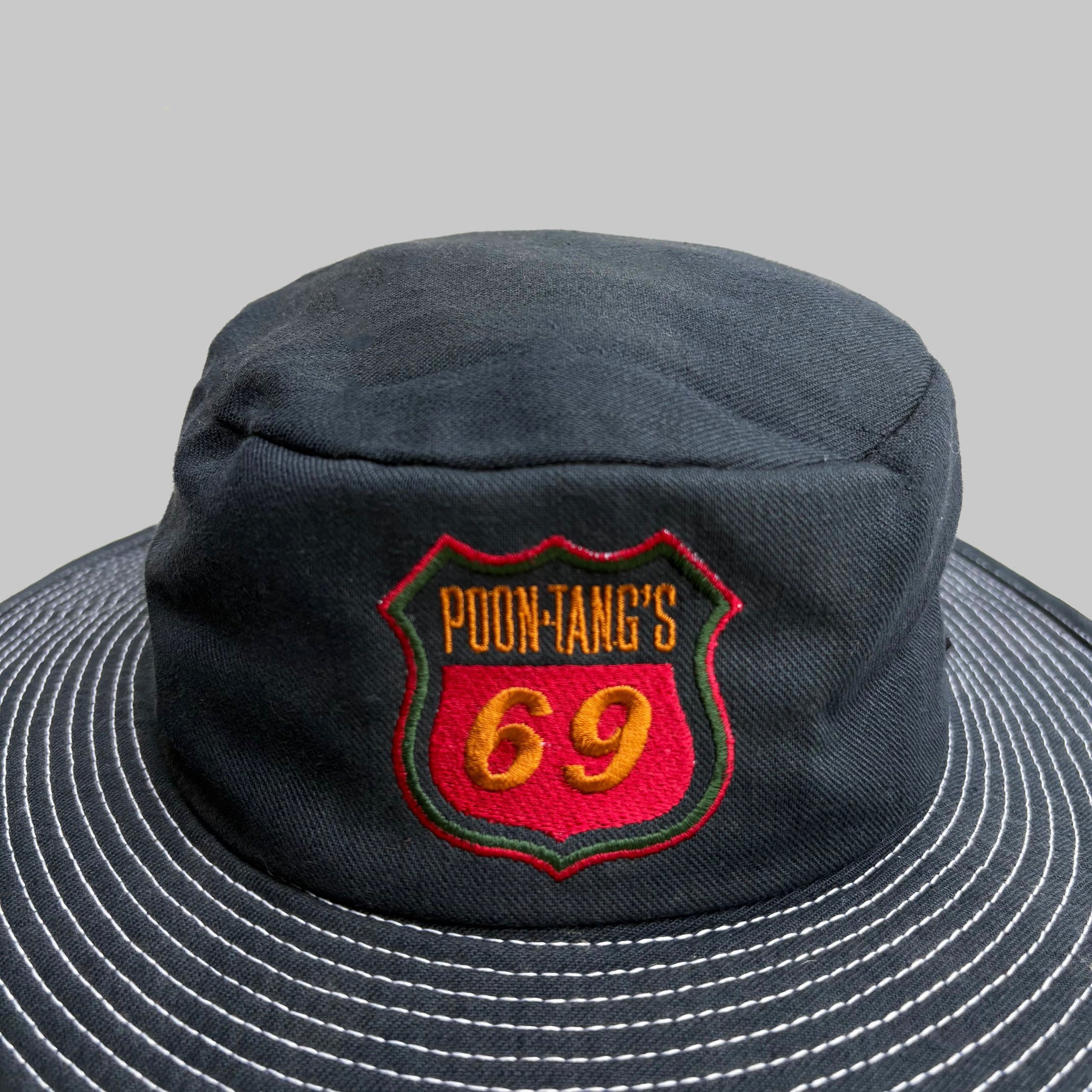 Rare, early 2000 Poon-Tang's 69 streetwear bucket 'boonie' hat, in dark navy/grey cotton with logo graphic embroidered on the front. One size fits all
