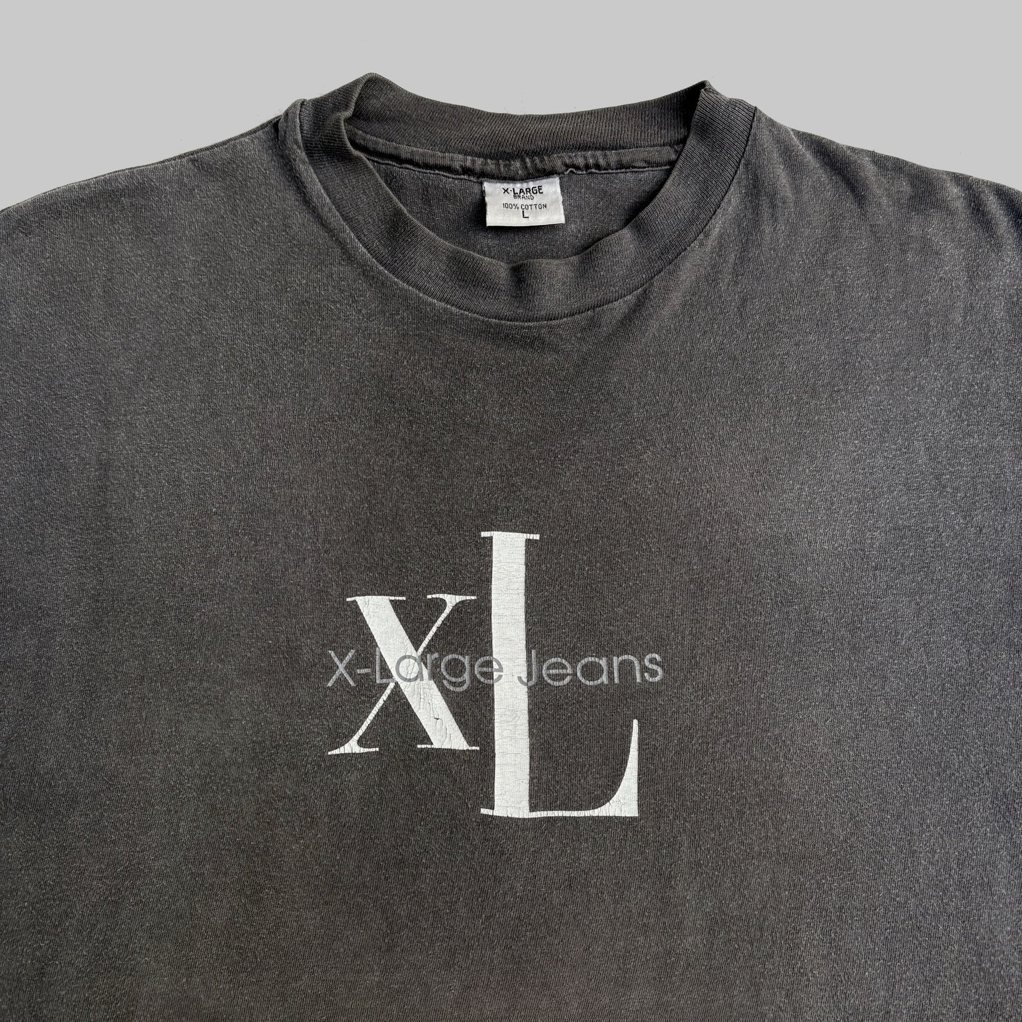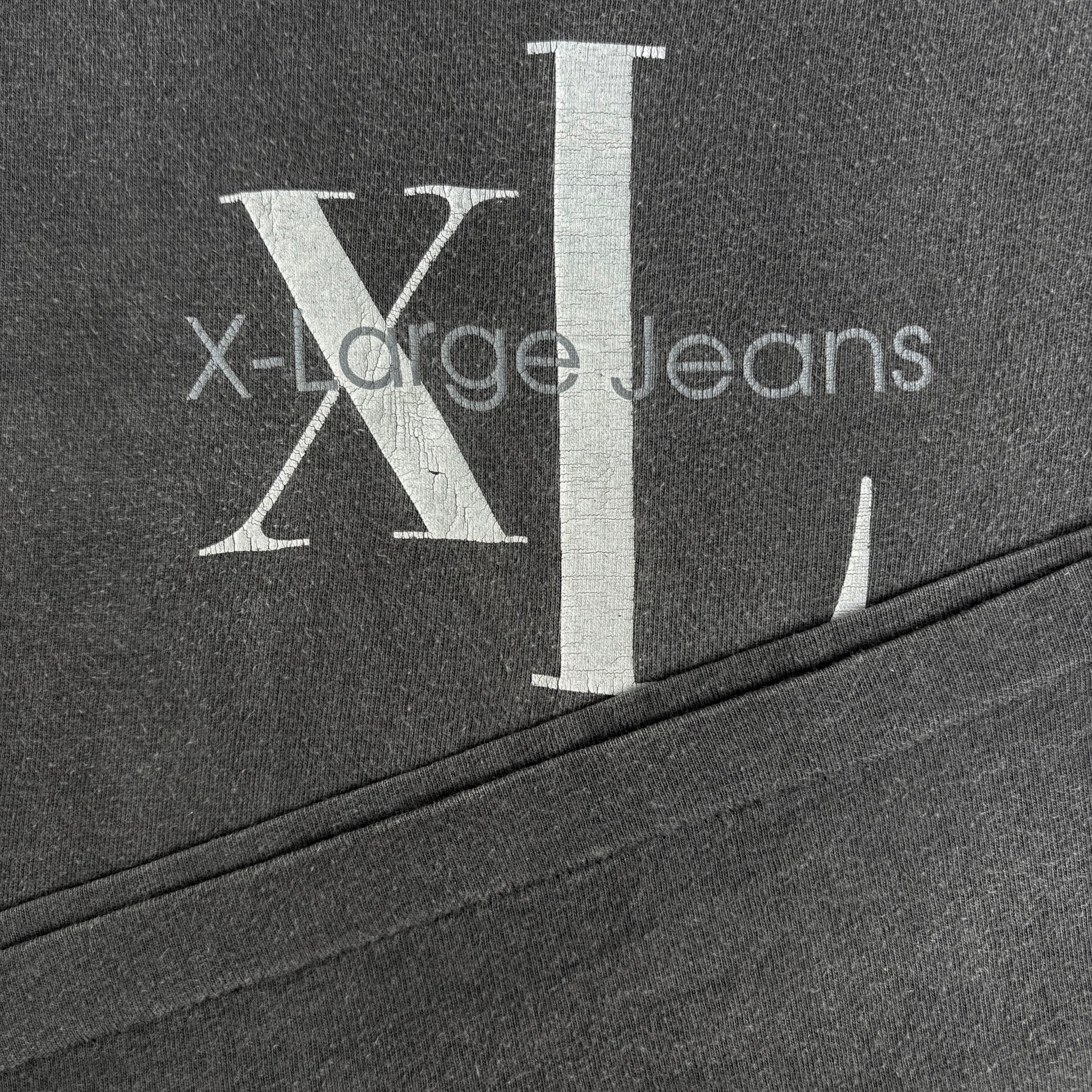 Very rare 1990's X-Large Brand 'X-Large Jeans' vintage t-shirt, in gently faded black single stitched cotton with Calvin Klein inspired graphic logo printed on the chest. Made in USA